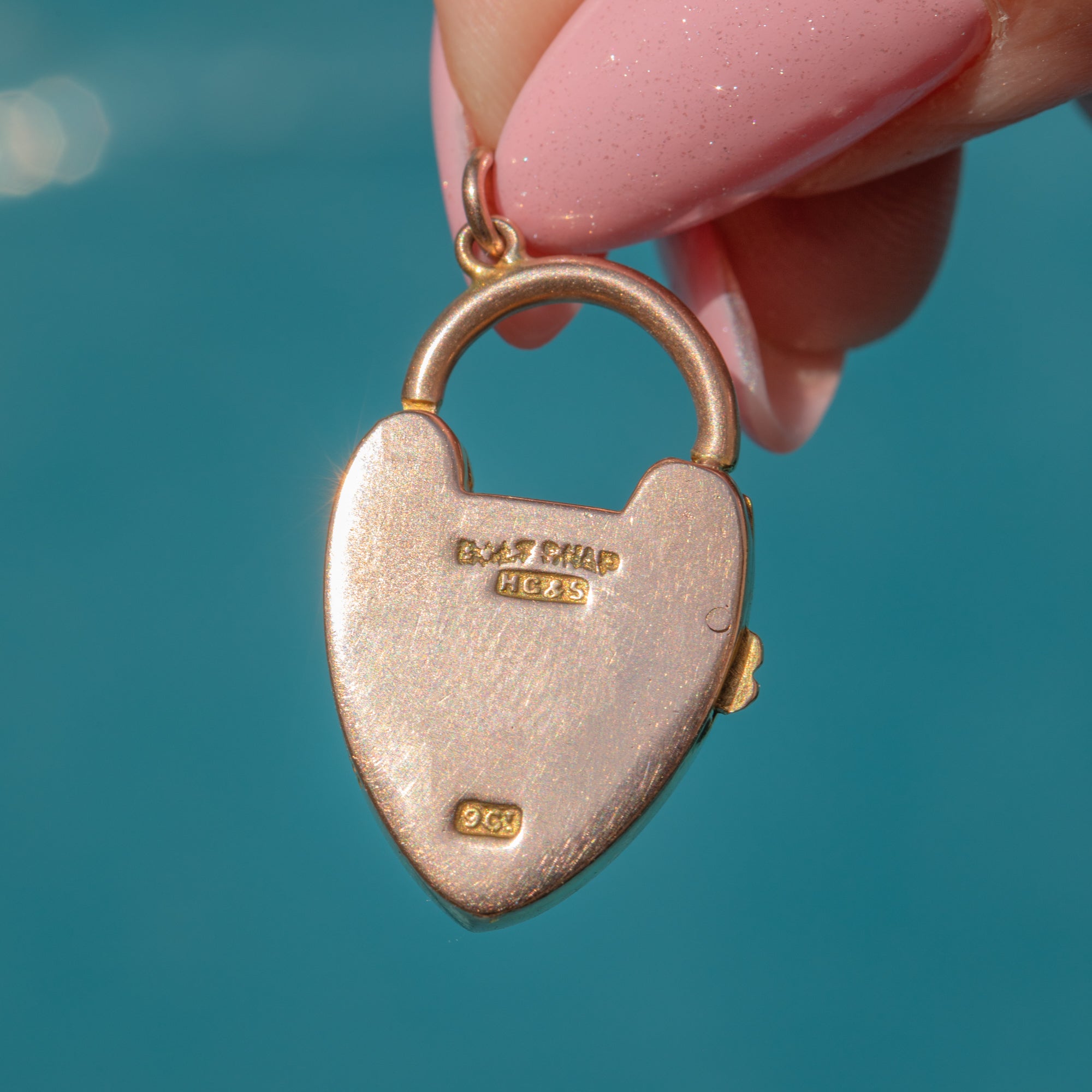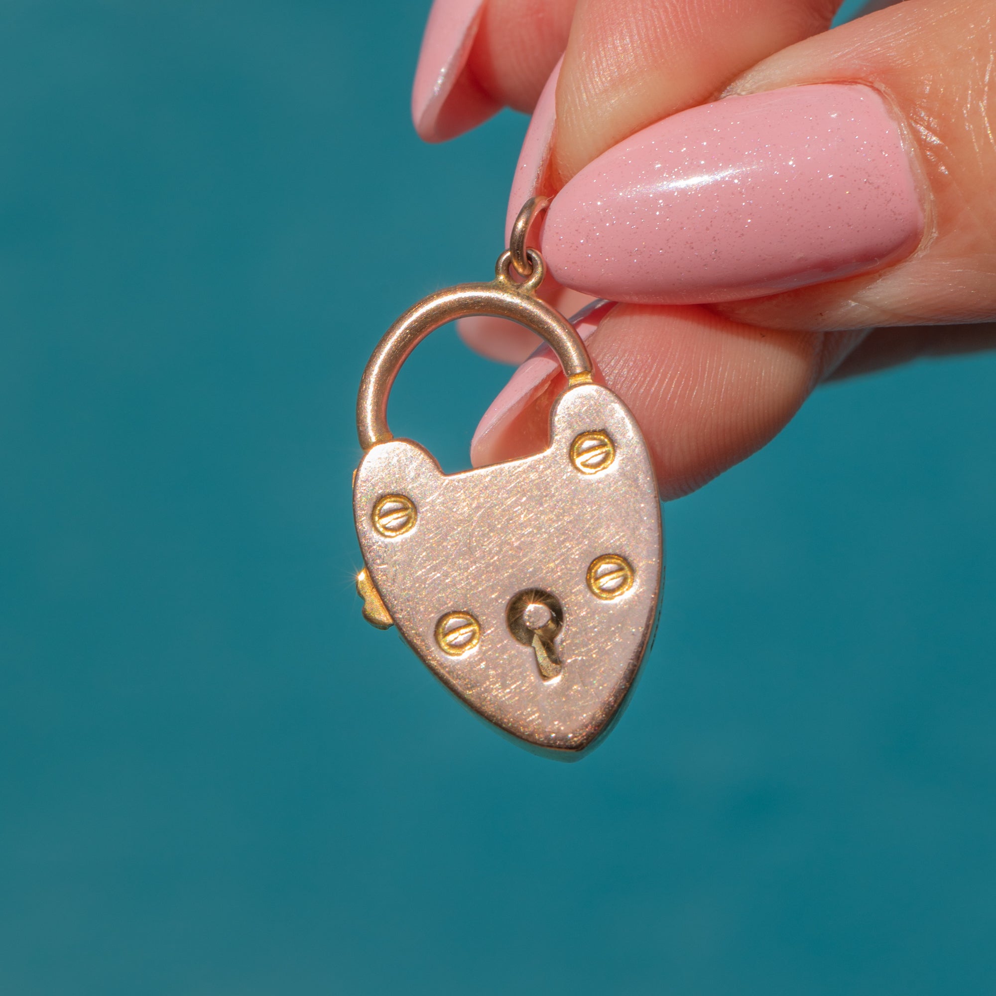 VERY GOOD: This large antique 9ct Gold heart padlock pendant is in very good condition. The bright 9ct Gold shows mild wear consistent with age but retains her lovely sheen. The lever mechanism is in good working order; to open, simply push down the lip on the side and pull the lever open. To close, push the lip again to secure it. A truly charming padlock pendant with plenty of antique appeal!