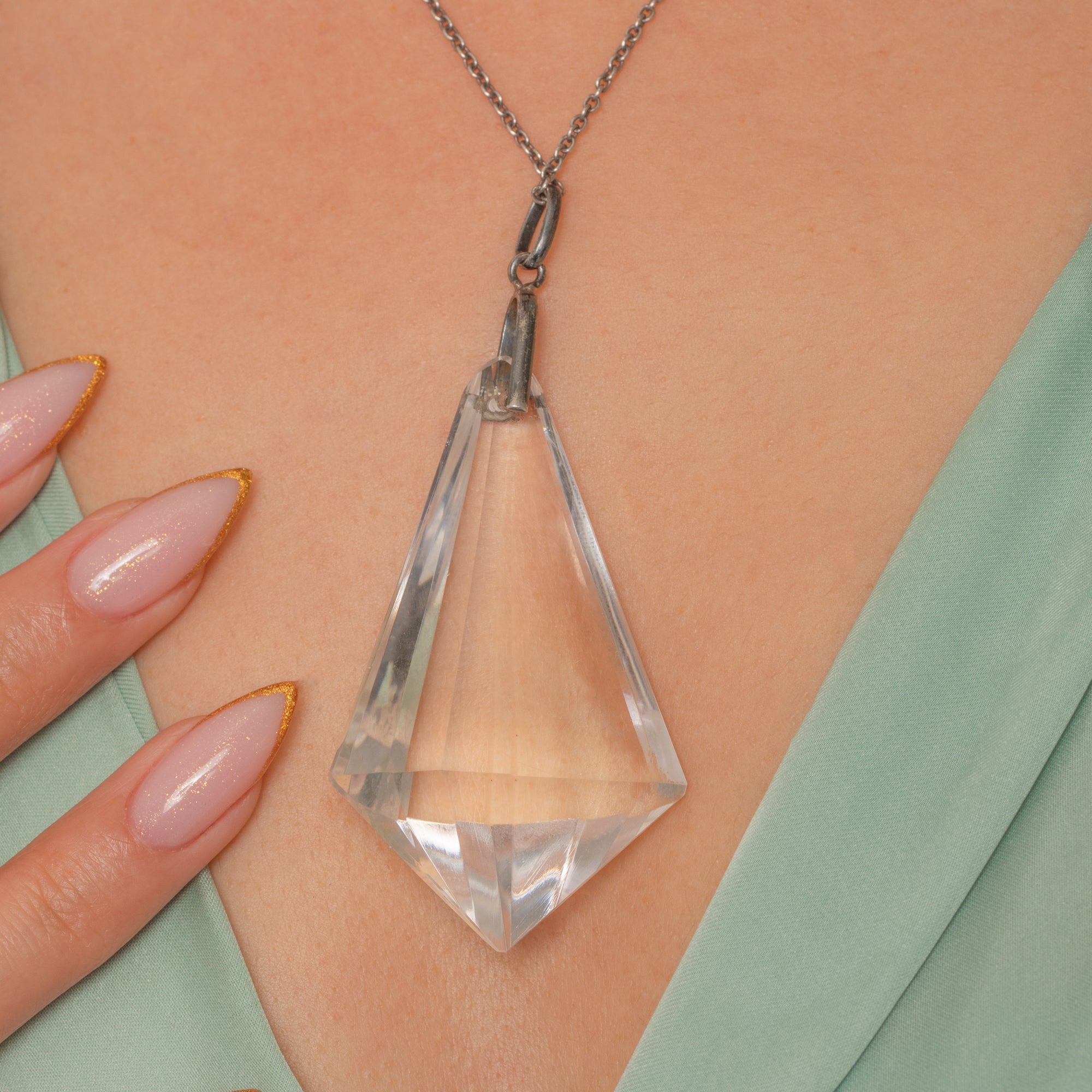 This spectacular Art Deco pendant features a huge 120.00ct Rock Crystal carved into a bold geometric form, enhancing the natural clarity and brilliance of the stone. Substantial and eye-catching, the clean lines and faceted surfaces capture light beautifully, giving the Crystal an almost liquid radiance.