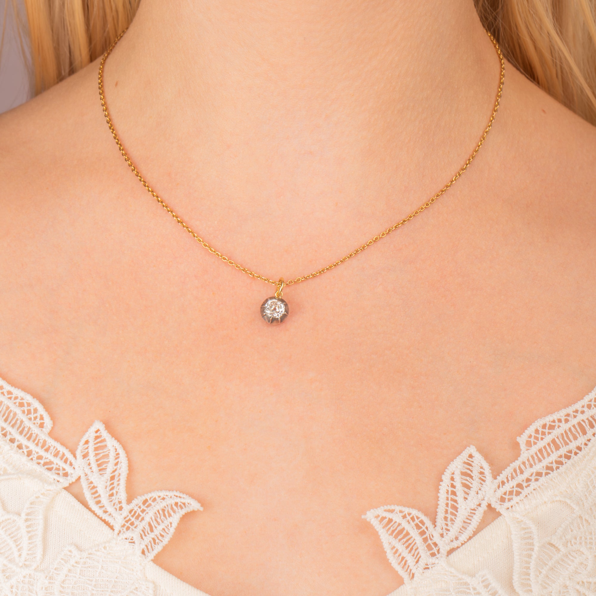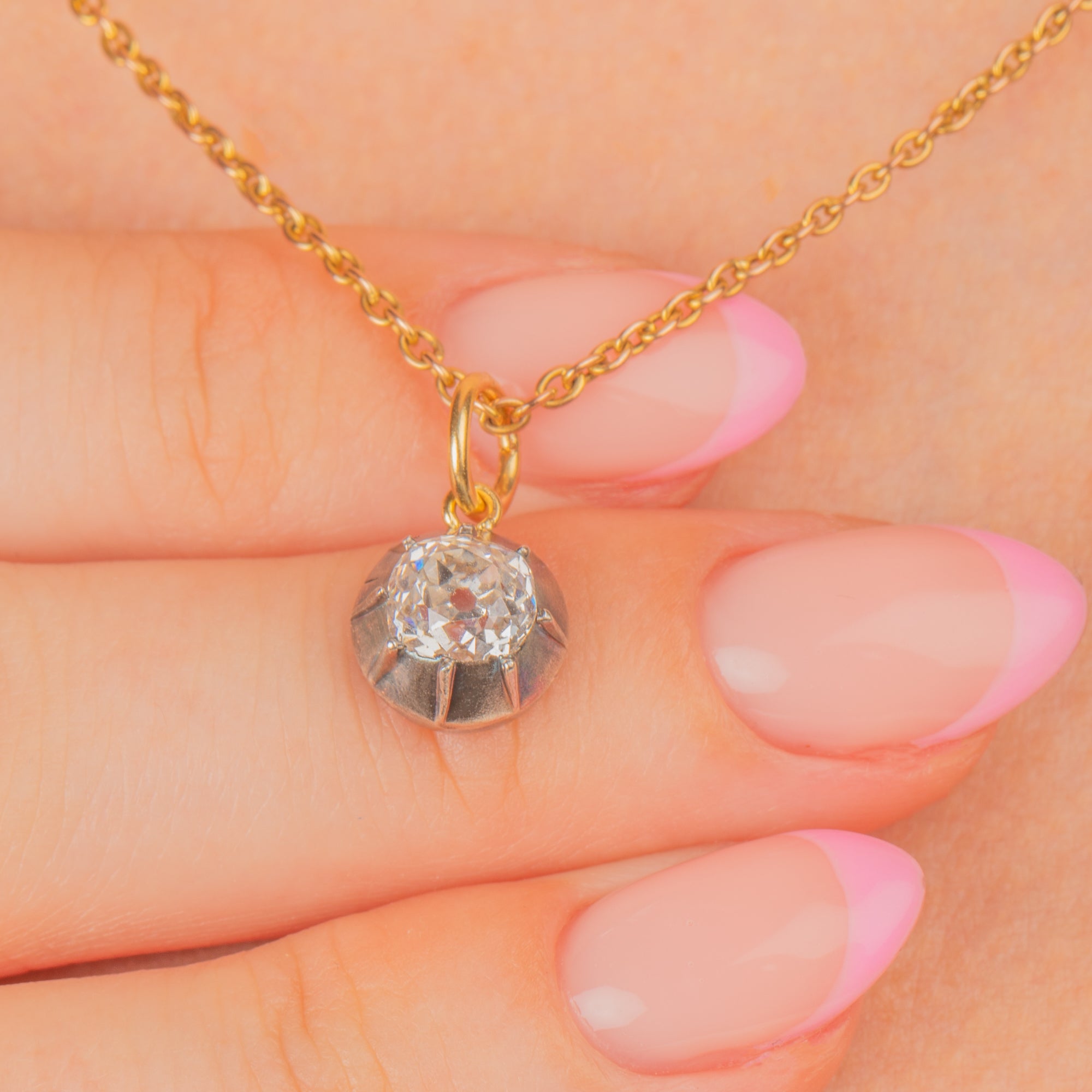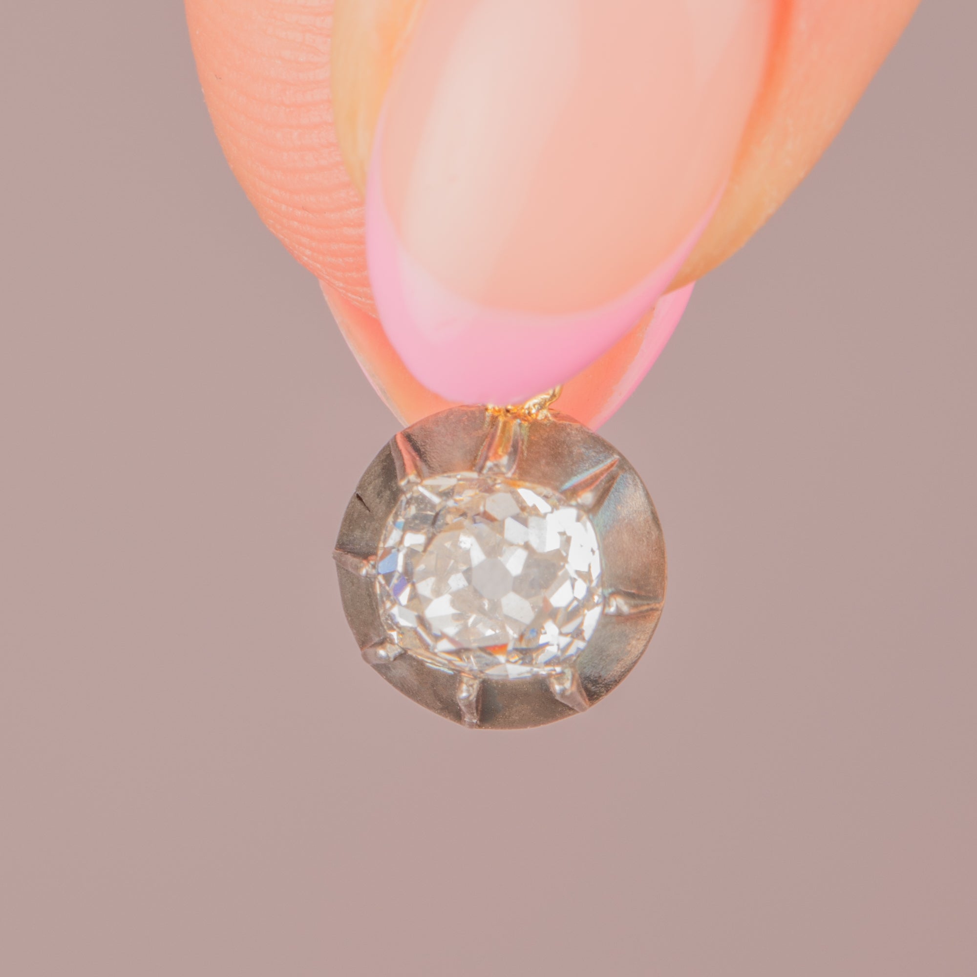 EXCELLENT. This large Georgian old-mine-cut Diamond charm is in gorgeous condition. The Diamond is H colour and has Si clarity, and has crisp facets that catch the light magnificently. The settings have accrued a lovely patina creating a dramatic contrast against the crisp Diamond, adding to her antique charm. There is one small mark on the back of the pendant, but this cannot be seen while the pendant is worn and does not impact the integrity of the piece. Complete with a generously sized jump ring, you can suspend this scintillating Georgian treasure from a chain of your choice with ease!