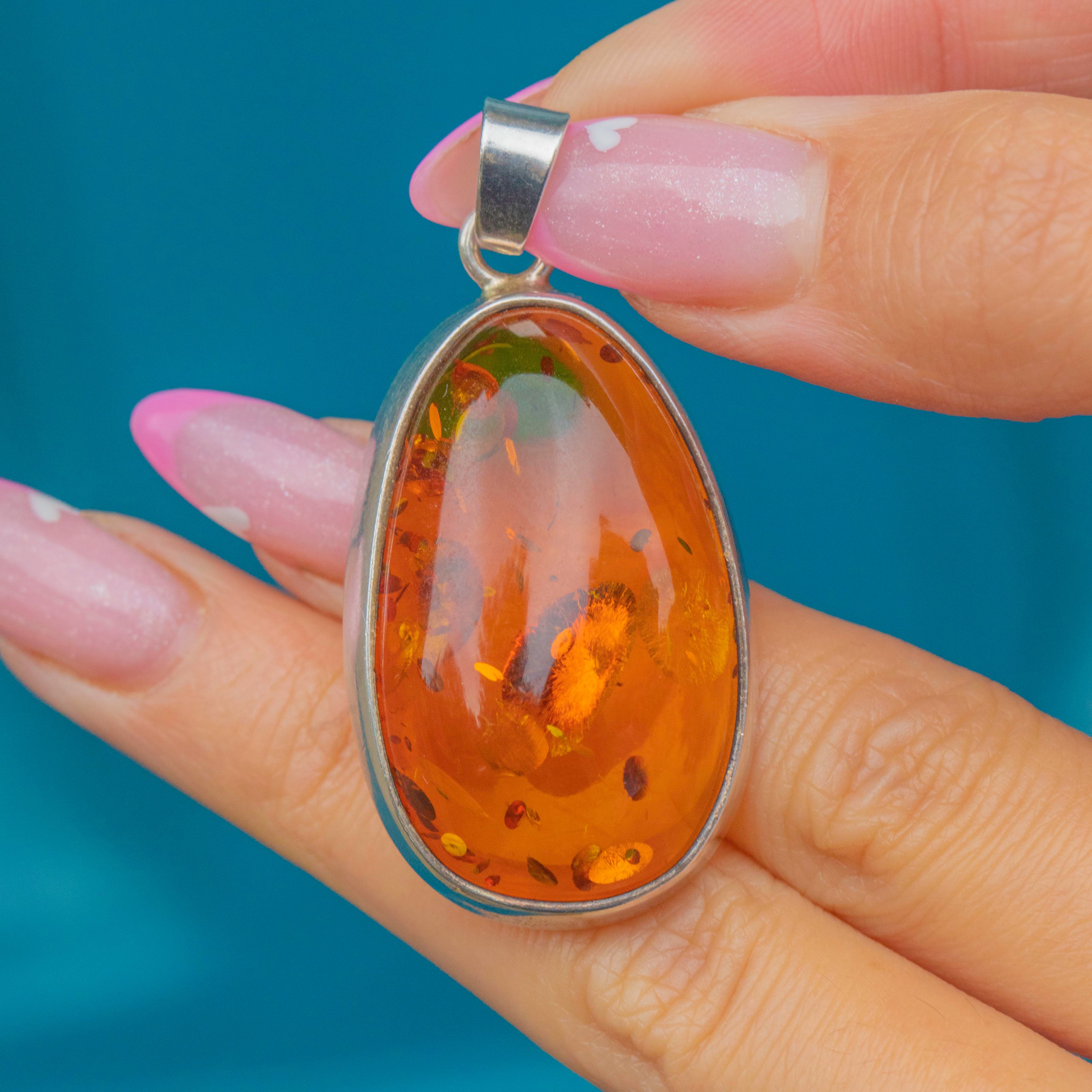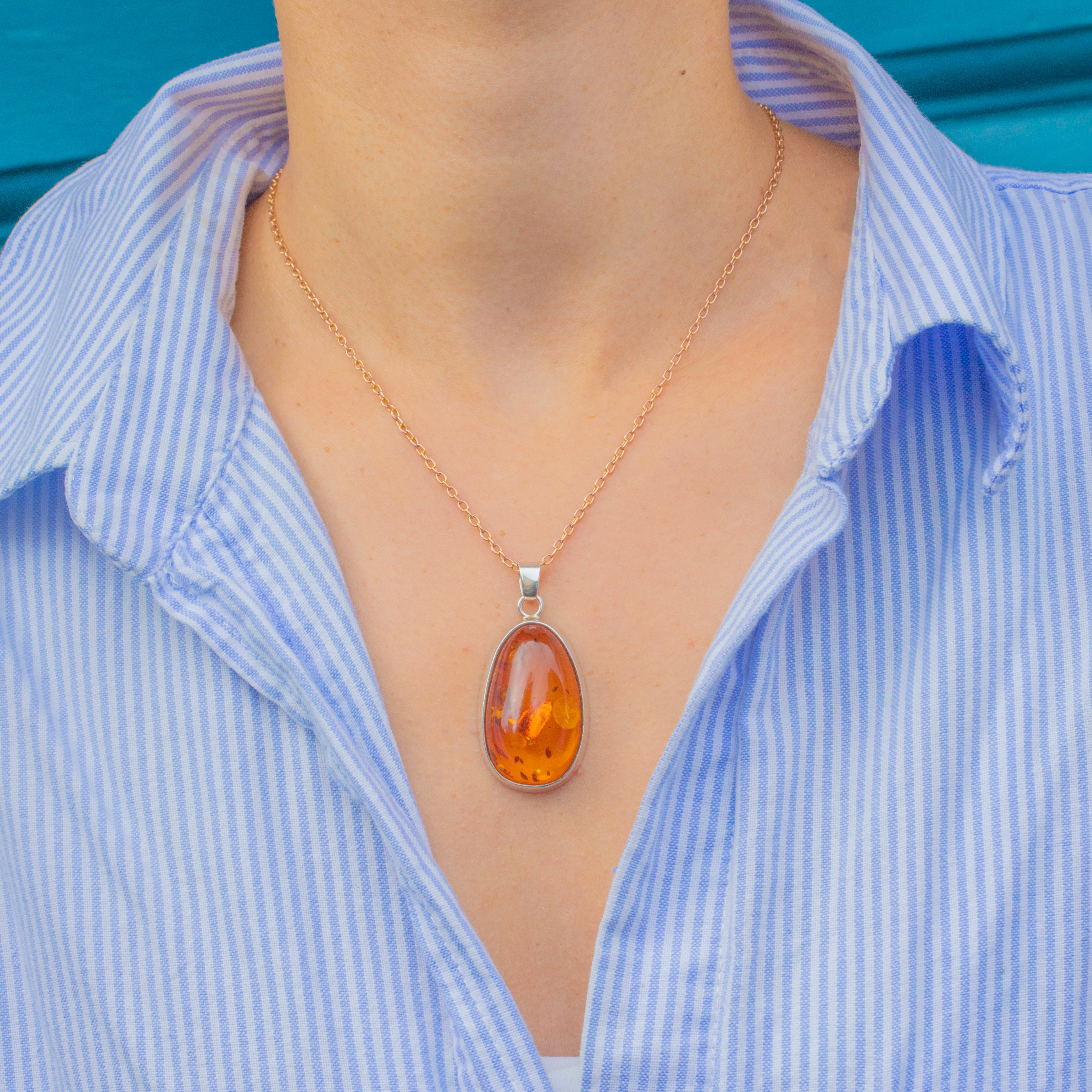 This striking pendant showcases a large piece of natural Baltic Amber, beautifully flecked with golden inclusions that catch the light from every angle. The stone’s organic warmth contrasts perfectly with its cool Sterling Silver setting, creating a statement piece full of natural charm.