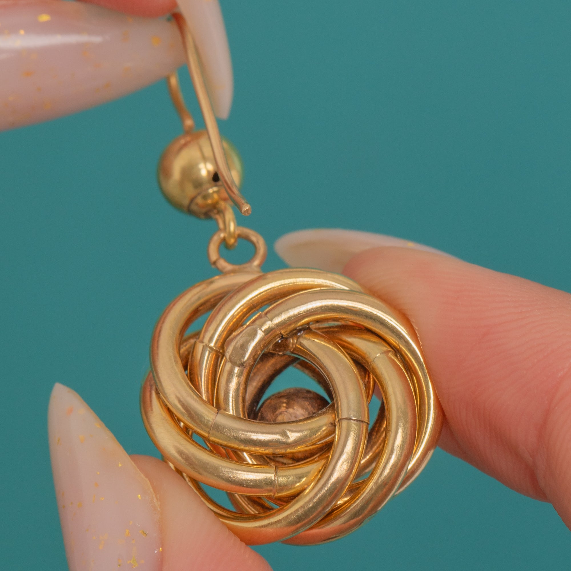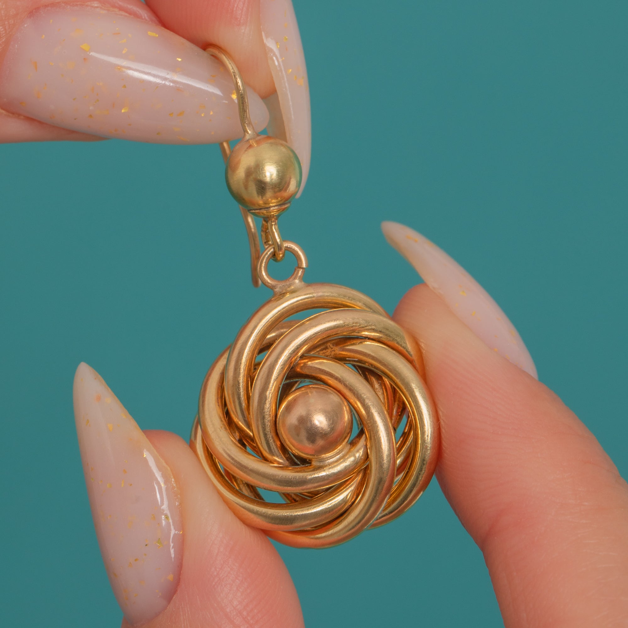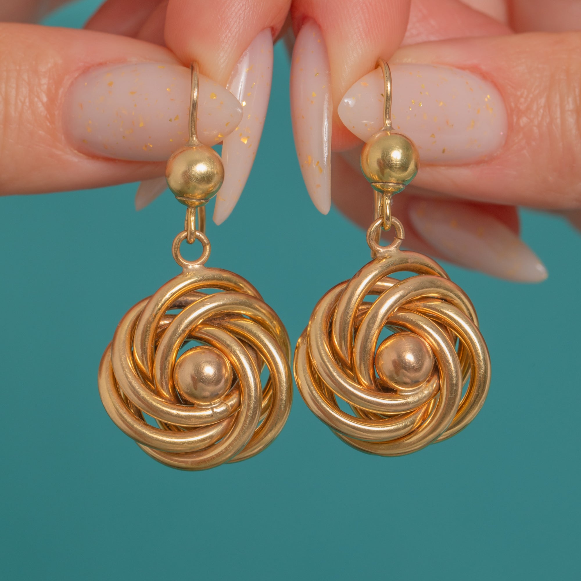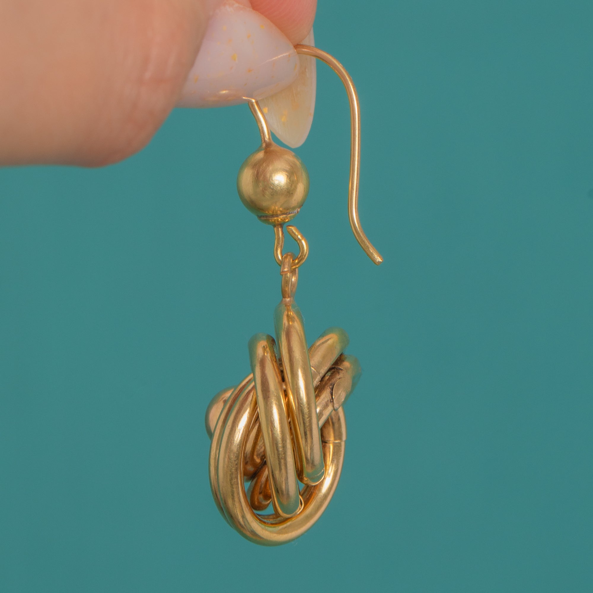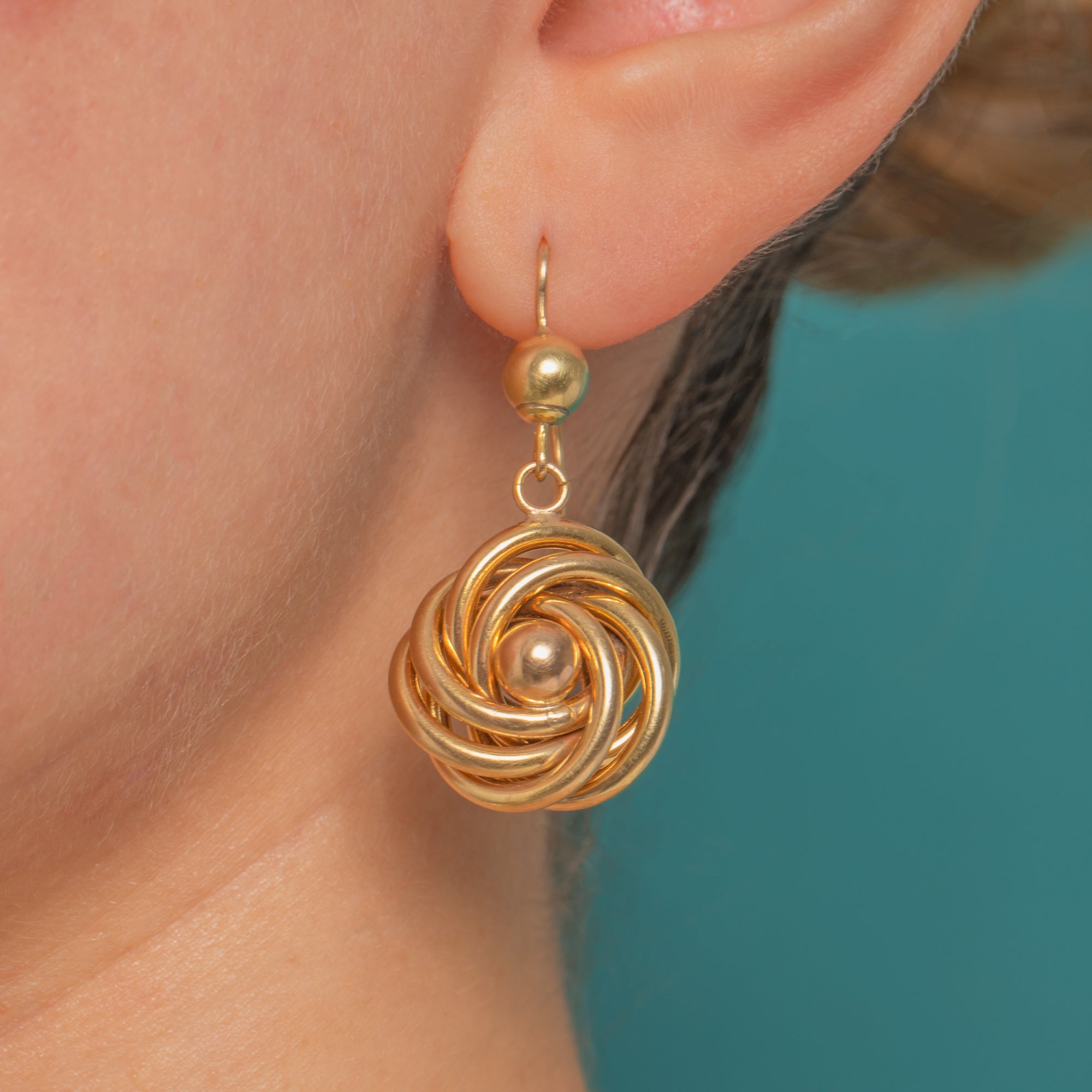 Sculptural and romantic, these large Victorian 9ct Gold drop earrings entwine into a classic lover’s knot. The interlaced tubular rosettes glow with a rich, high polish and are centred by a smooth Gold bead, suspended below a petite ball surmount for elegant movement in the ear.