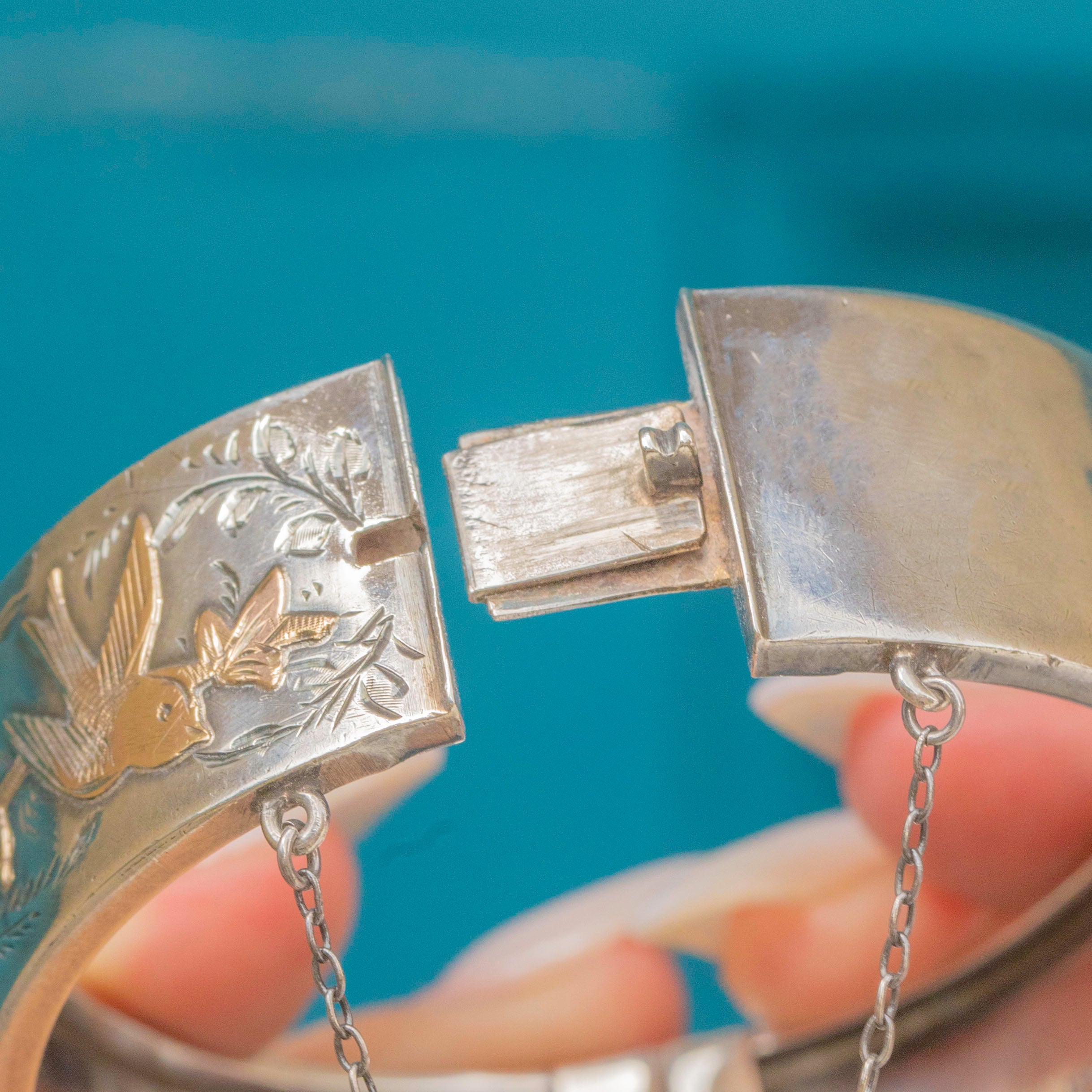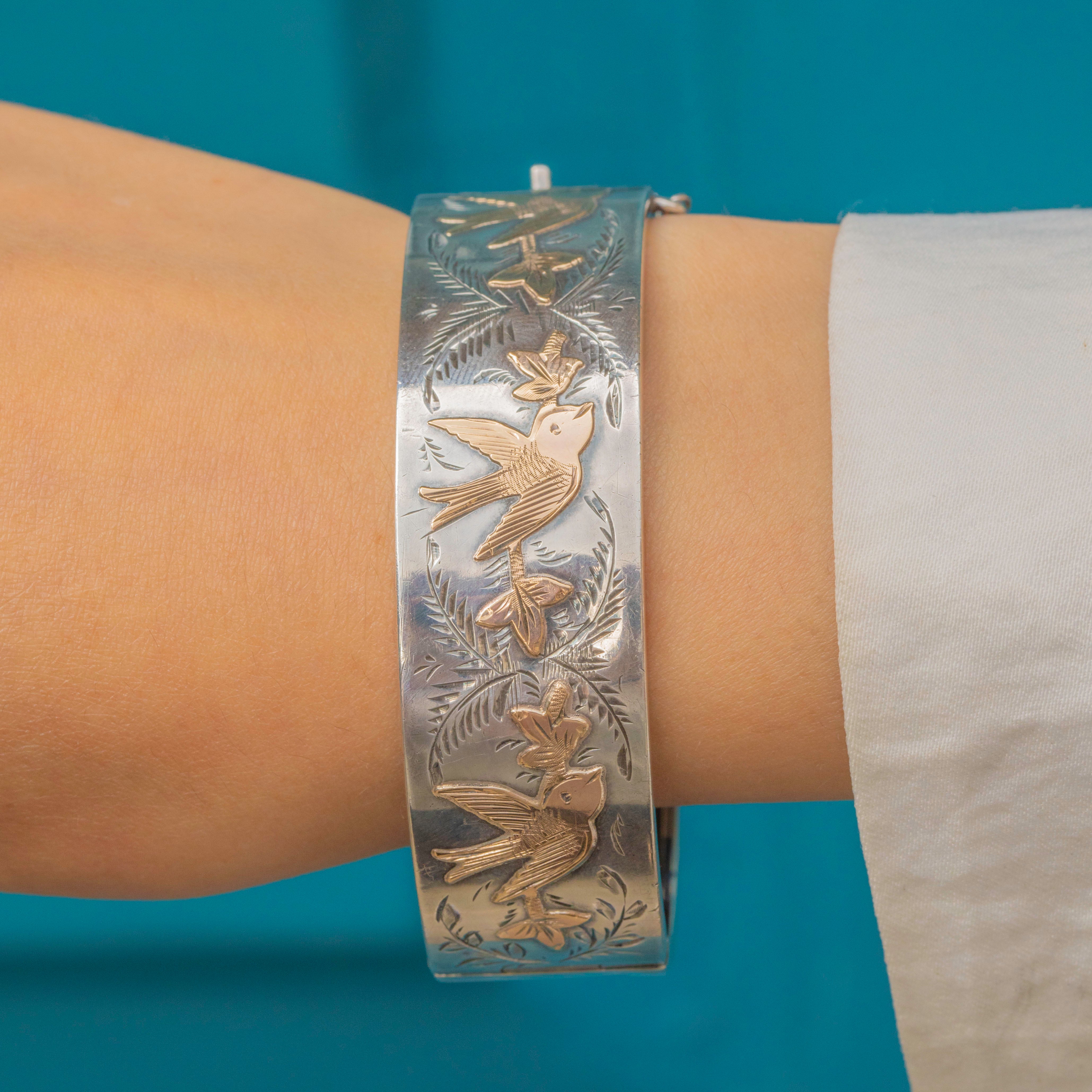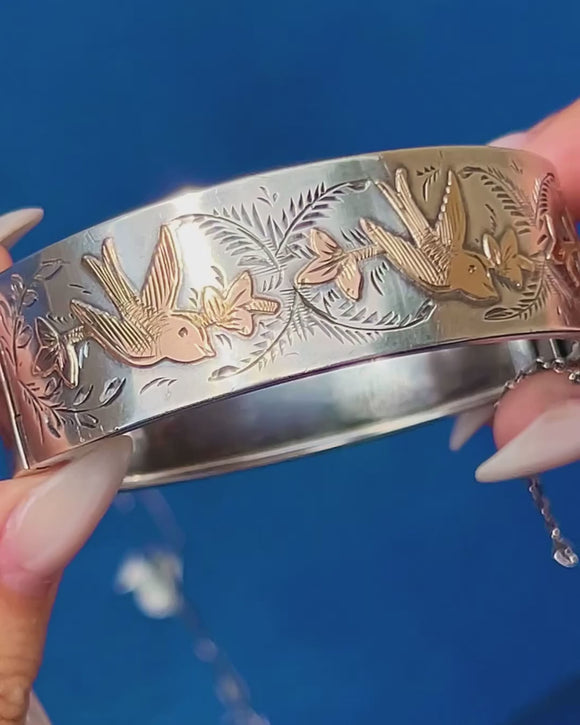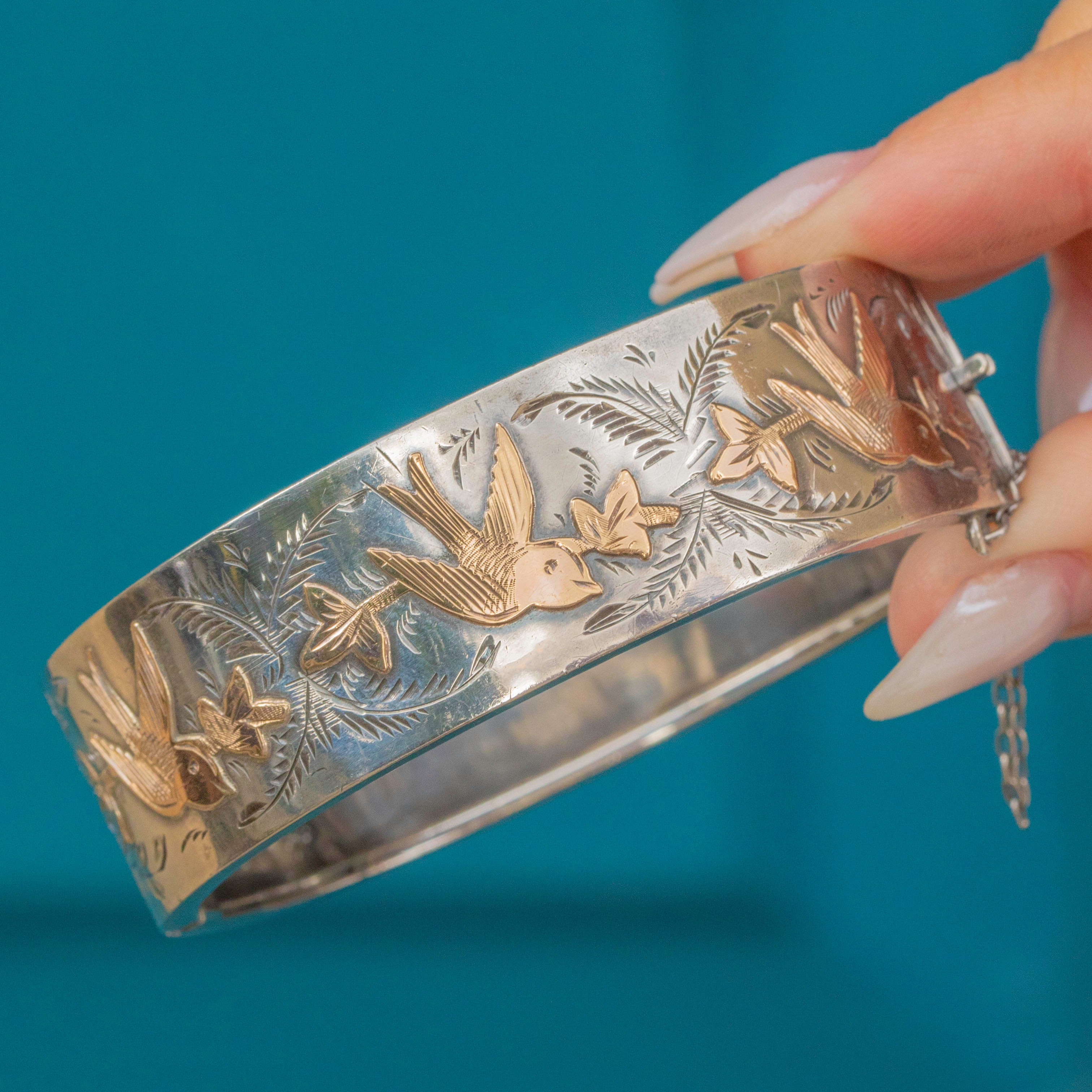 A sweet Victorian inspired mid-century Silver bangle, with 9ct Gold swallow detailing and engravings on its front!