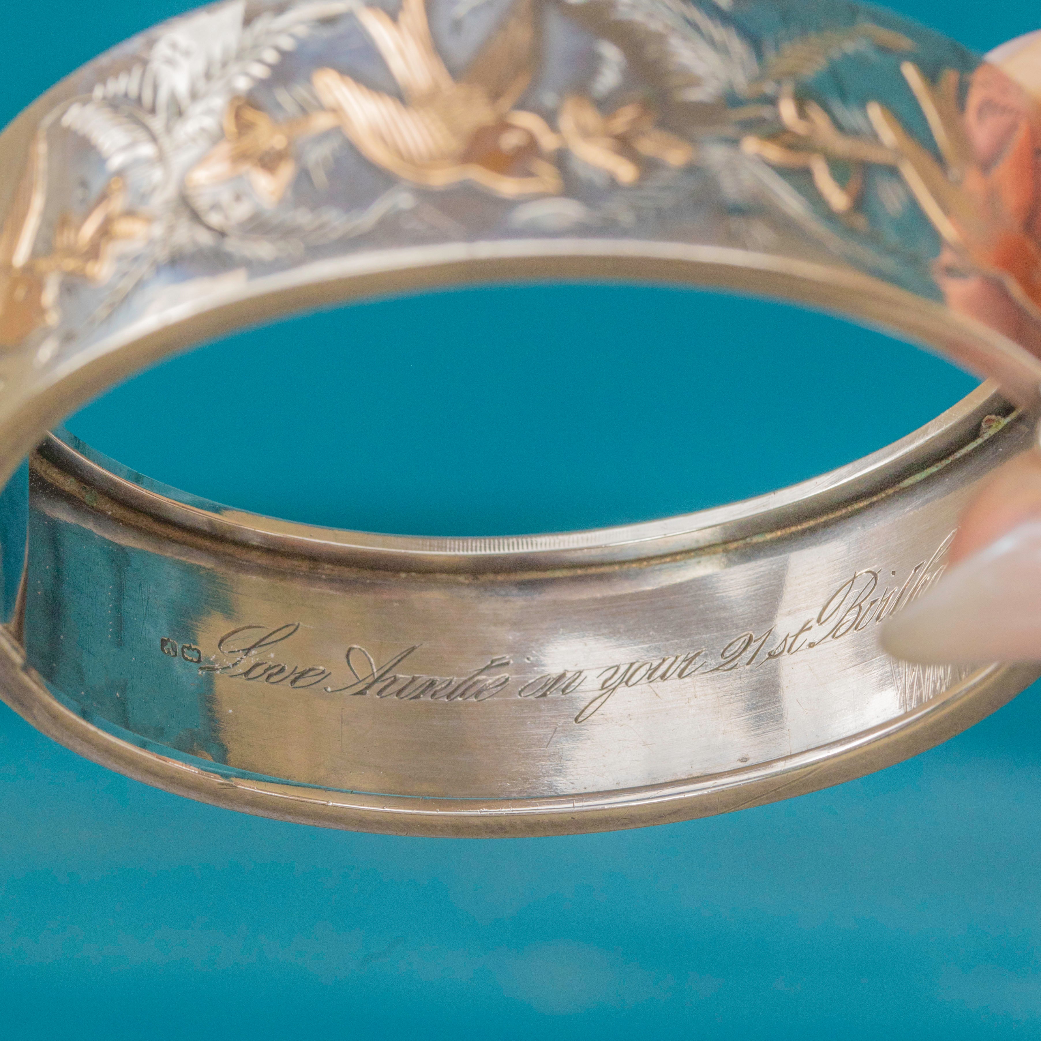 Mid-Century Silver & 9ct Gold Engraved Swallow Bangle