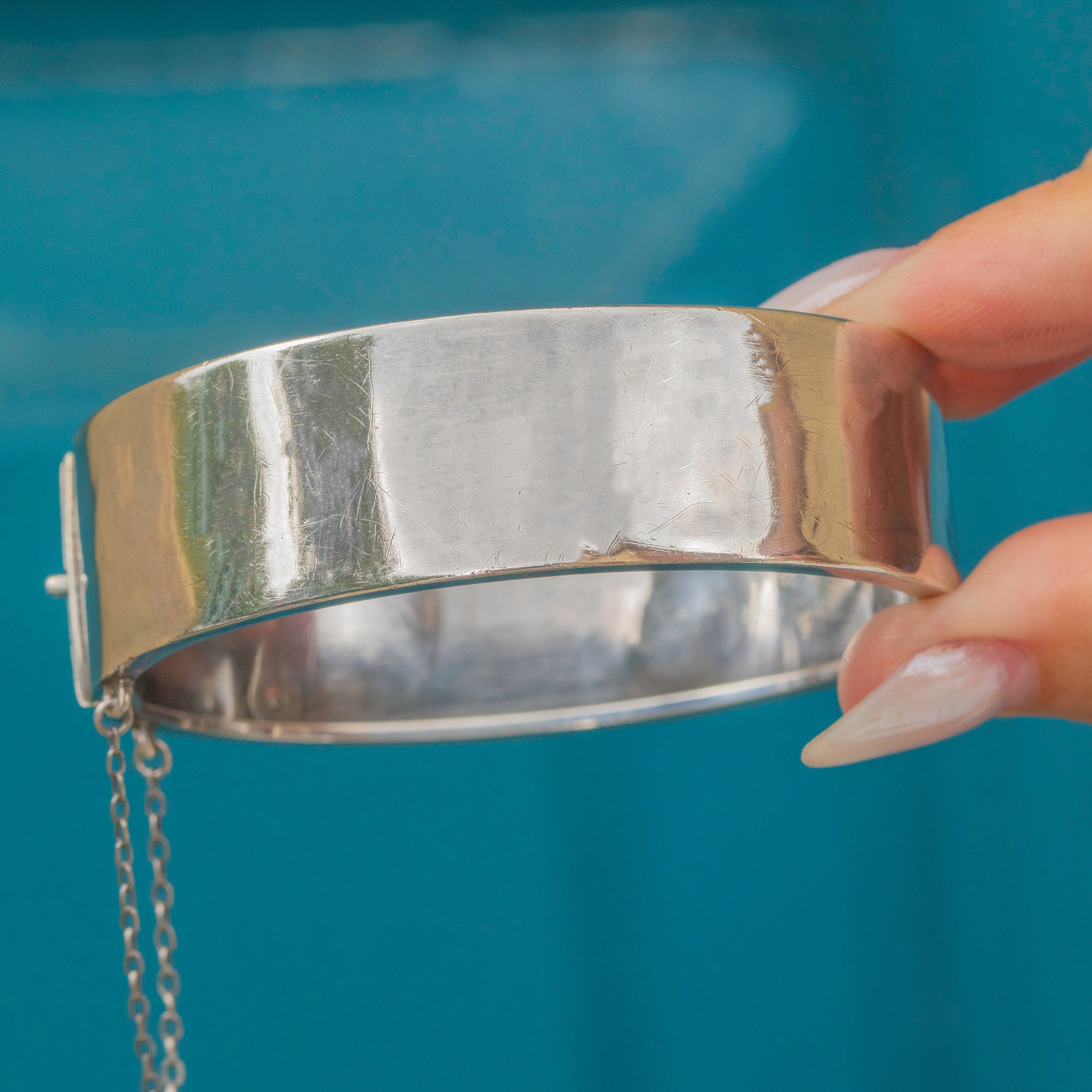 VERY GOOD. The Silver is bright and glossy and the engraved details remain defined. There are some dings and light surface wear on the back of the bangle, but this isn't obvious when you wear it. The bangle has a full set of hallmarks and closes securely.