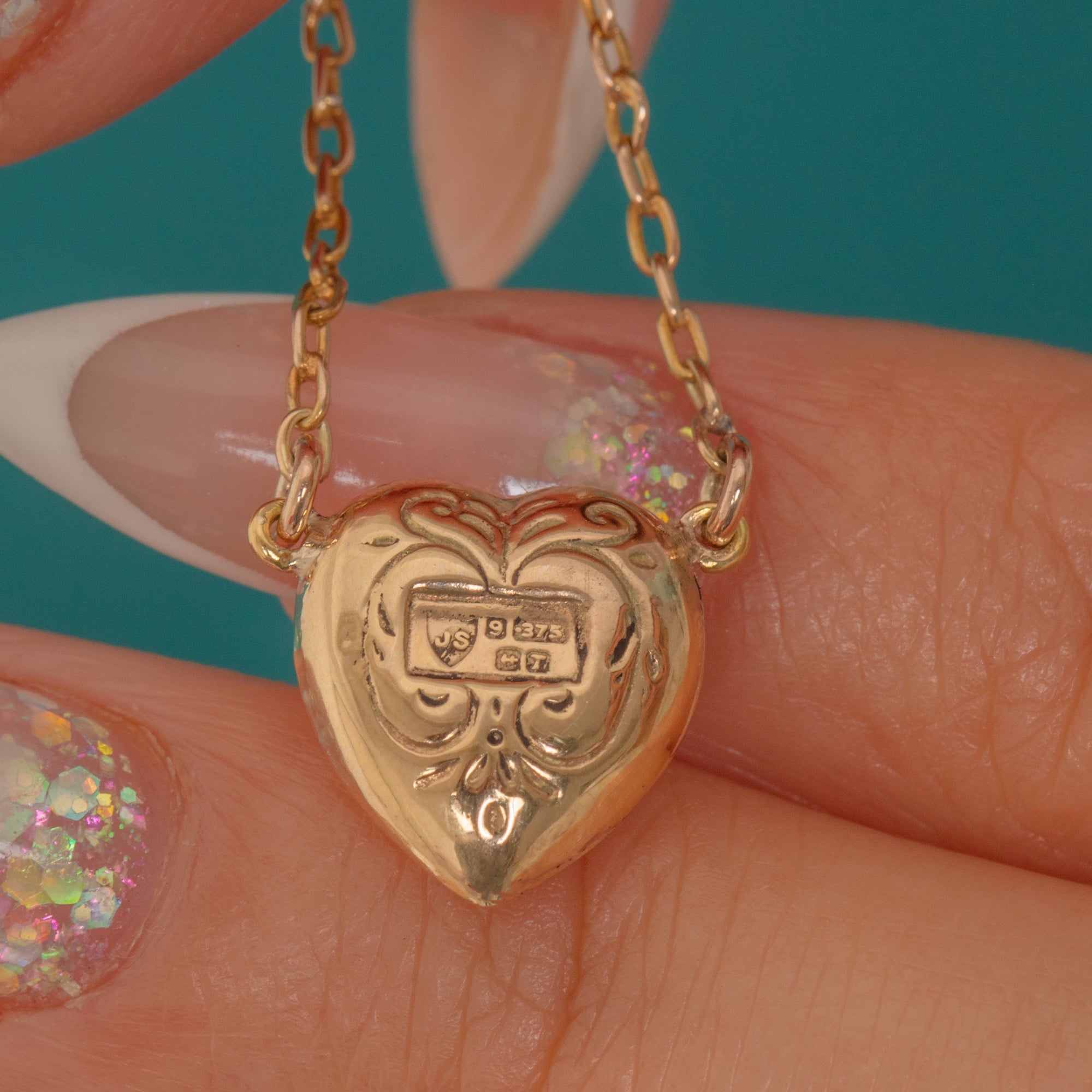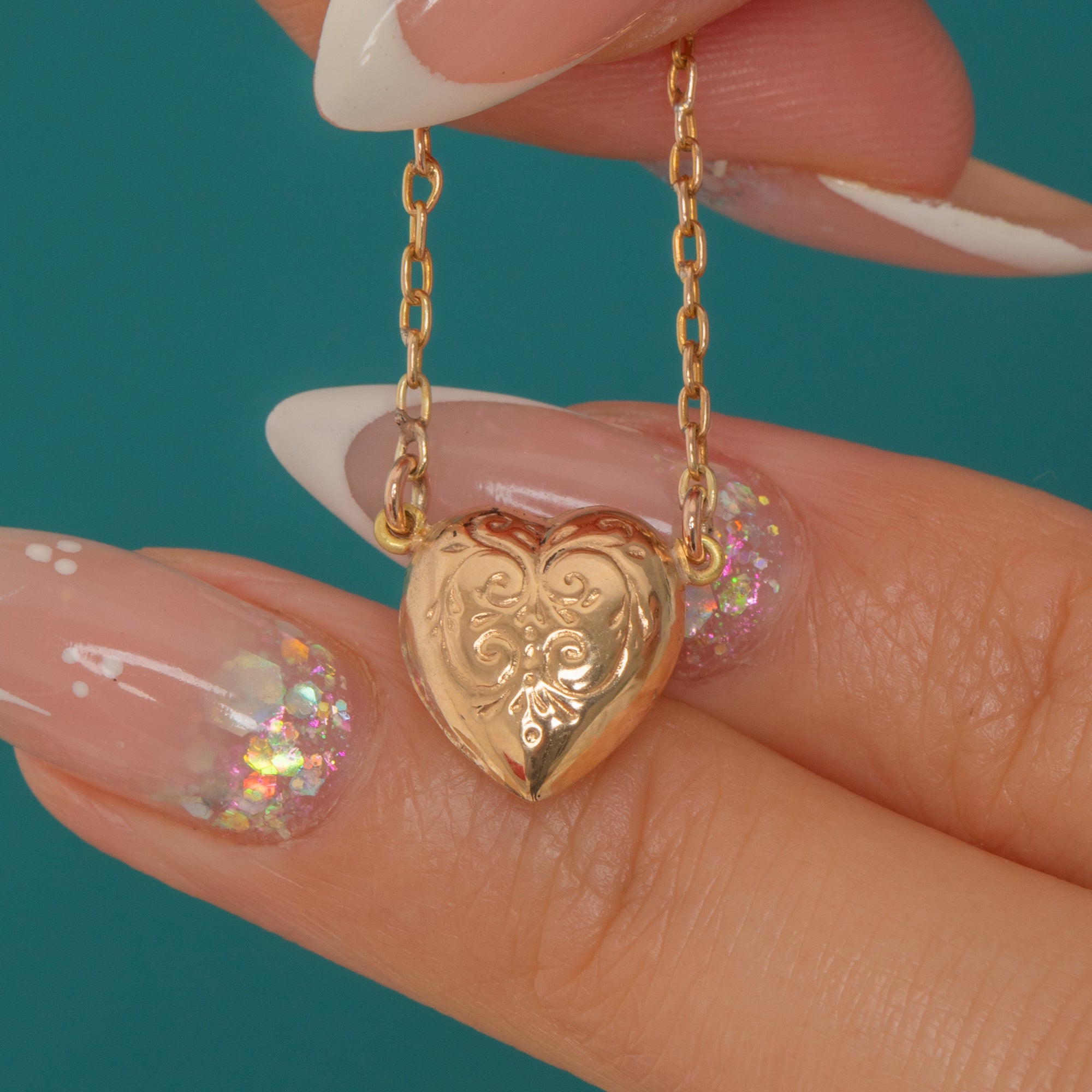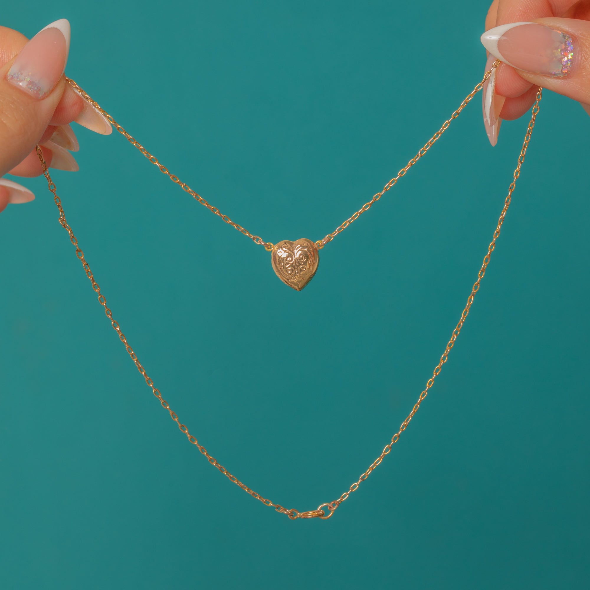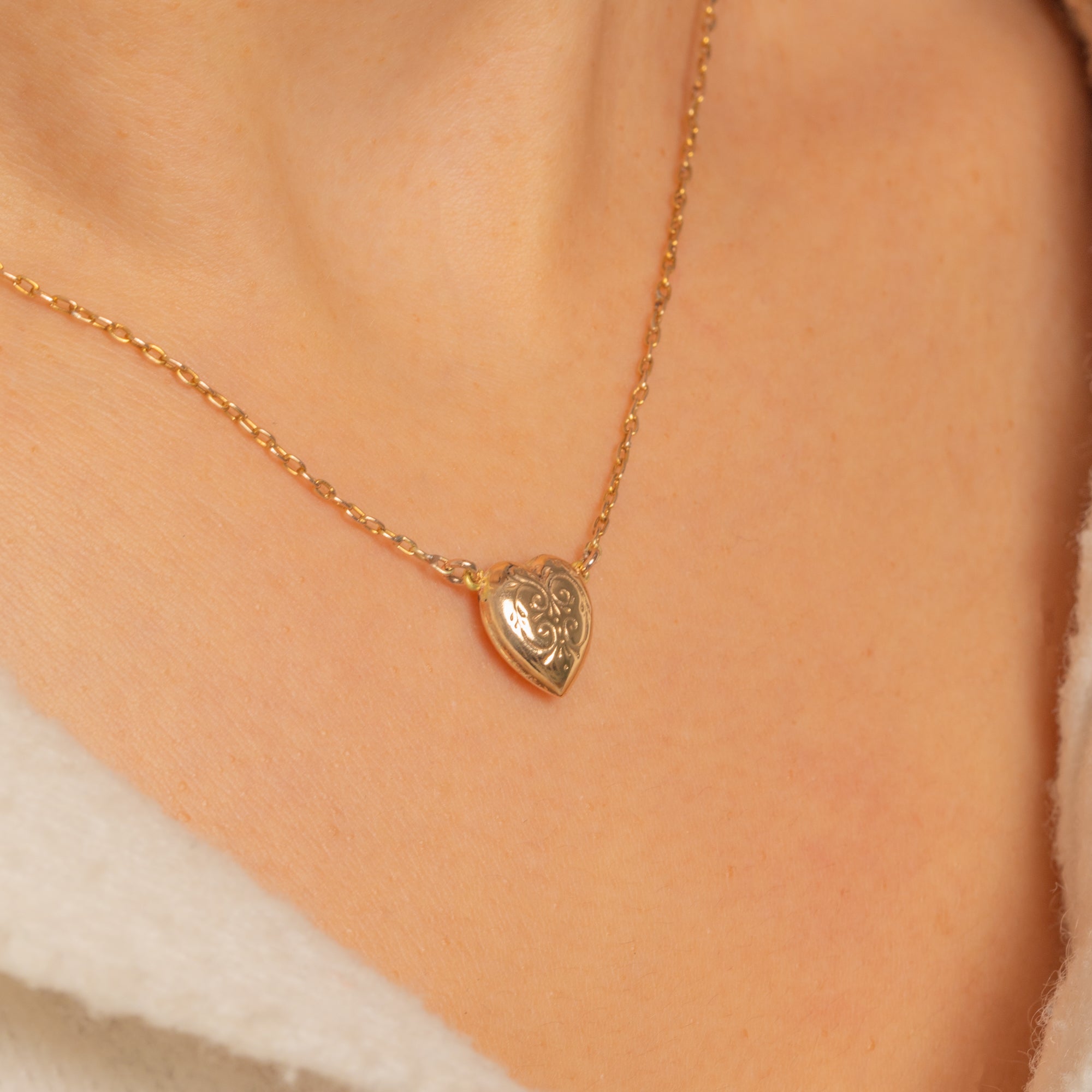 A dainty Vintage 9ct Gold necklace with a beautifully puffed heart charm, crisply engraved with symmetrical foliate scrolls and framed by a smooth raised border. The heart is secured by twin side hasps as a fixed station on a fine oval-link chain, giving a refined, minimalist look with a romantic twist.