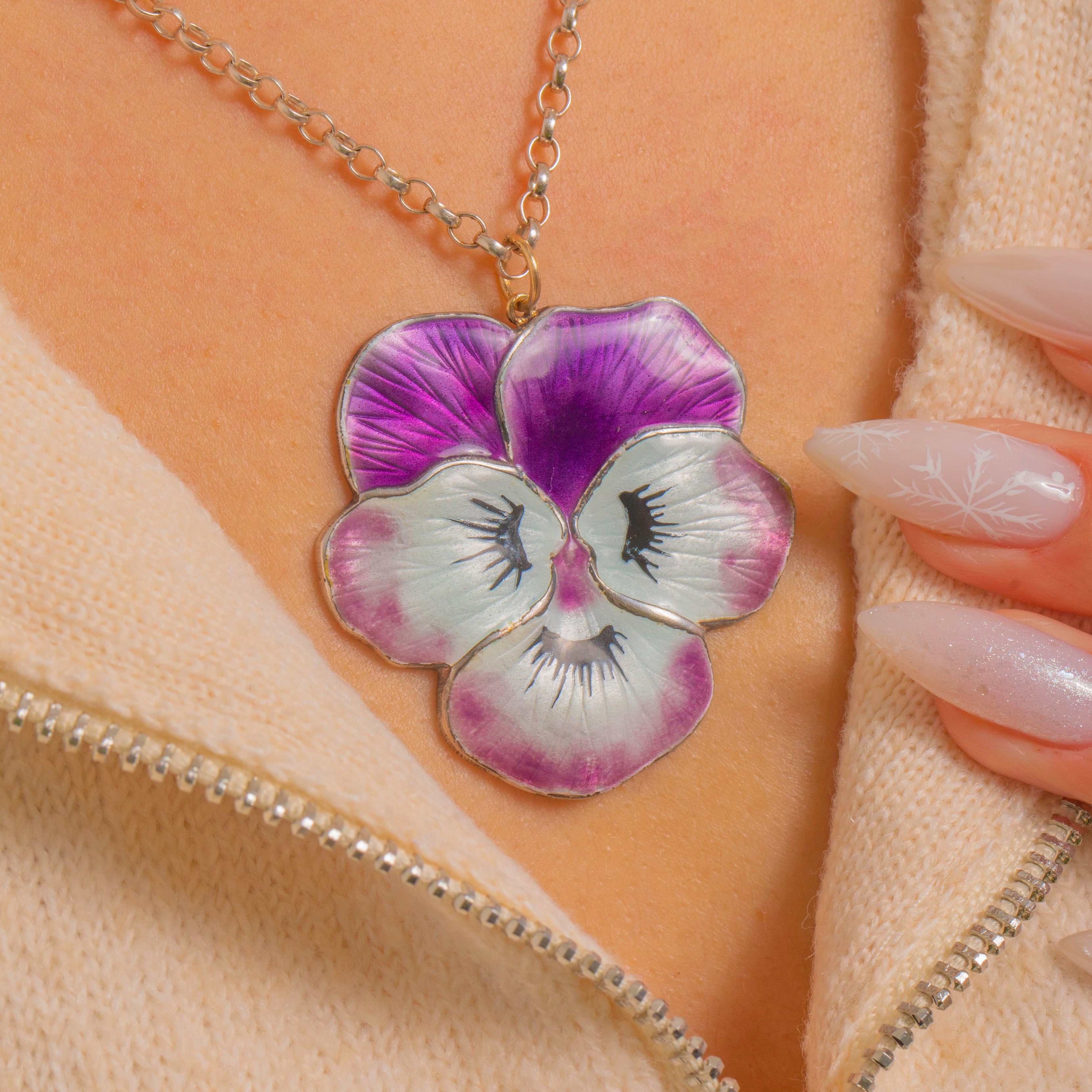 A joyful mid-century take on the beloved pansy, this Vintage Sterling Silver pendant is ablaze with shaded Enamel graduating from deep violet through lilac to white. Delicate black painted details define the petals at the flower’s heart.