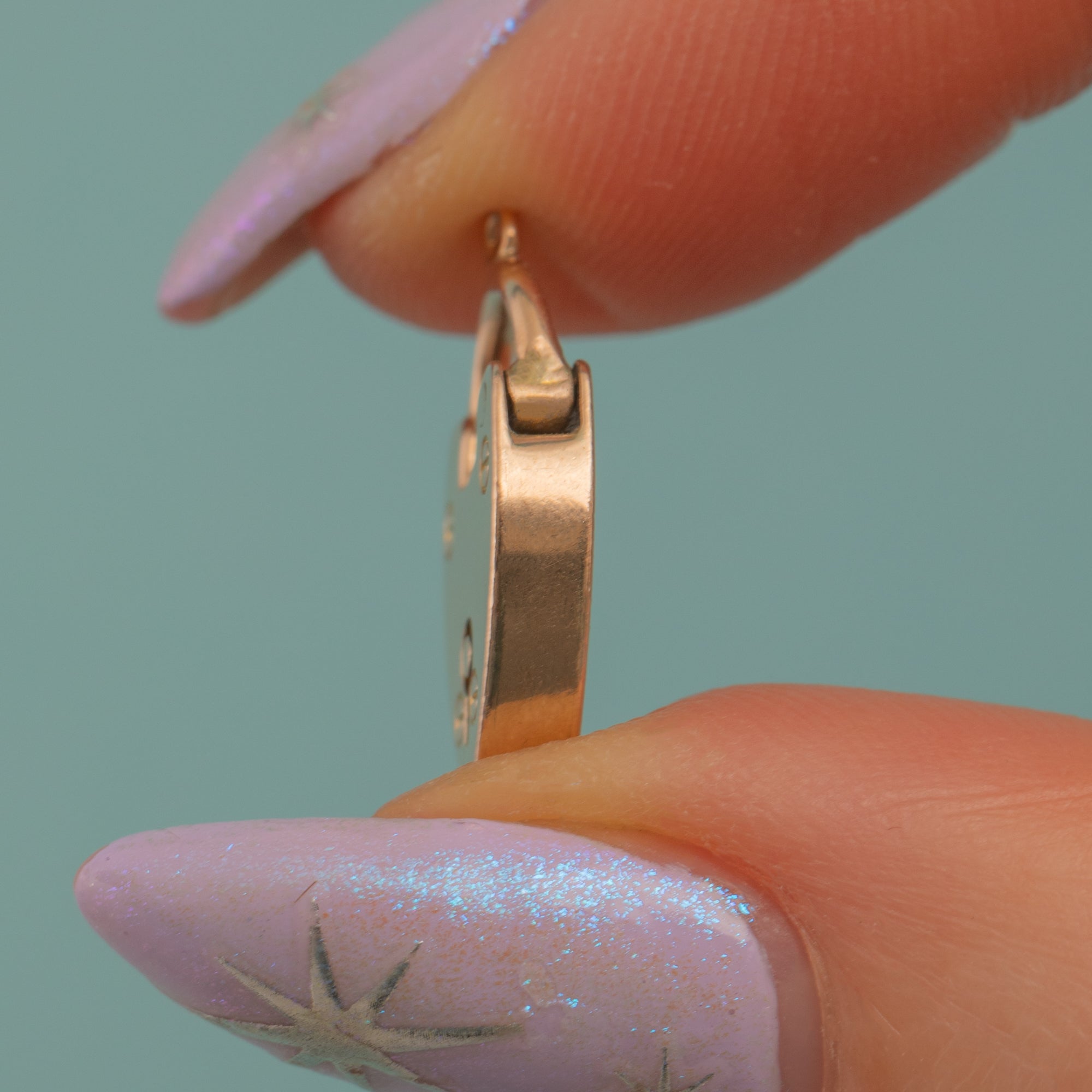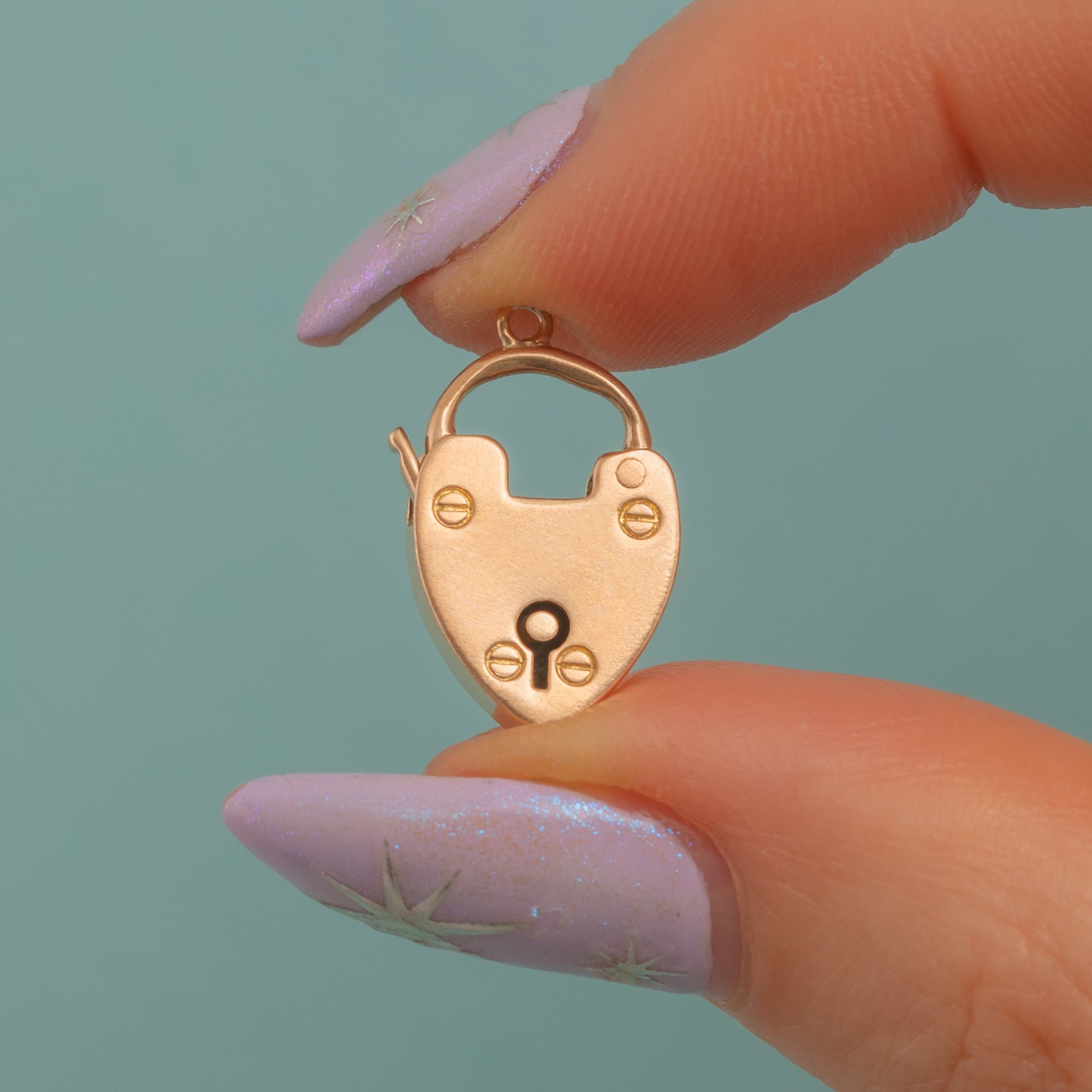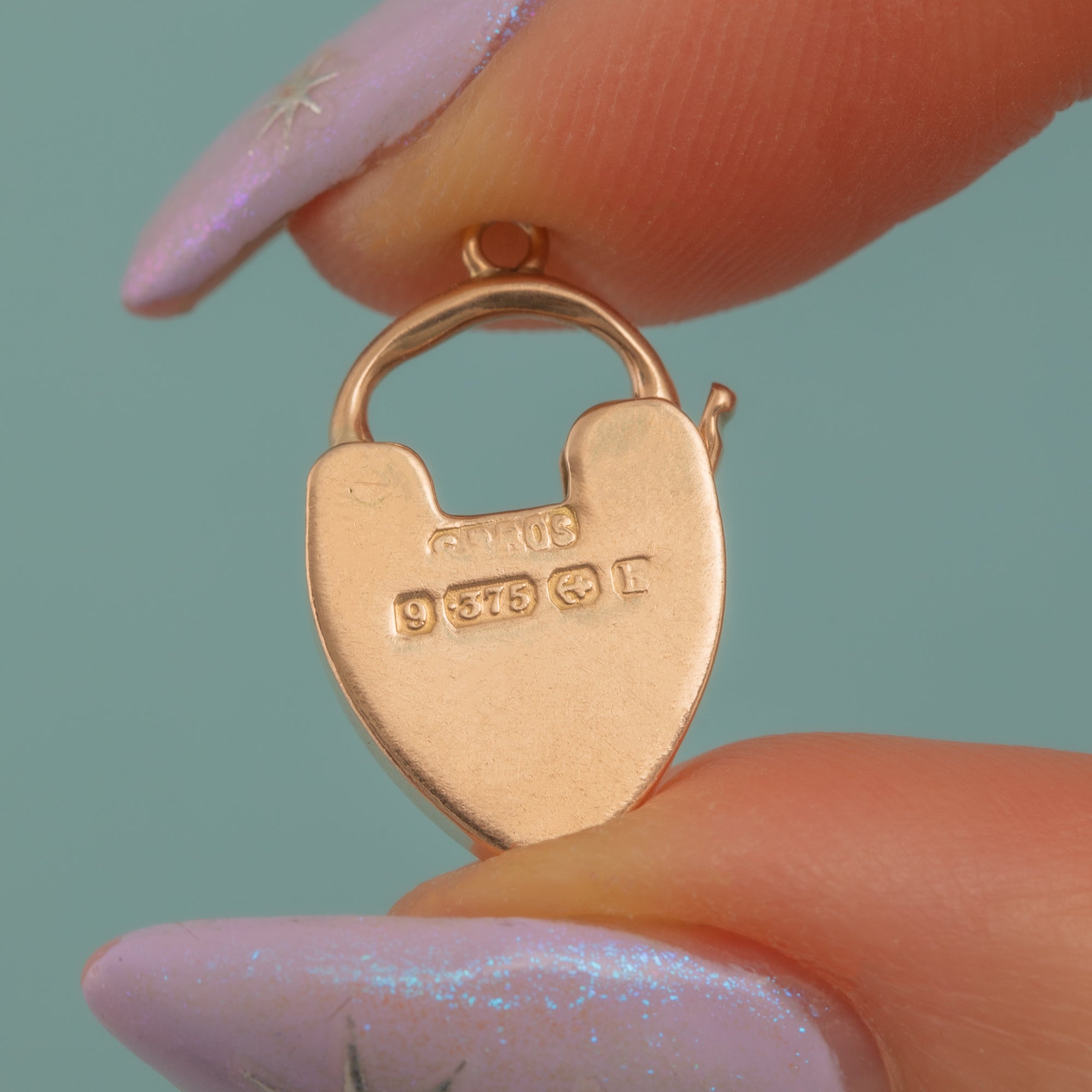This mini Edwardian 9ct Gold heart padlock charm is a dainty delight! Crafted from solid 9ct Gold, this petite padlock has a lovely rosy hue and is fully hallmarked, including an S.BROS maker's mark, dating to 1907.