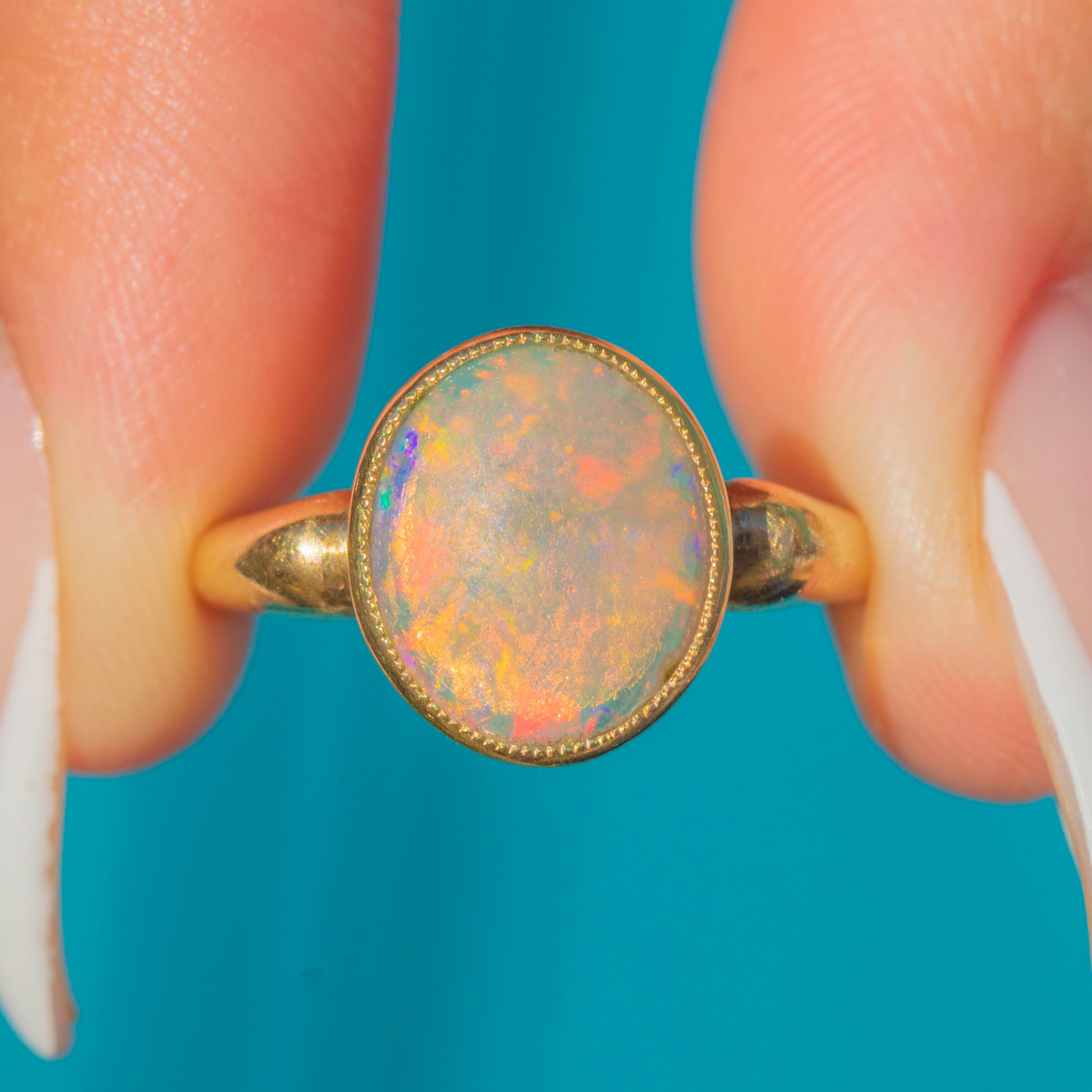 VERY GOOD: The Opal shows moderate surface wear consistent with age, but its play of colour remains vivid. Band and setting are secure and well-preserved.