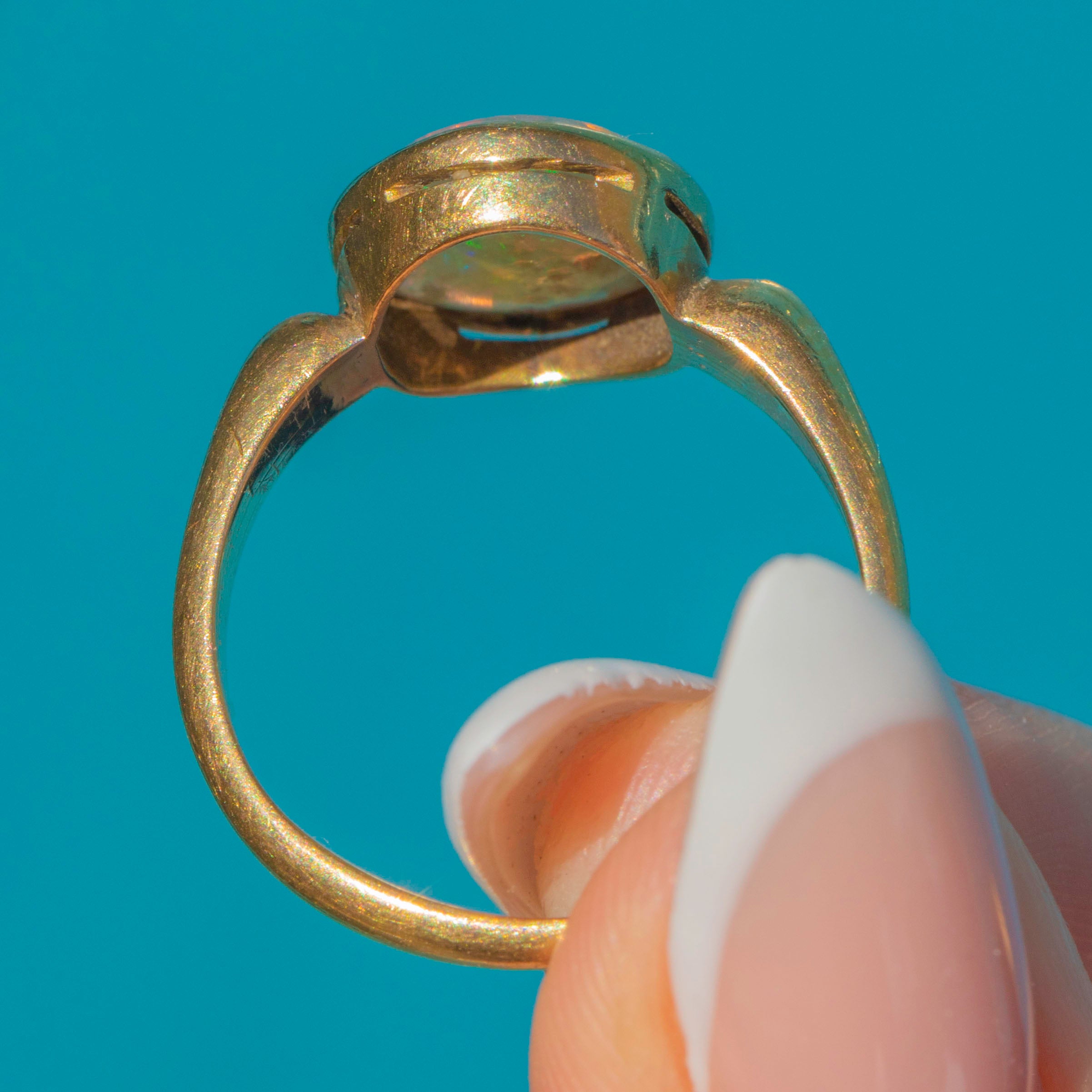 This Antique Victorian solitaire ring is crafted in rich 18ct Gold and set with a glowing Opal cabochon.