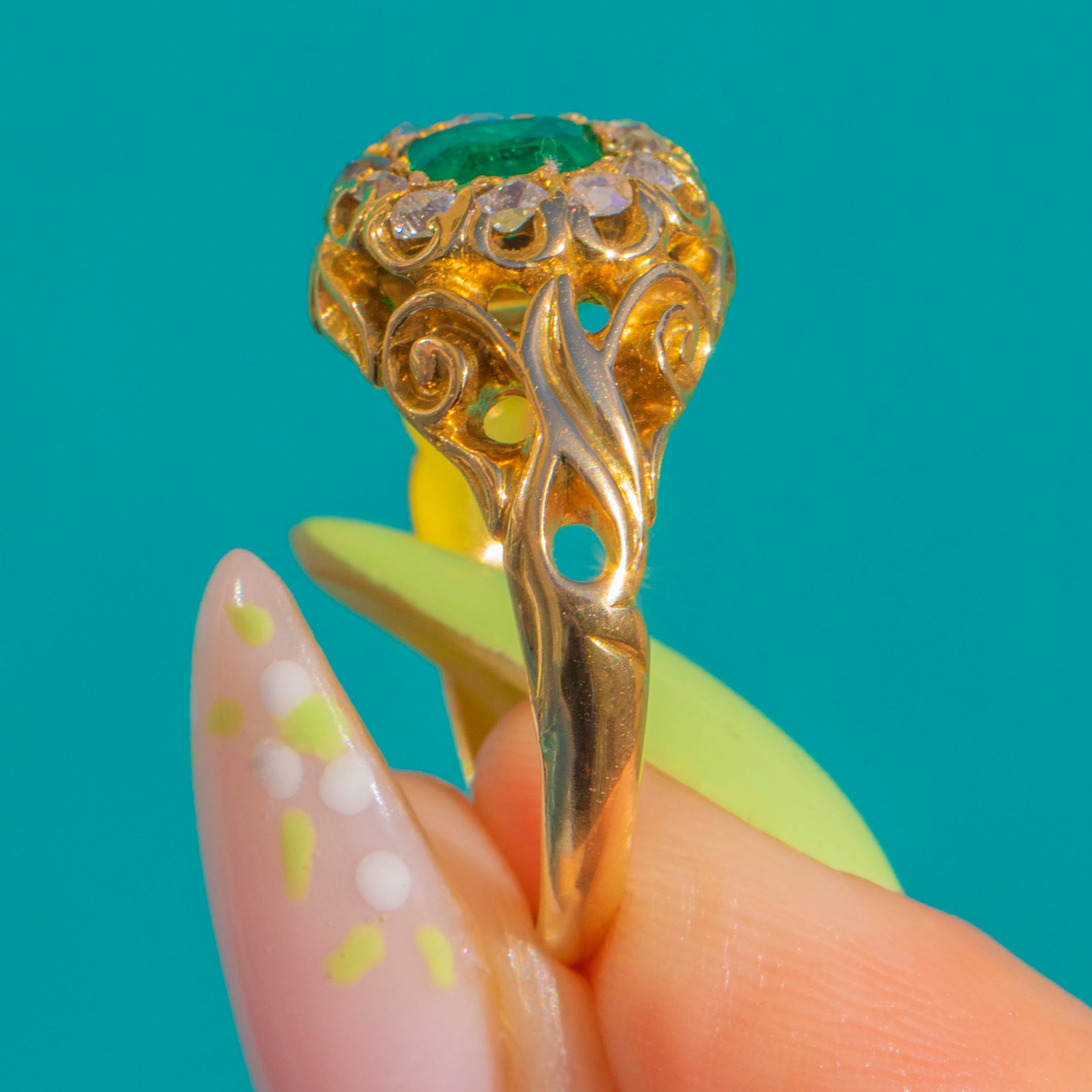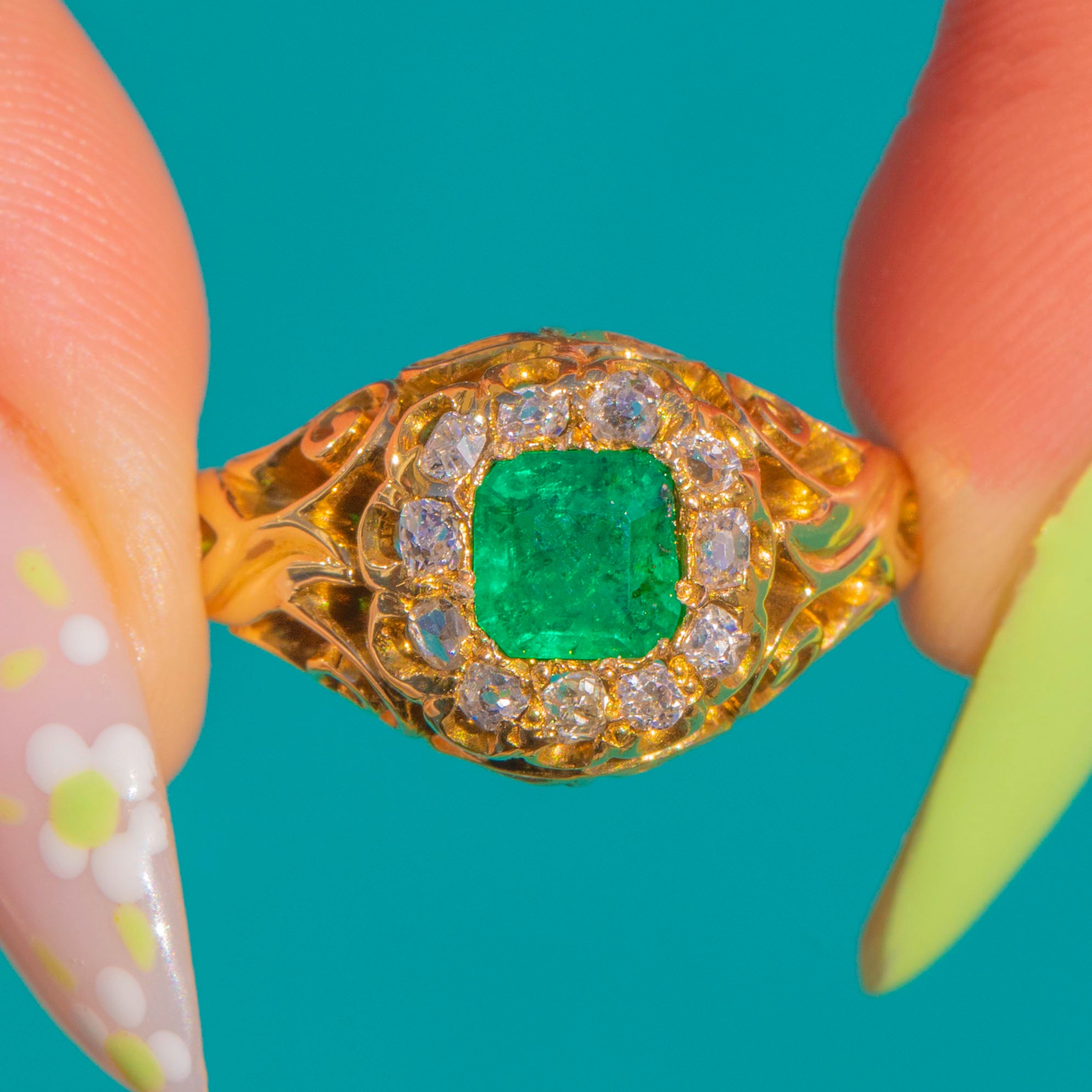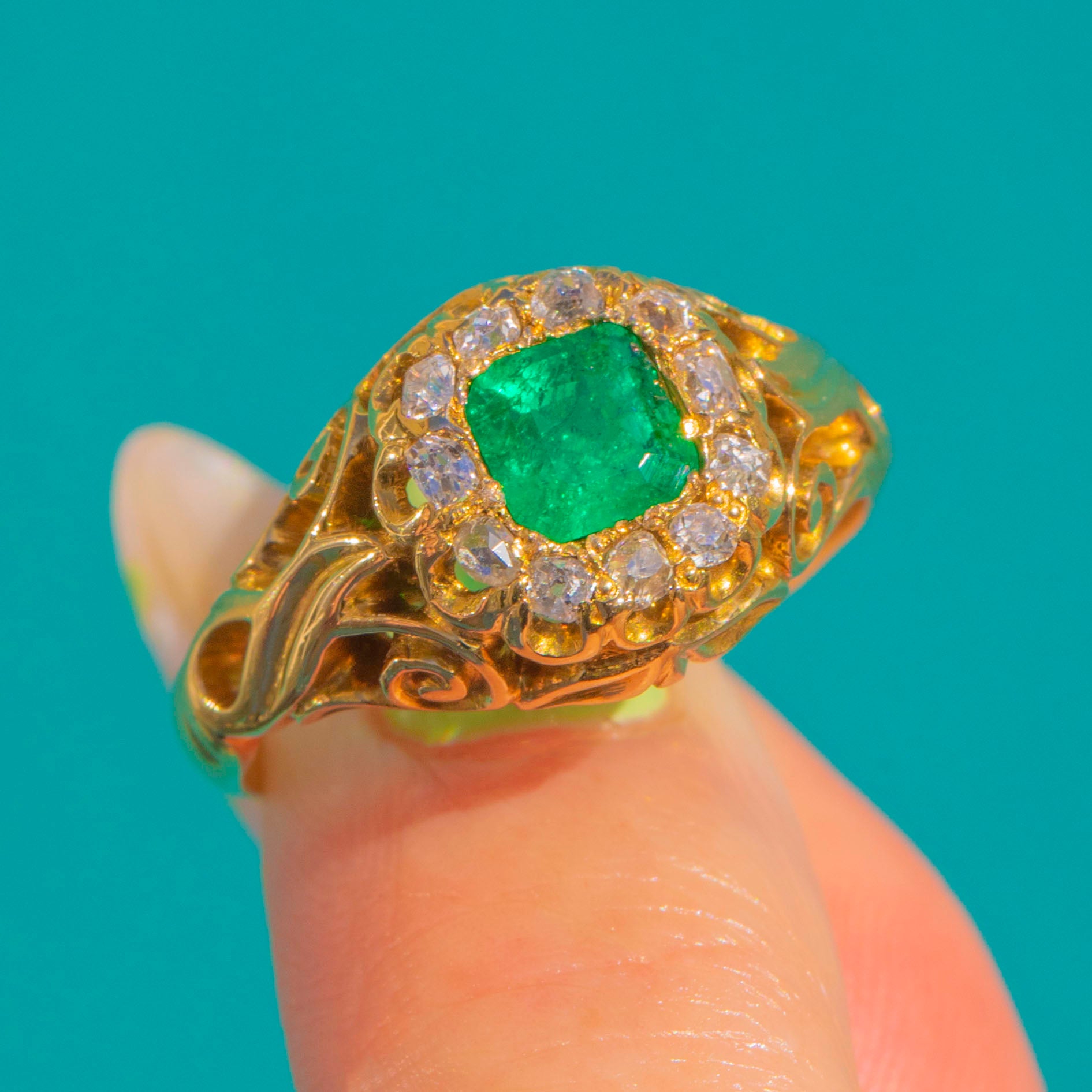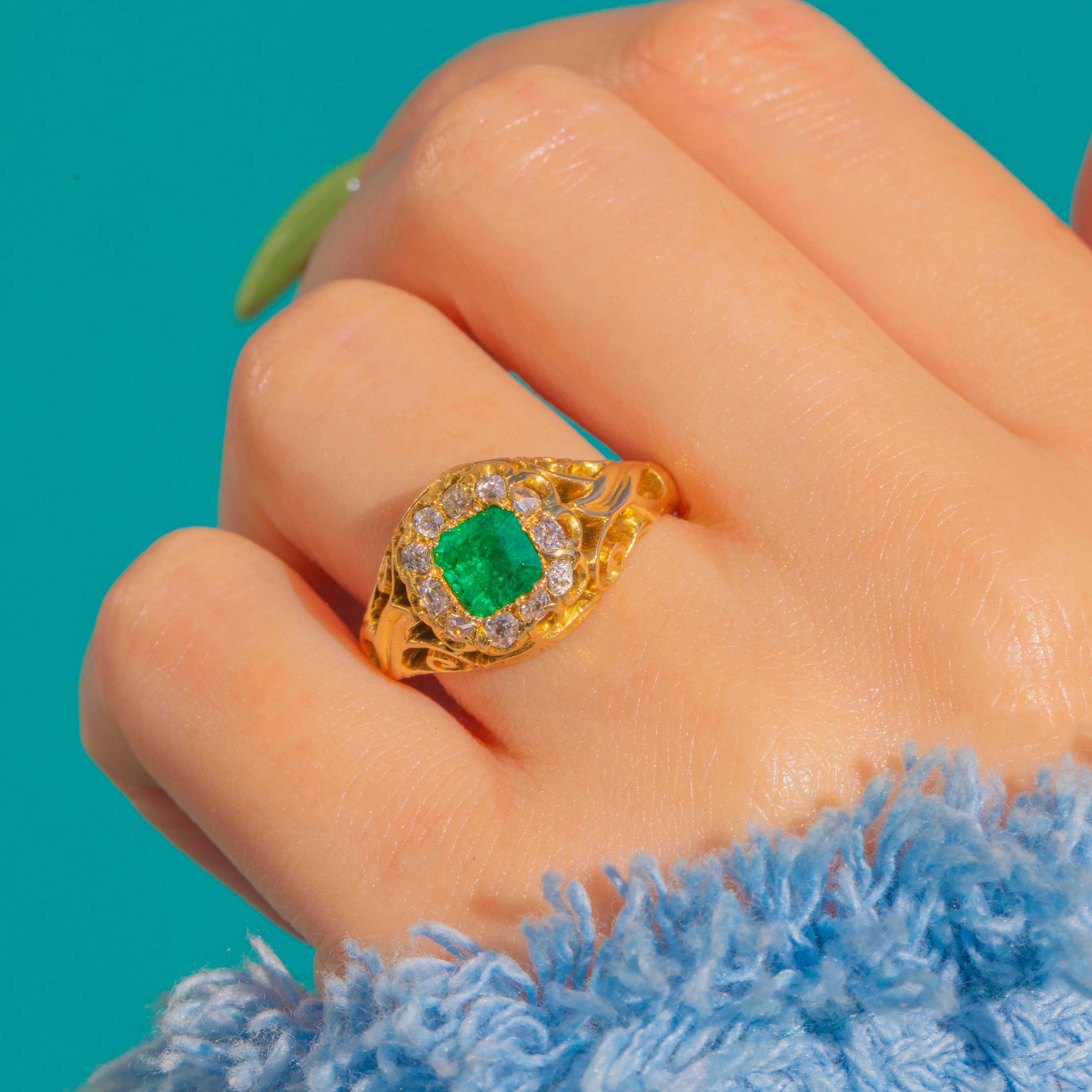 A quintessential Victorian treasure, circa 1890, this ornate and heavily carved cluster ring marries rich 18ct Gold with a vivid green Emerald and a halo of sparkling antique Diamonds!
