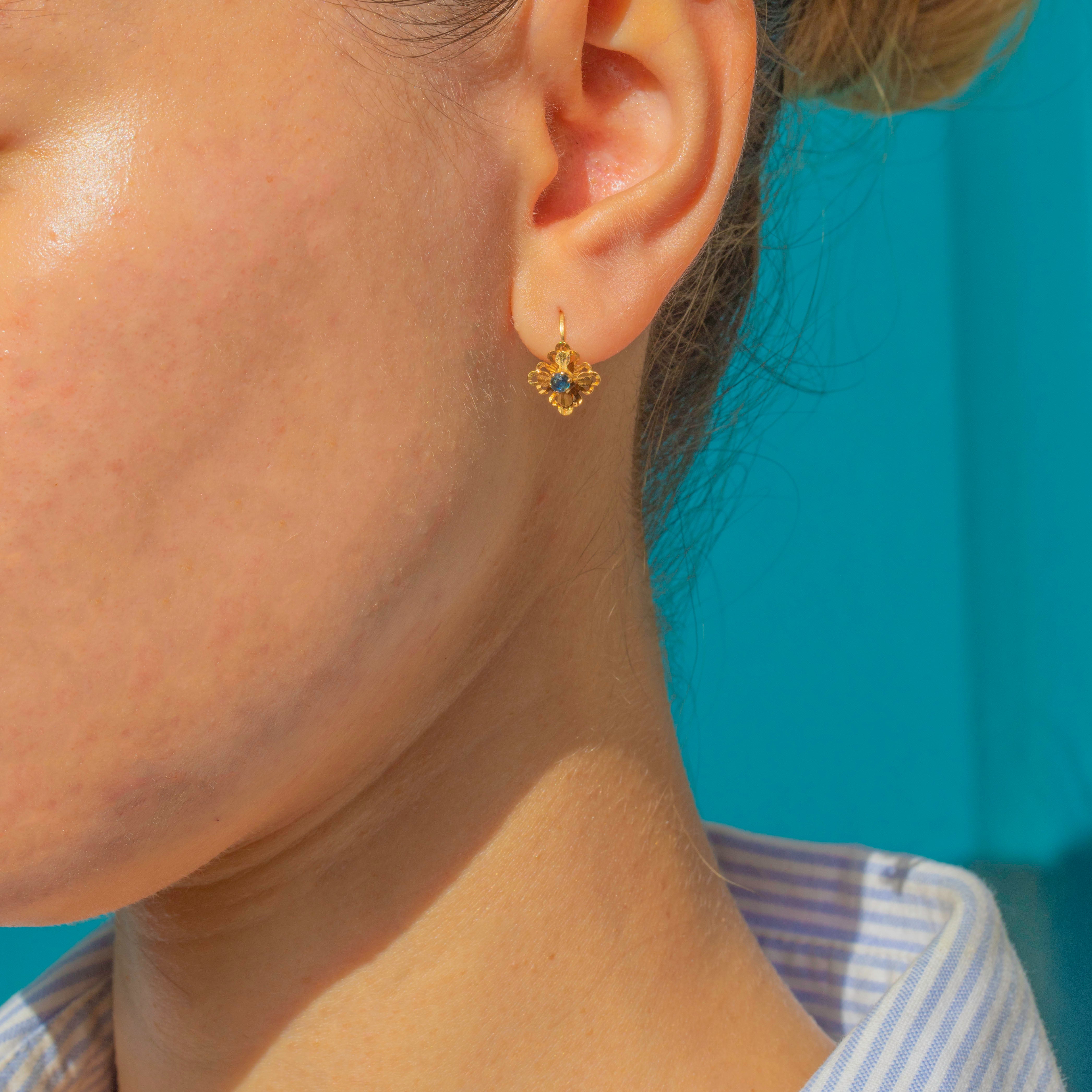 Charming French lever-back earrings in rich 18ct Gold, each formed as a tiny quatrefoil flower with a bright blue Sapphire at the centre. Dainty, effortless and easy to wear every day.