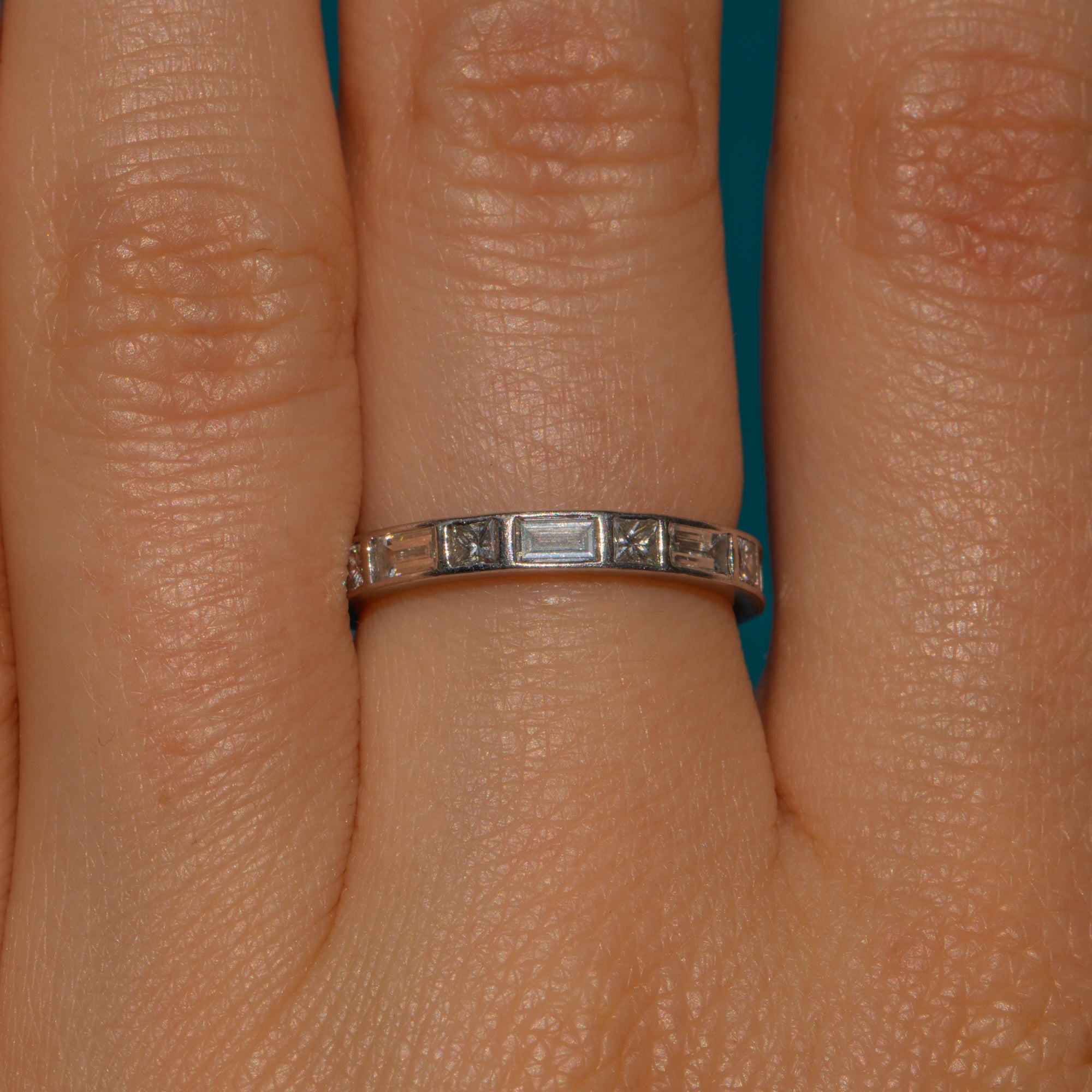 We think this Platinum Diamond stacking ring is such a great find! Made from Platinum, this ring has been inlaid with baguette-cut and princess-cut Diamonds in a half eternity style that sits beautifully on the finger.