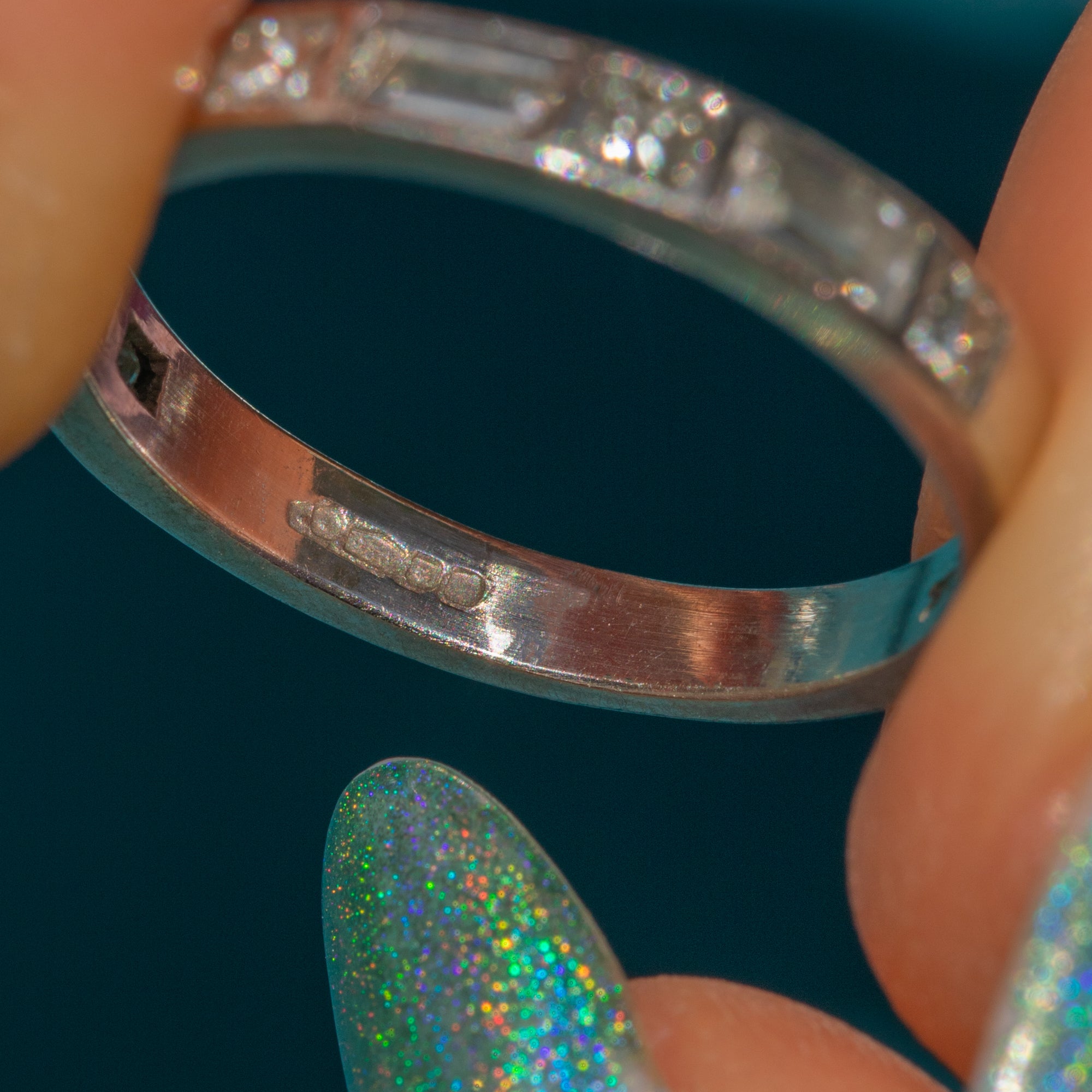 EXCELLENT. This Platinum Diamond stacking ring is in excellent condition. The ring has very little sign of wear, the Diamonds are gorgeous and secure. The hallmarks aren't quite visible, but you can make out the 950 and Leopard's Head!