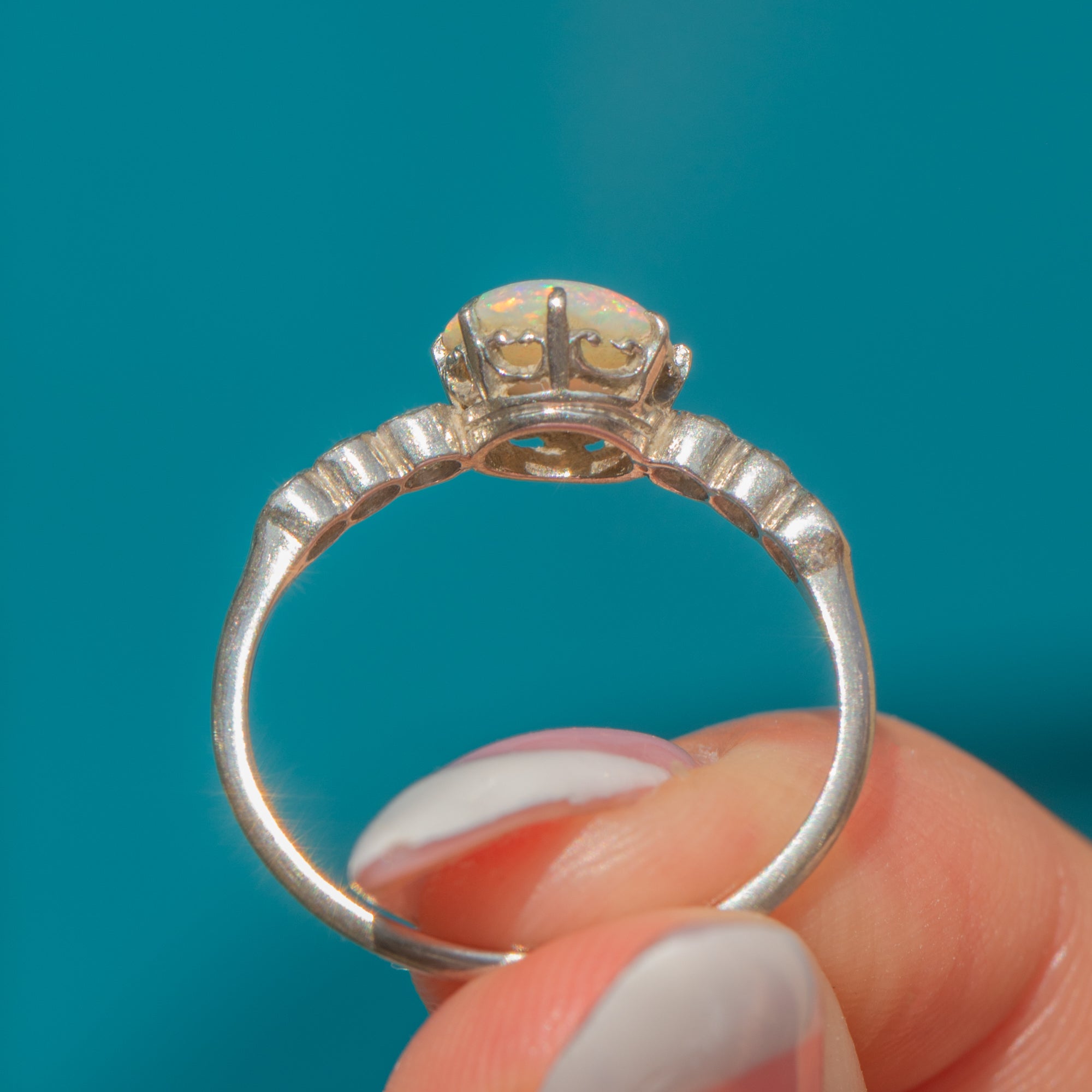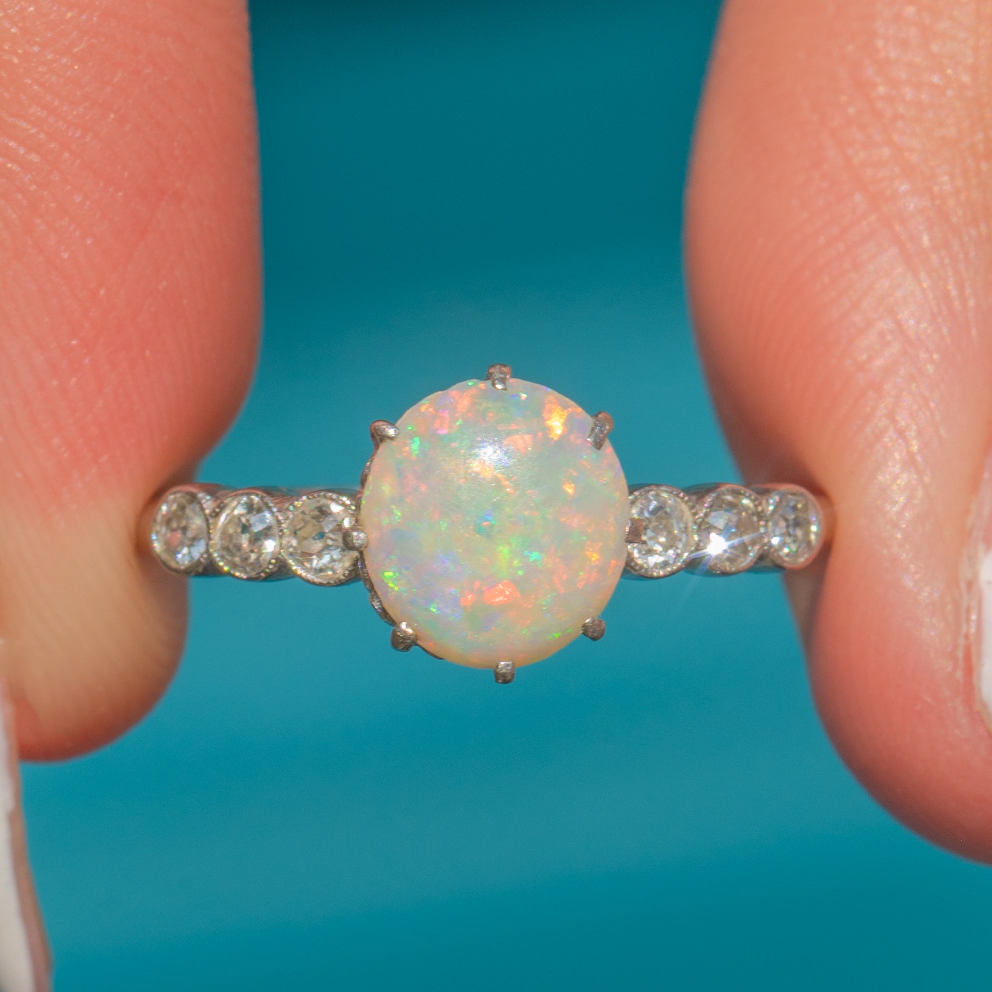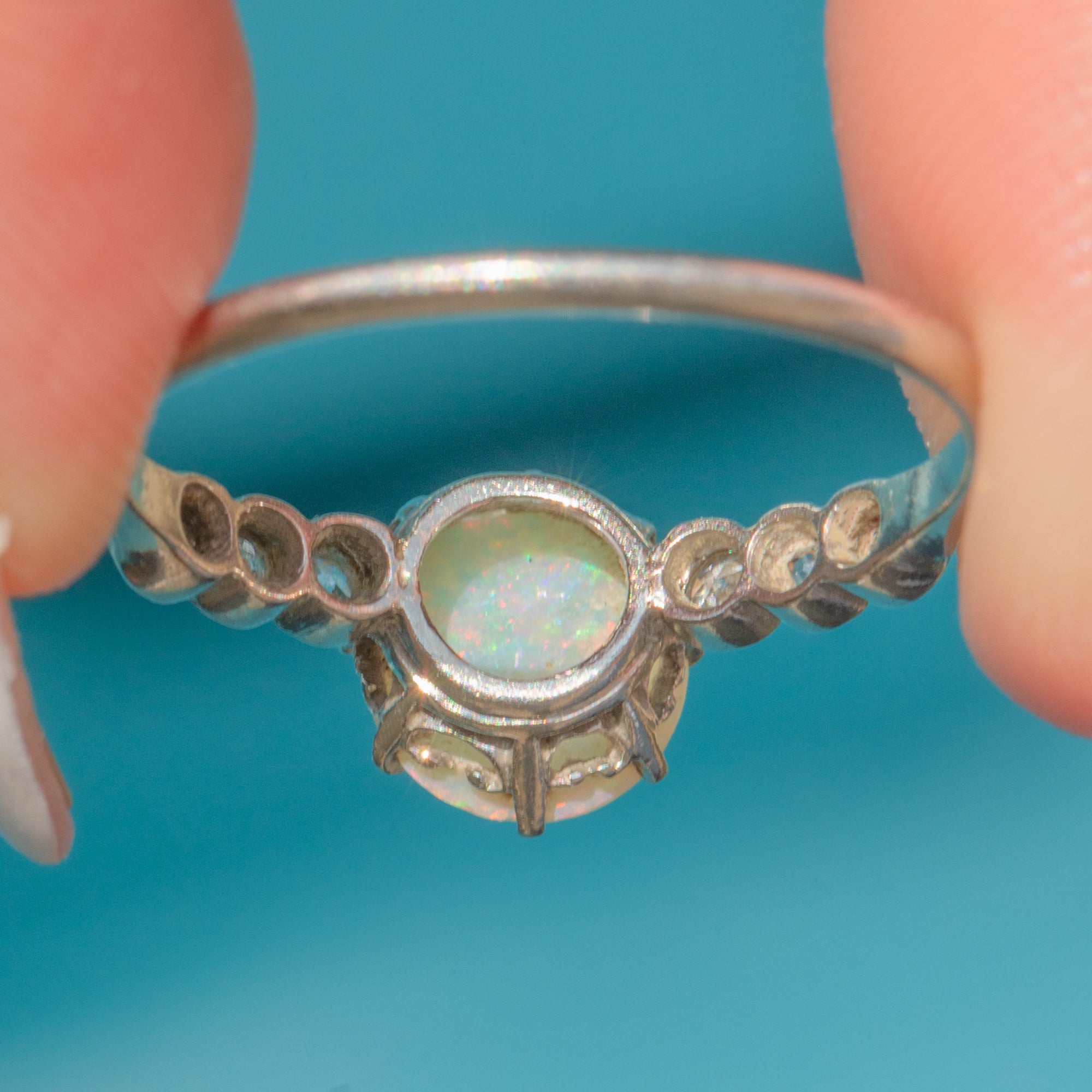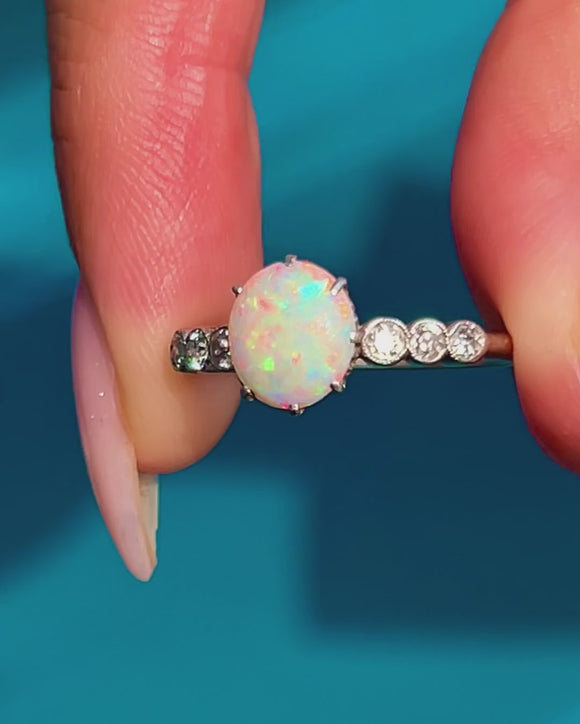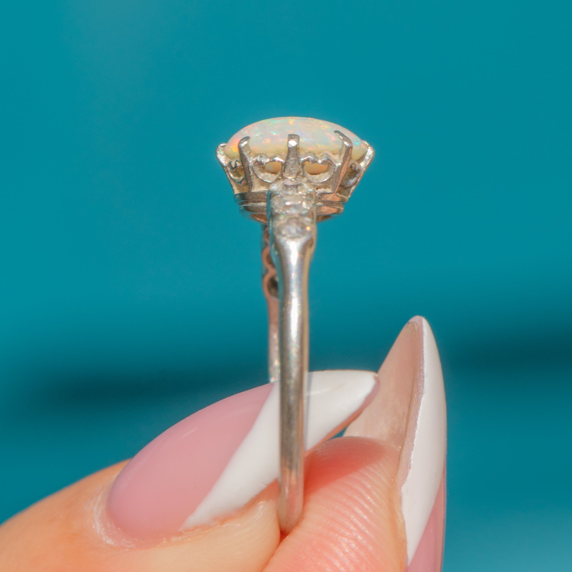 VERY GOOD: The Opal is securely set and displays vibrant colour. One Diamond has a tiny chip, only visible under magnification. The band shows slight thinning and has been made smaller, resulting in a slightly elliptical shape. Overall, the ring remains in lovely condition with wear consistent with age.