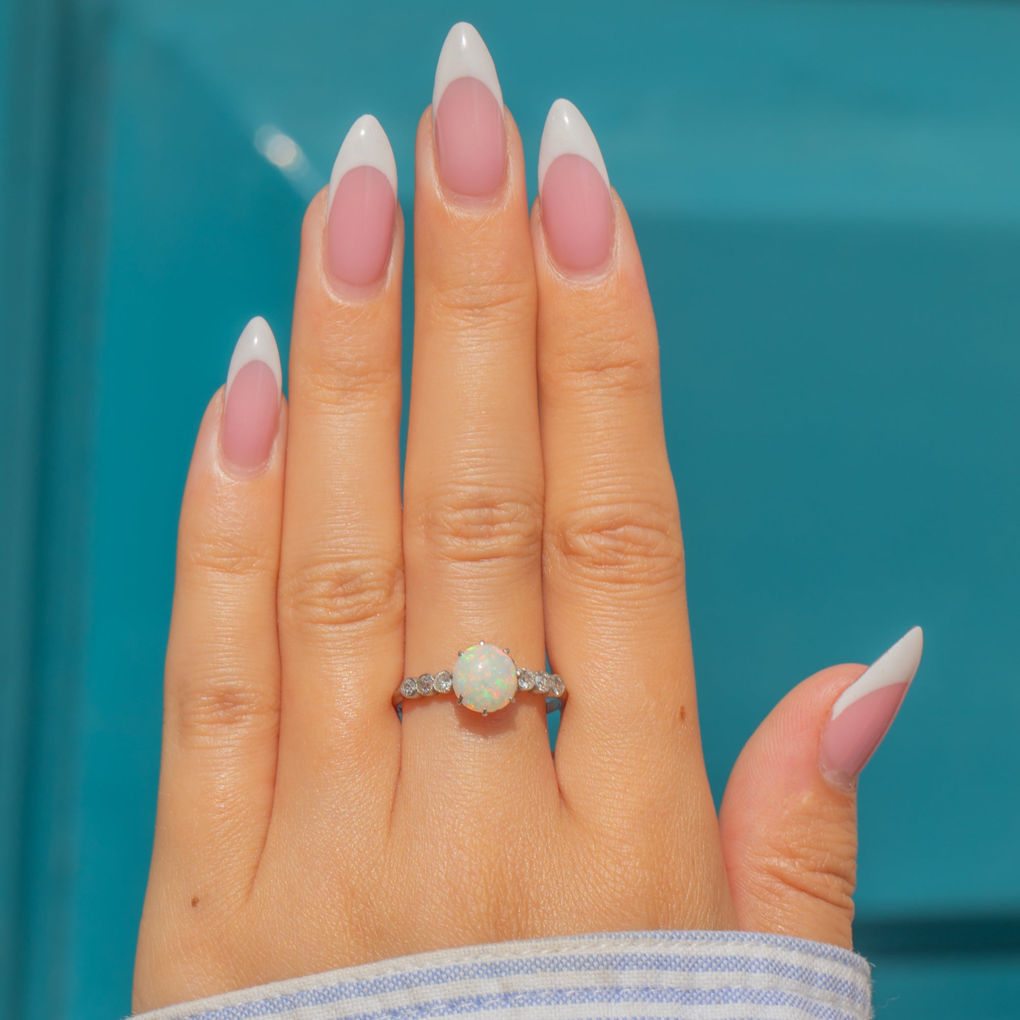 This refined Platinum ring showcases a luminous Opal cabochon accompanied by twinkling Diamond accents. The 1.25ct Opal cabochon glows with characteristic play-of-colour, beautifully complemented by 0.15cts of sparkling Diamonds.