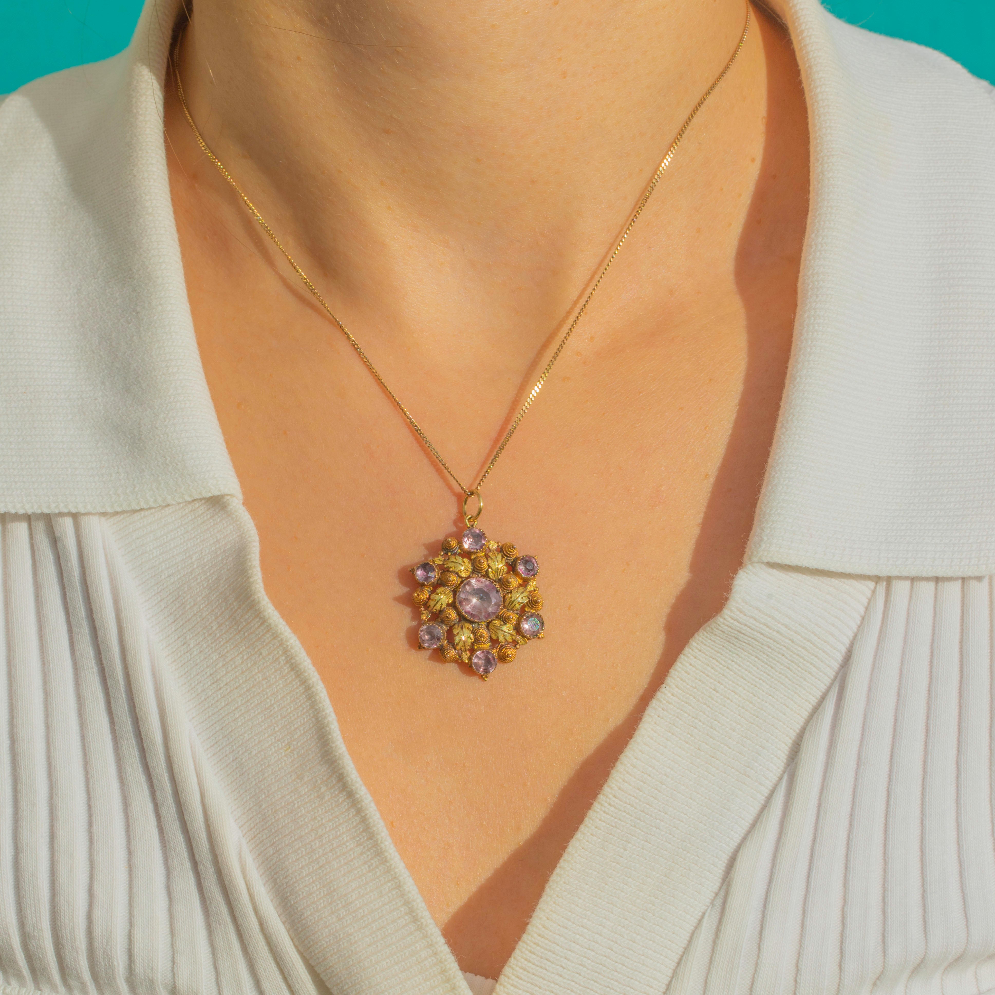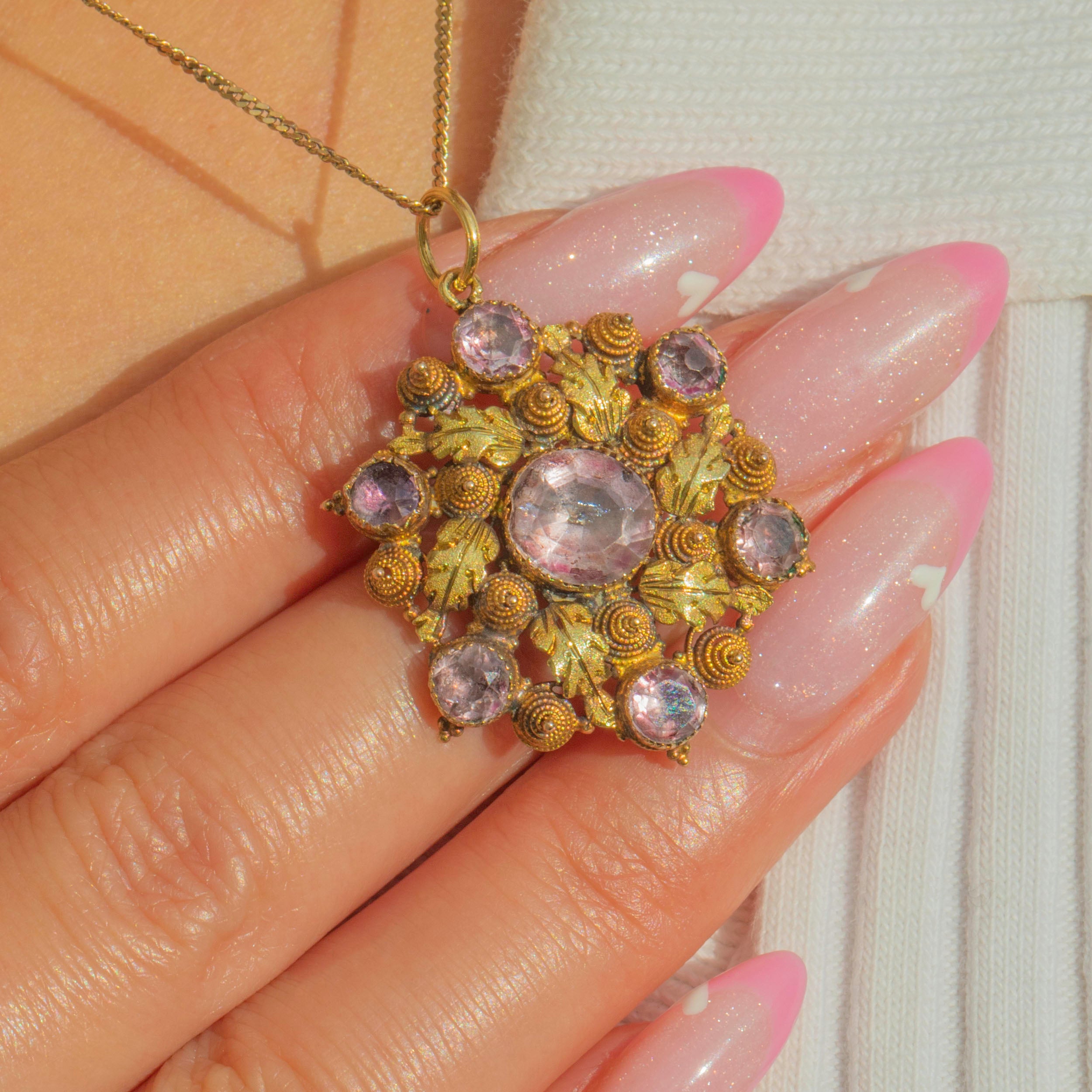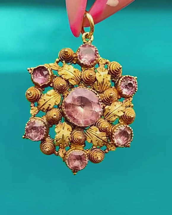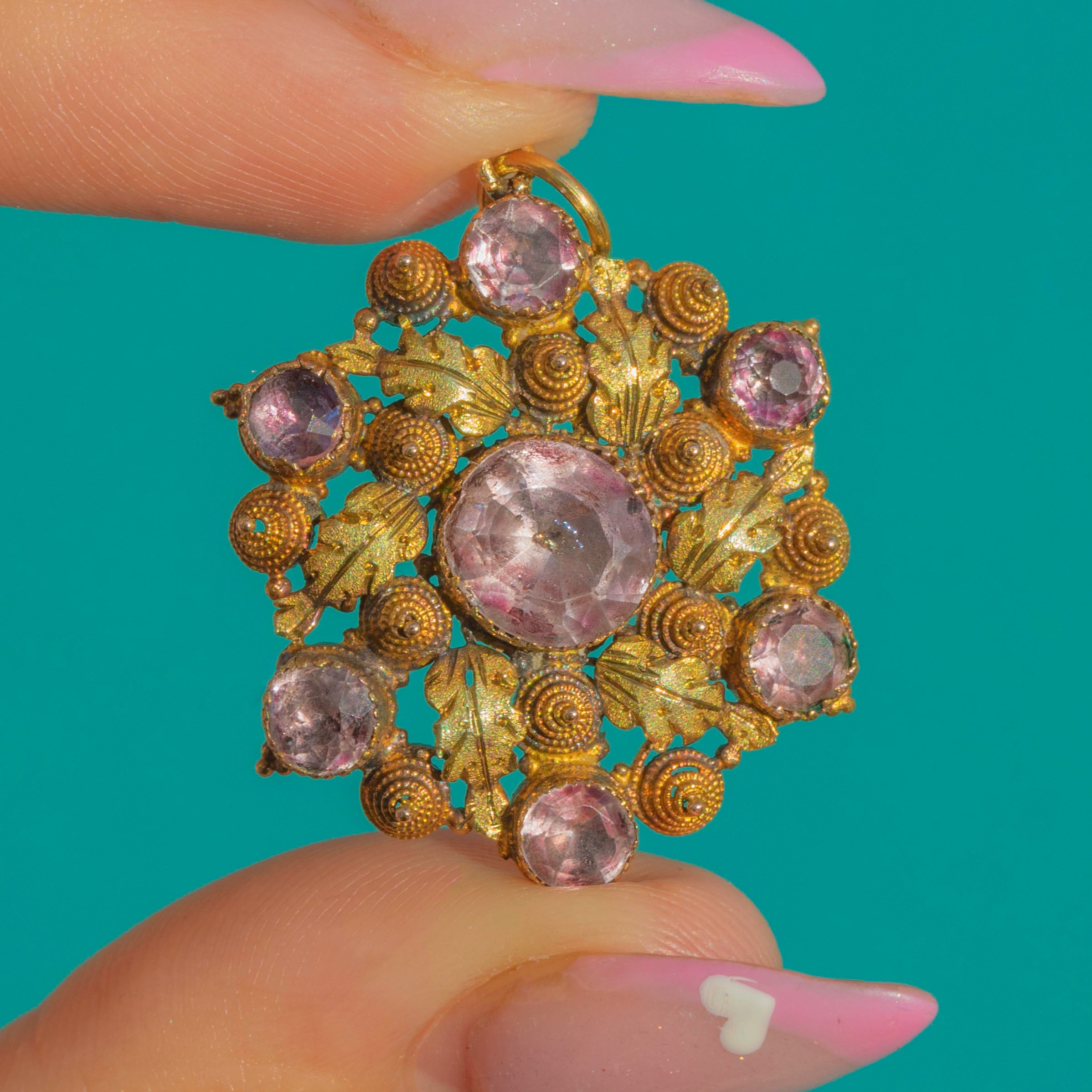 This exquisite Portuguese Georgian pendant is a remarkable example of early 19th-century craftsmanship, designed as a radiant flower set with foiled Pink Topaz gemstones. The richly coloured stones are arranged in a floral cluster, centred by a vivid 8mm Topaz surrounded by smaller 4.5mm gems, all shimmering with that soft inner glow unique to Georgian foiling.