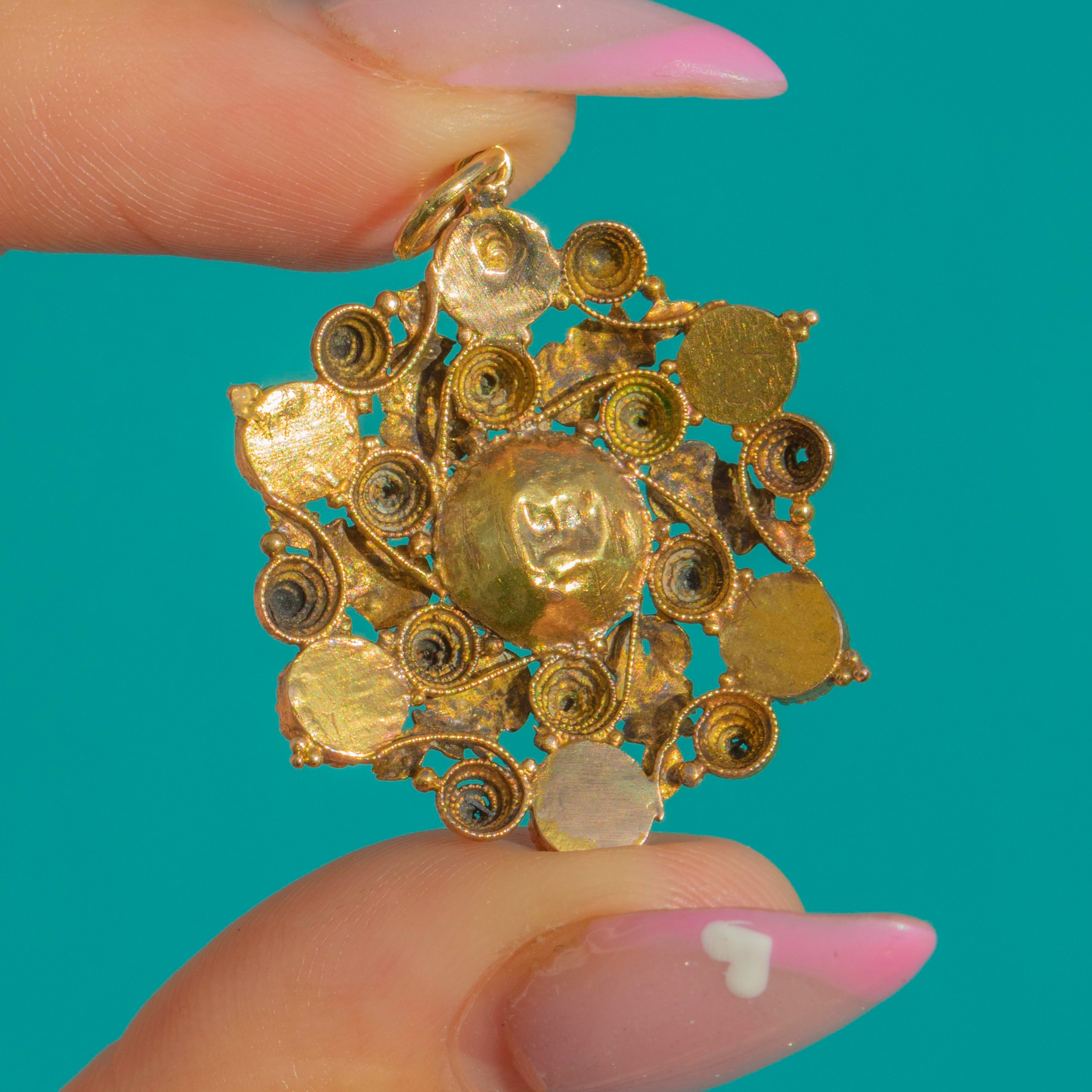 Finely crafted in 18ct Gold, the setting displays delicate cannetille wirework and tiny Gold leaves, hallmarks of high-quality Iberian workmanship from this period. Romantic, intricate, and wonderfully preserved, it’s a rare and precious survivor from over 200 years ago.