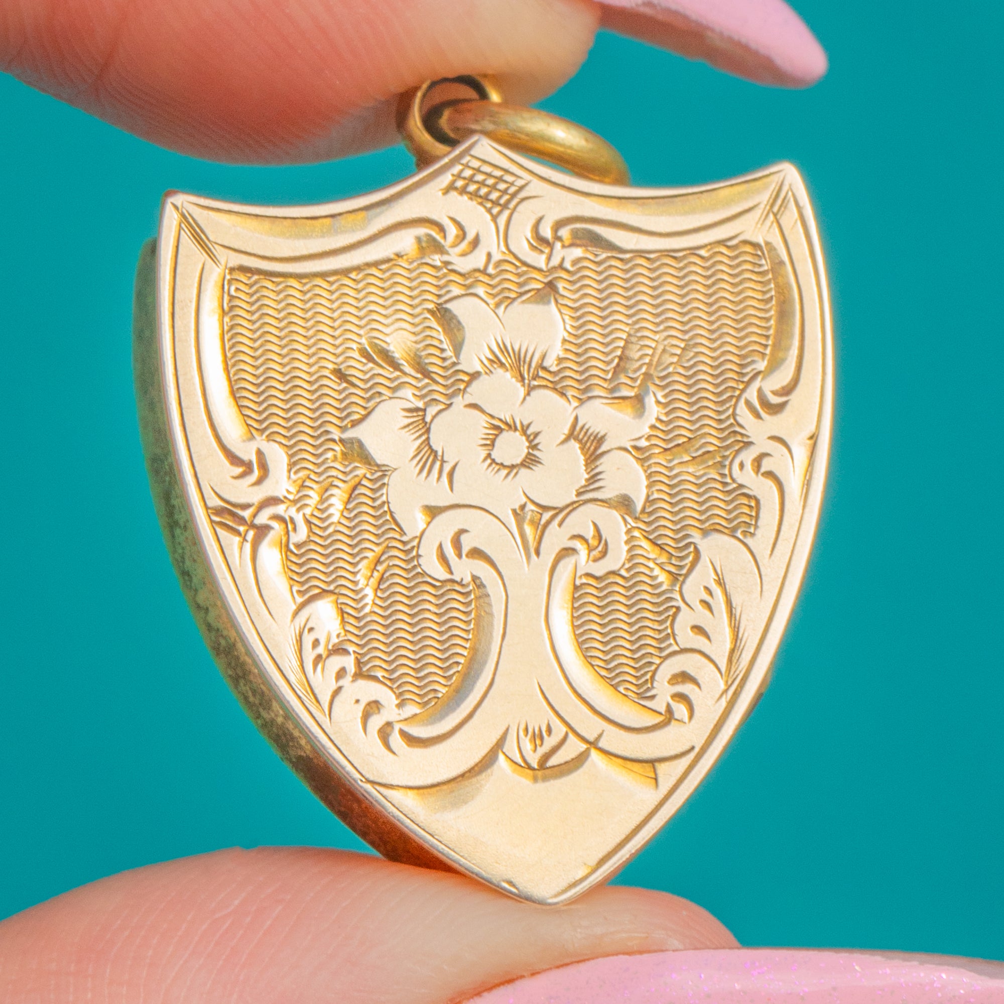 A charming Victorian 9ct Gold shield locket, richly decorated with a fine engine-turned ground and an elegant raised floral cartouche. The warm Yellow Gold gleams, while the crisp engravings and radiating lines lend a refined, romantic air.