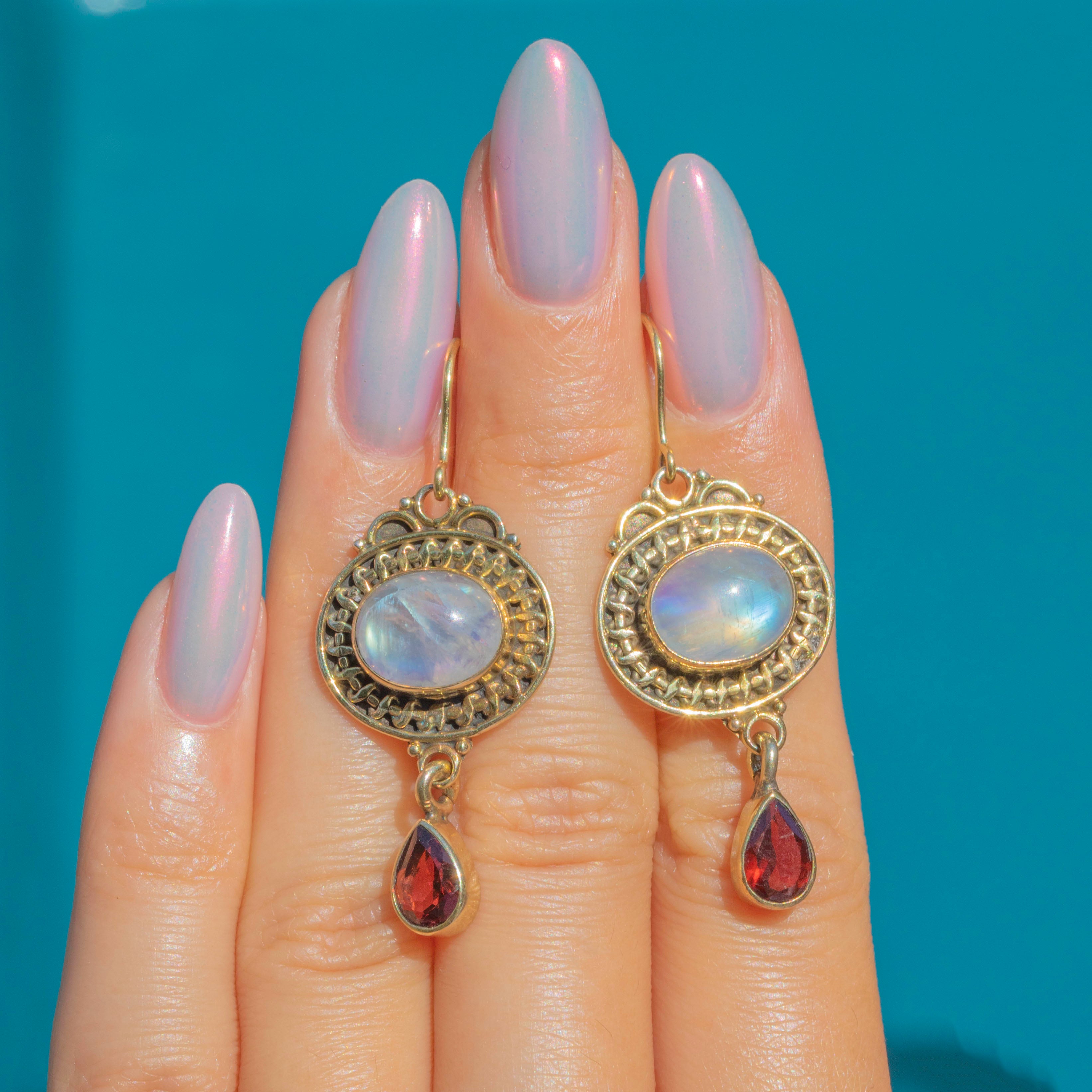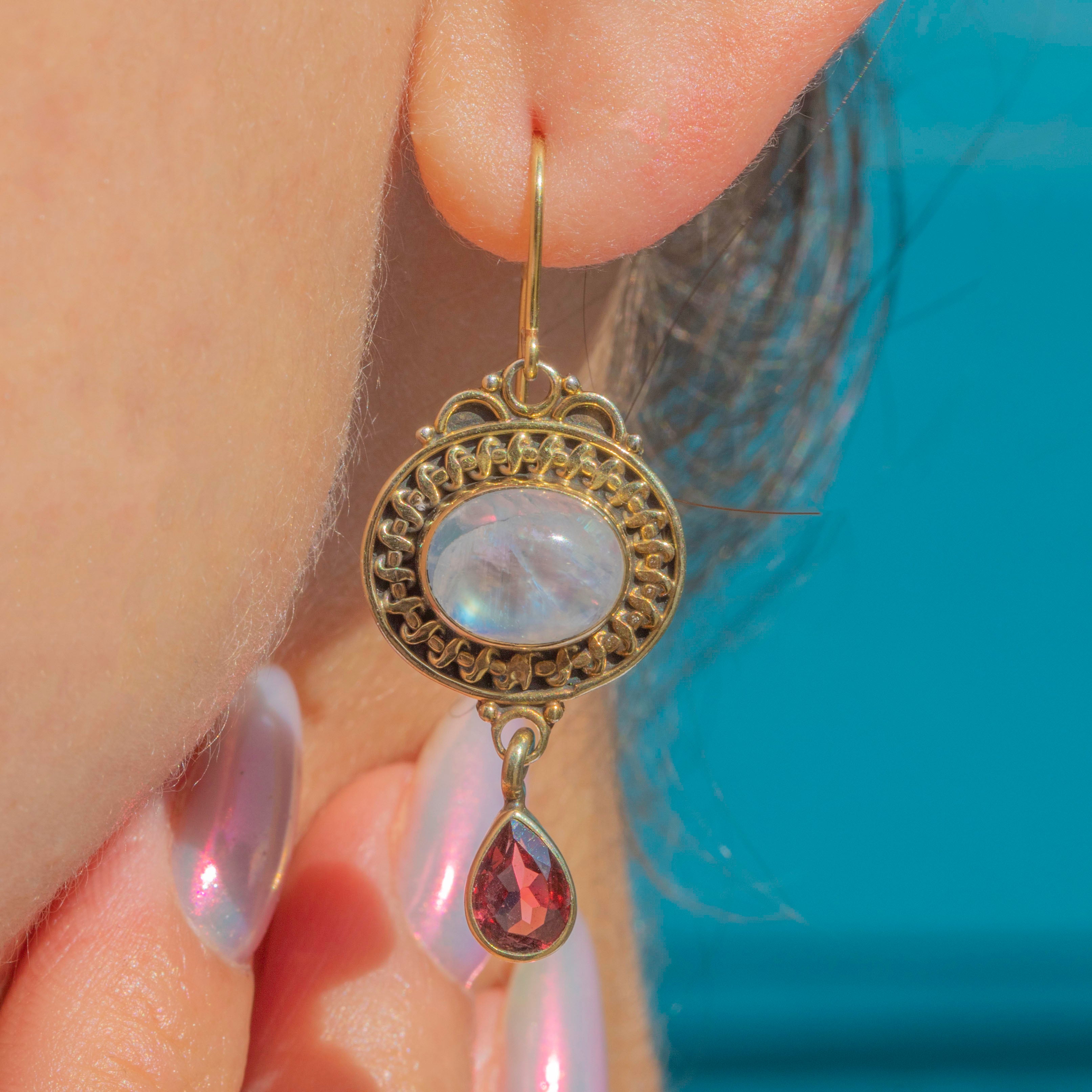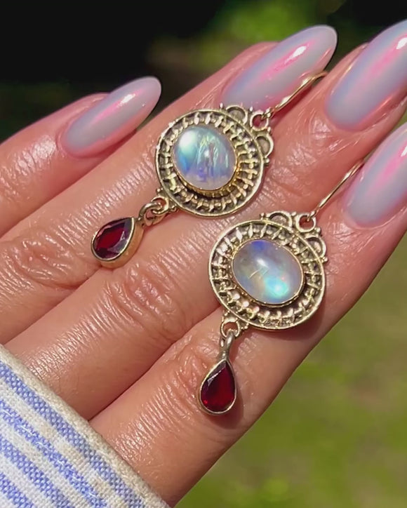 MATERIALS: Main body is 9ct Gold over Sterling Silver, 9ct Gold hooks, Rainbow Moonstones (3.16ct), Garnets (1.46ct).
