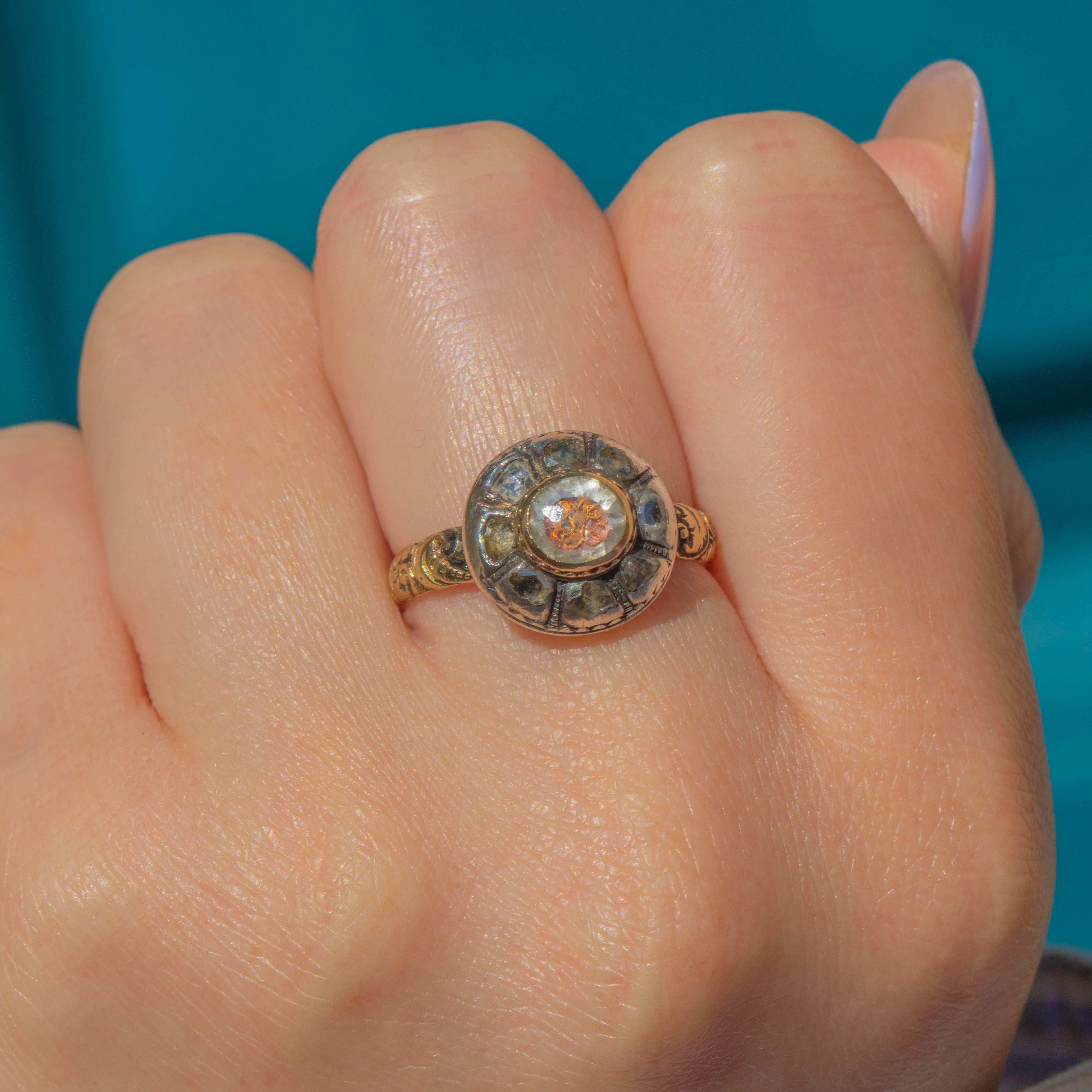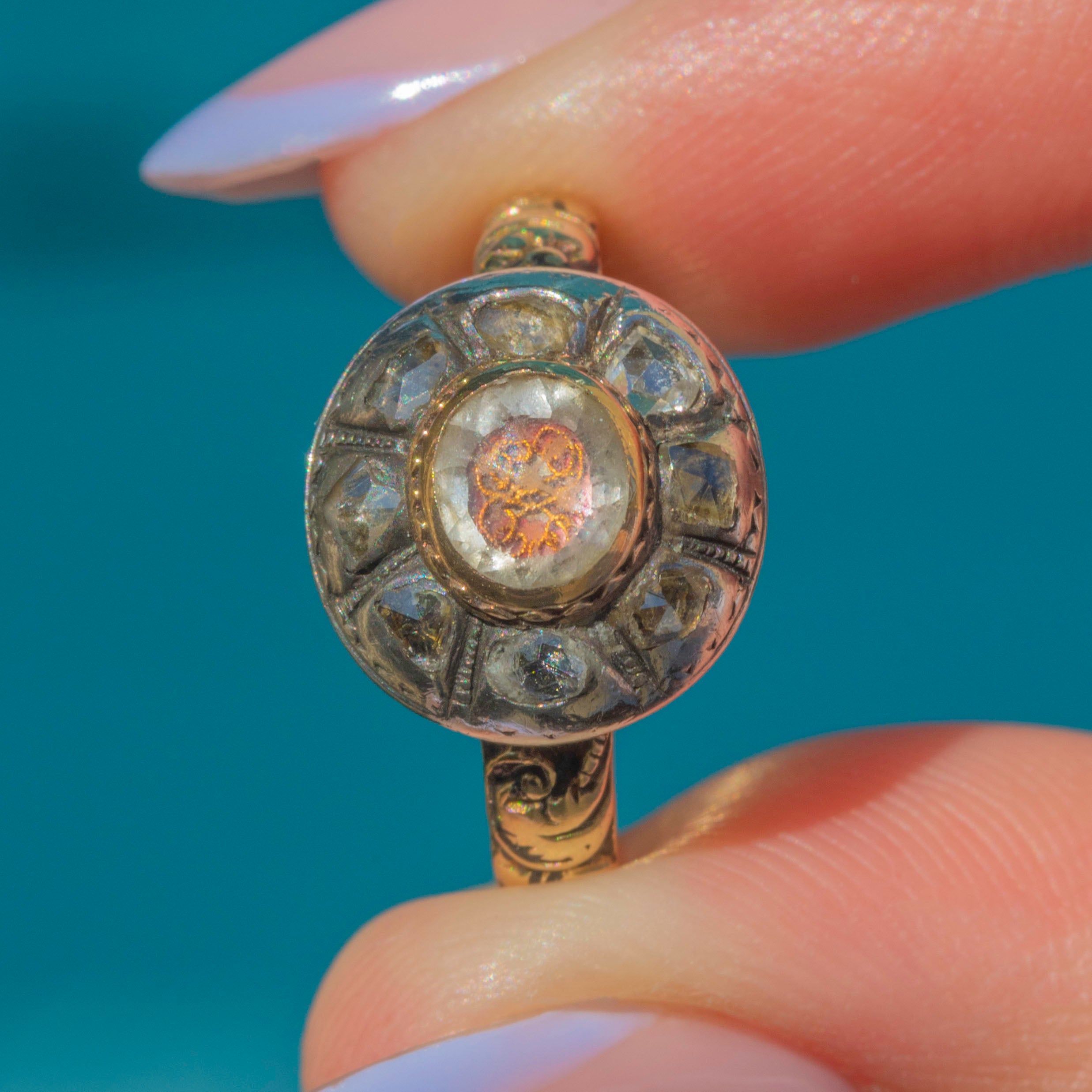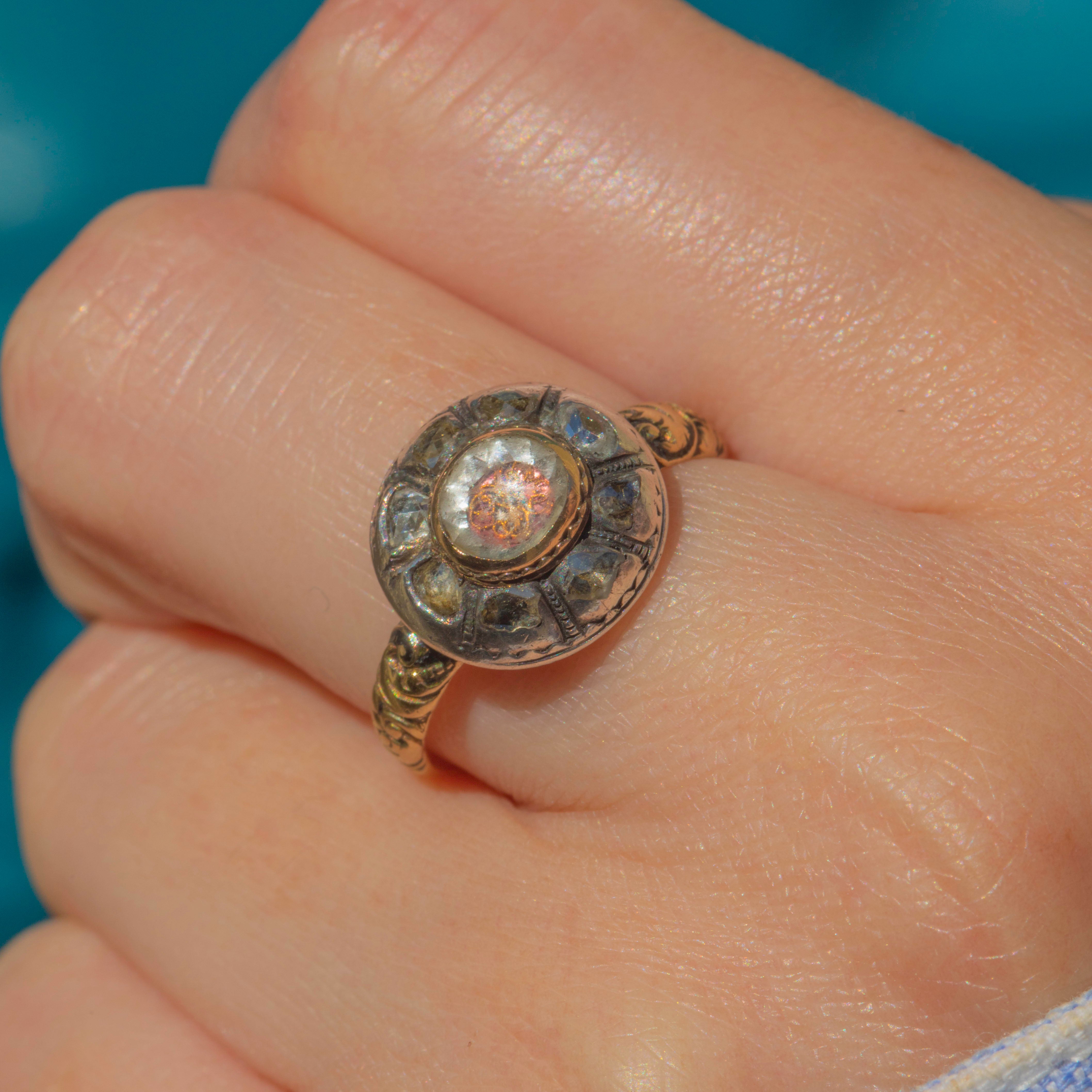 Encircled by a cluster of natural Rose-cut Diamonds forming like a halo around the central Crystal, her aesthetic domed atop a finely worked Gold band with ornate engraved / heavily embossed floral shoulders that speak to the fine craftsmanship of the period.