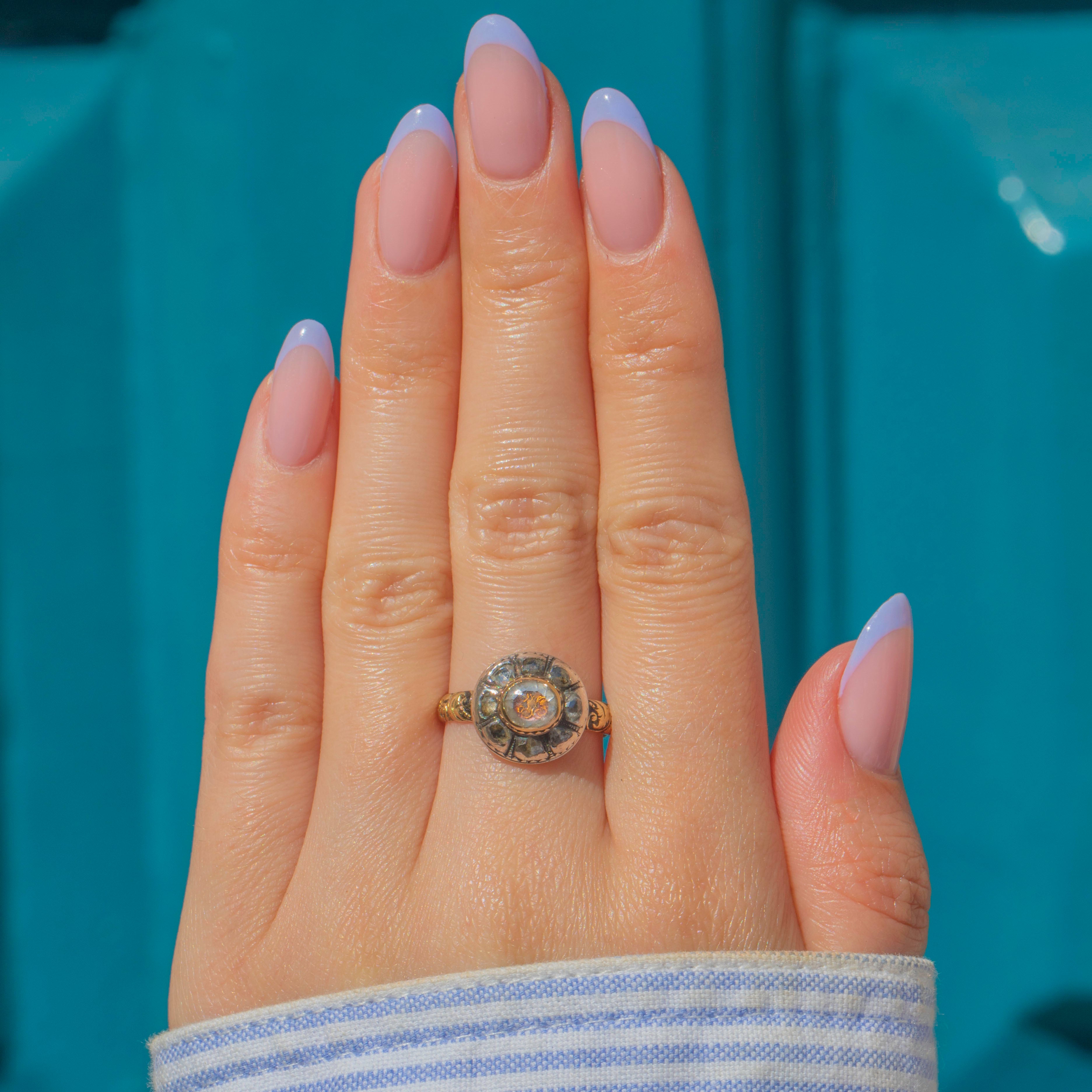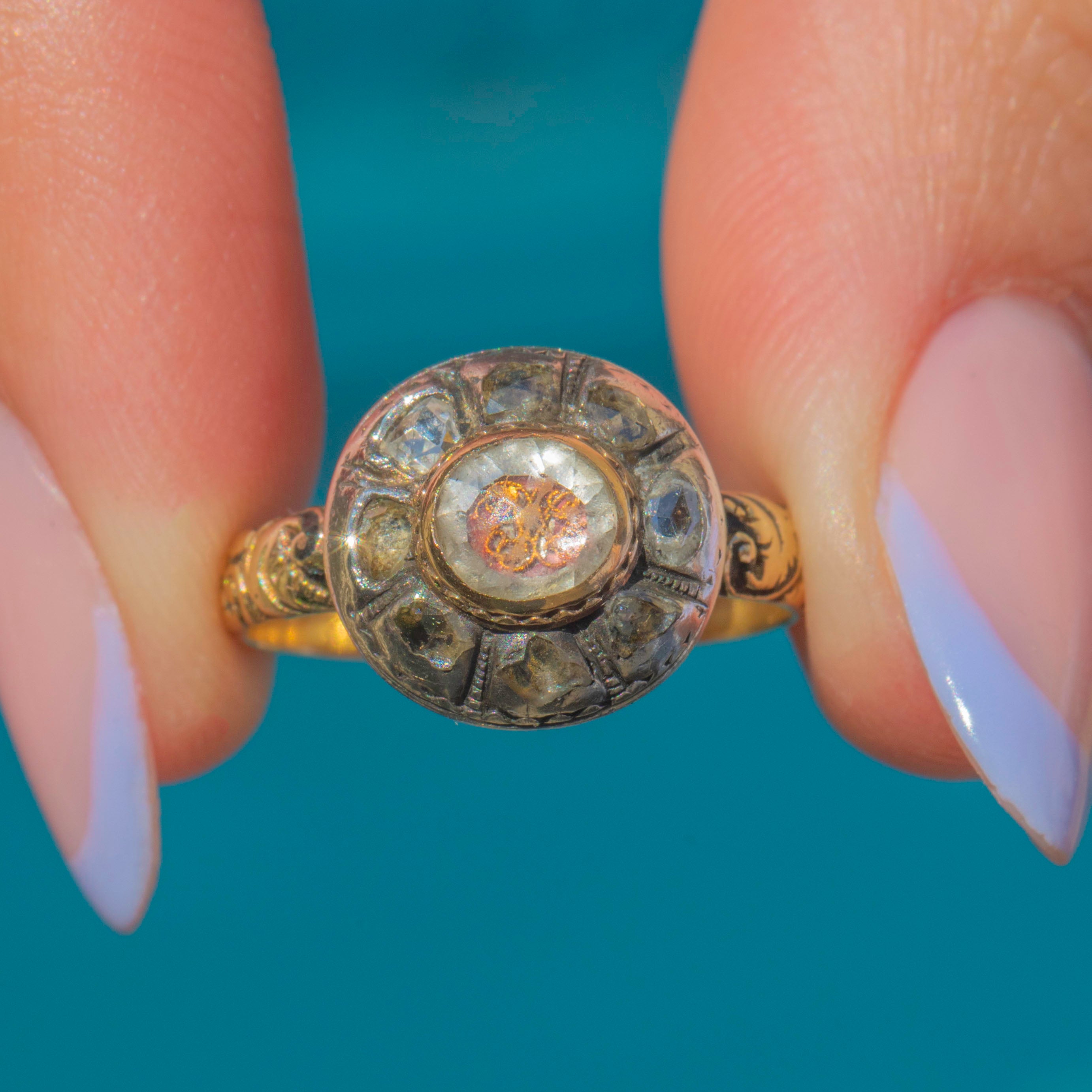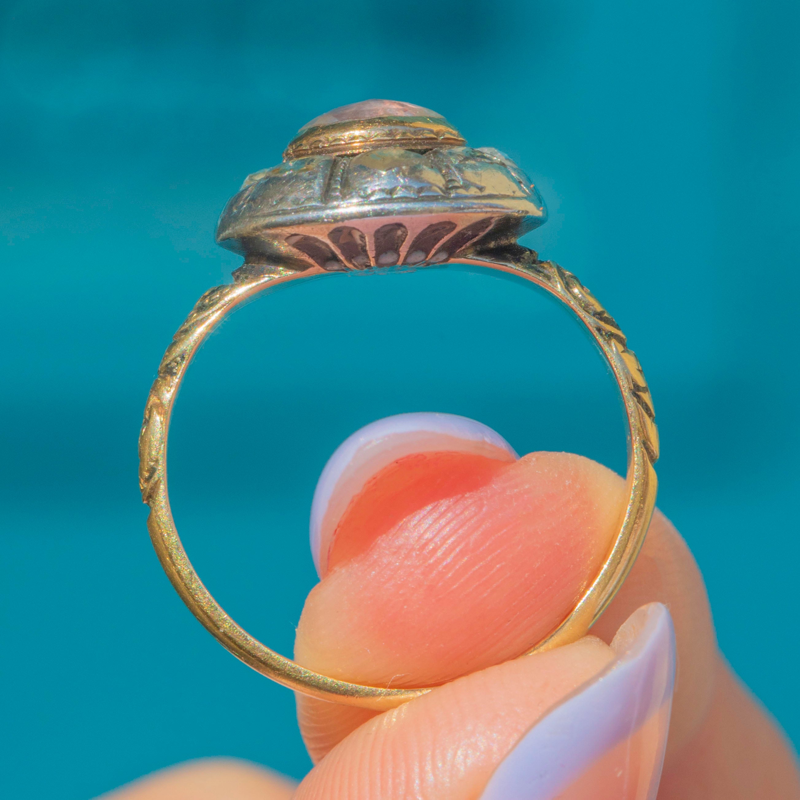 Encircled by a cluster of natural Rose-cut Diamonds forming like a halo around the central Crystal, her aesthetic domed atop a finely worked Gold band with ornate engraved / heavily embossed floral shoulders that speak to the fine craftsmanship of the period.