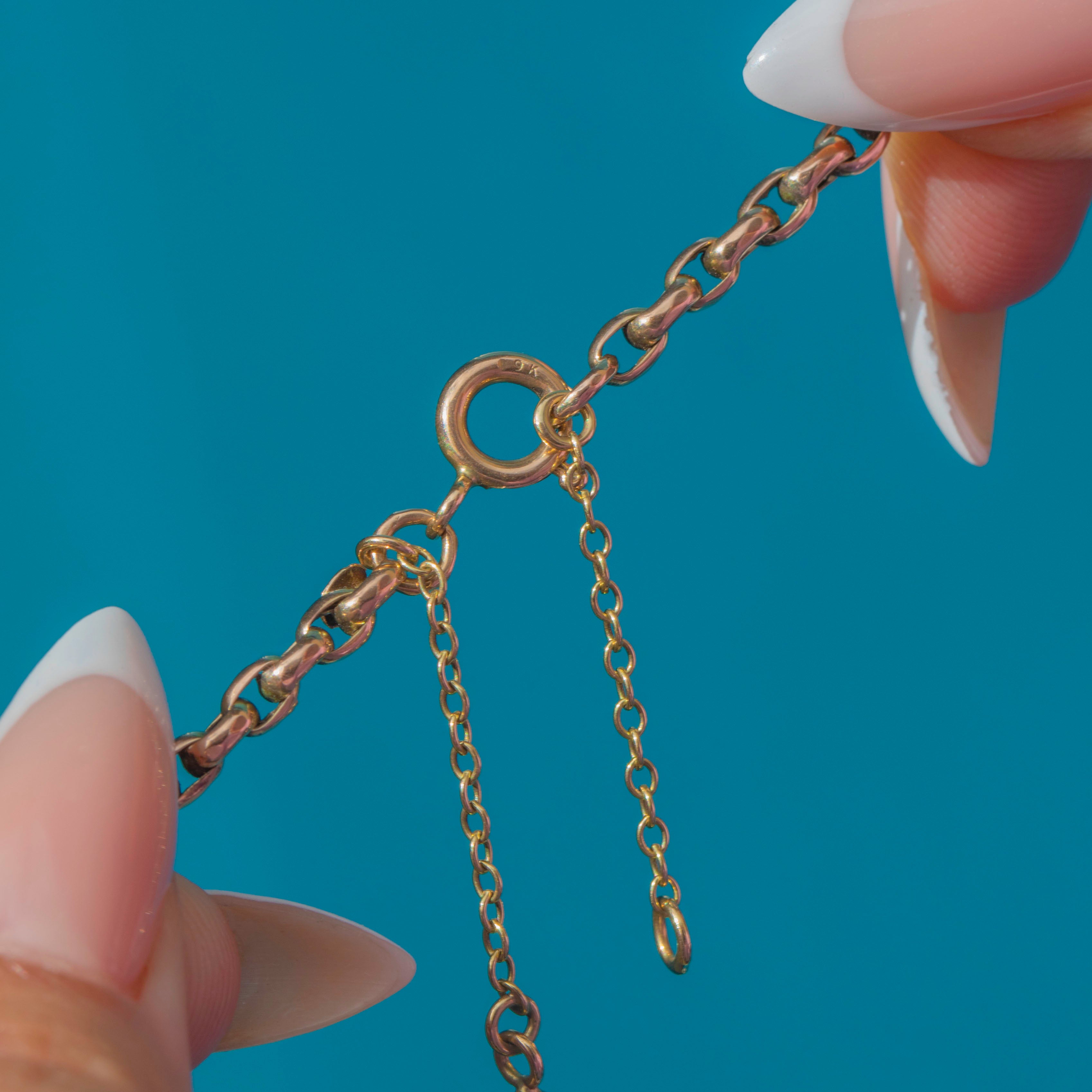 The chain closes with a secure bolt ring and retains its original safety chain for added security. Near the clasp, the rare “9CT” tag mark confirms its Victorian origin and adds to its historical appeal.