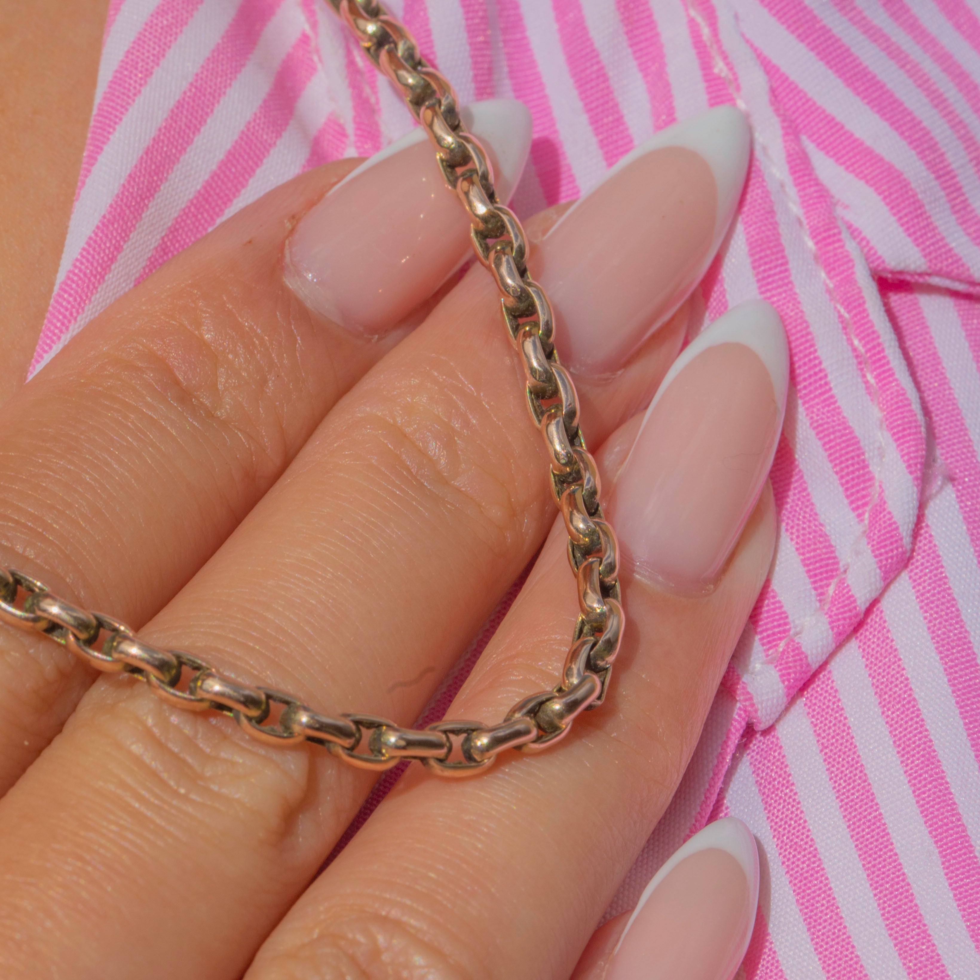 This antique belcher chain dates to the Victorian era and is crafted in solid 9ct Gold. The links have a softly rounded profile and a satisfying weight, measuring approximately 3mm wide and 20 inches in length.