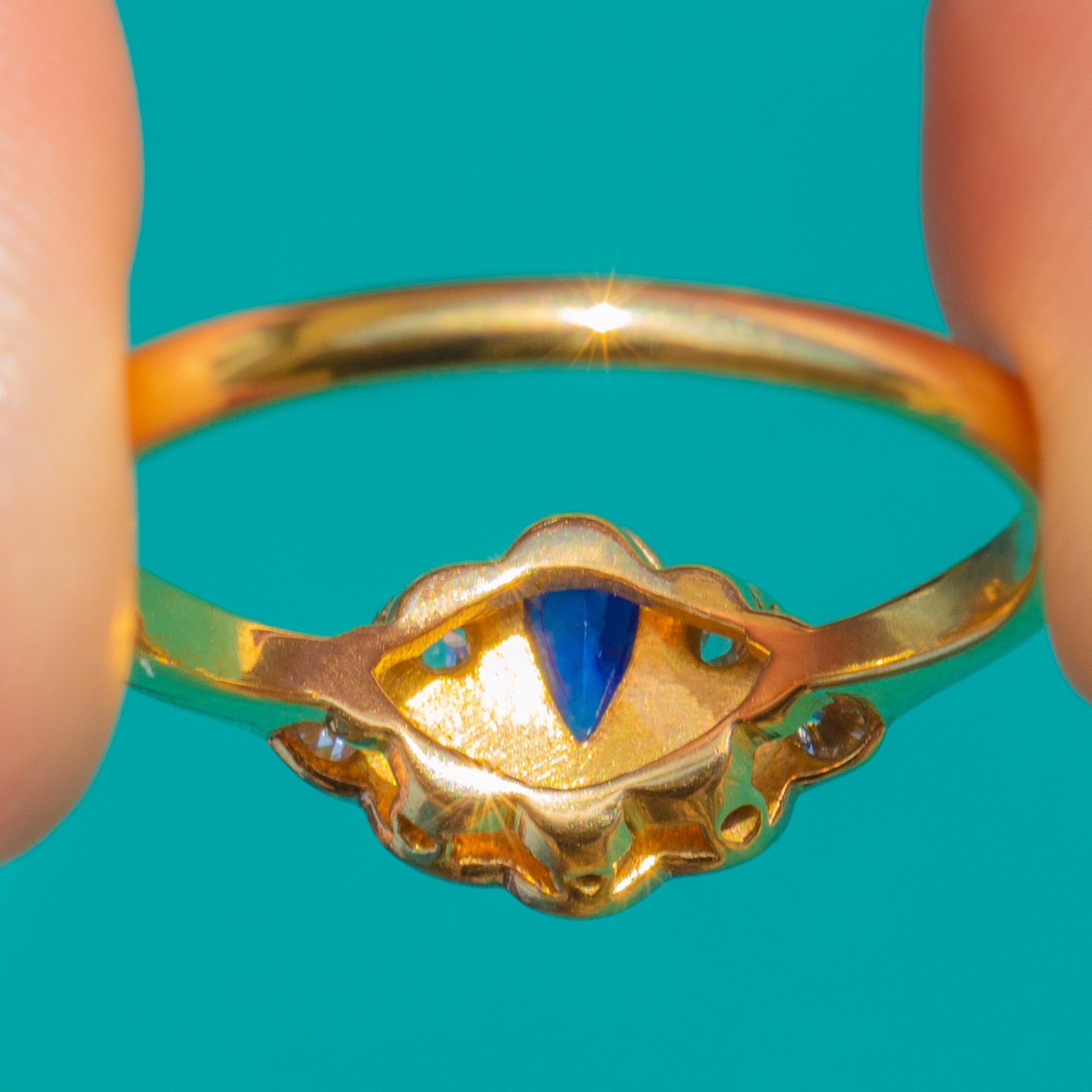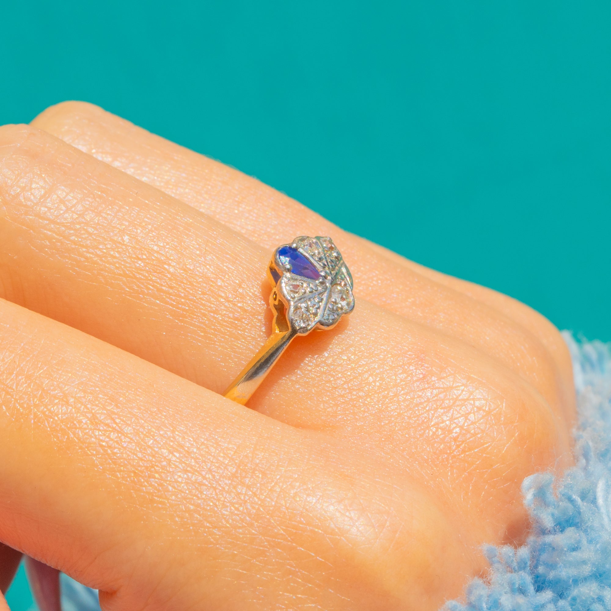 EXCELLENT: The Sapphire and Diamonds are bright with no obvious chips or abrasions, and the settings are secure with crisp milgrain detail. The 18ct Gold shank shows only light surface wear consistent with age. No visible solder repairs or evidence of previous resizing.