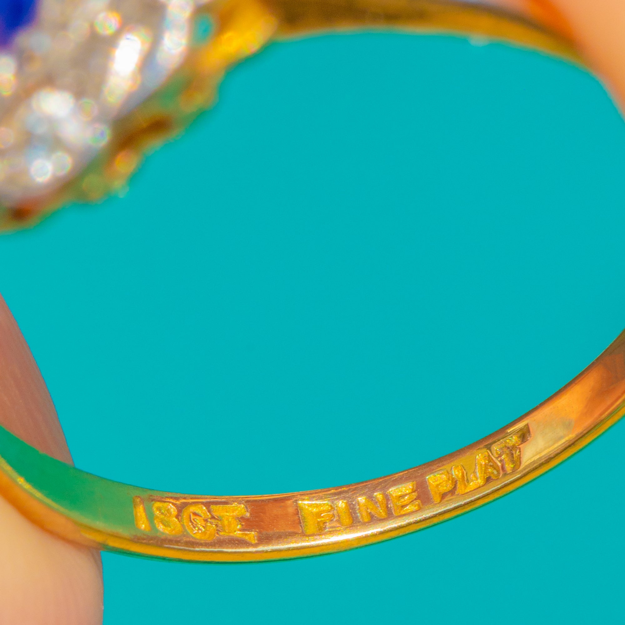 With its fan silhouette, crisp detailing and low, wearable profile, this piece captures the sleek geometry and lightness of the period. Finished with “18CT” and “FINE PLAT” stamps, it’s a charming choice for an antique engagement ring or a timeless right-hand treasure.