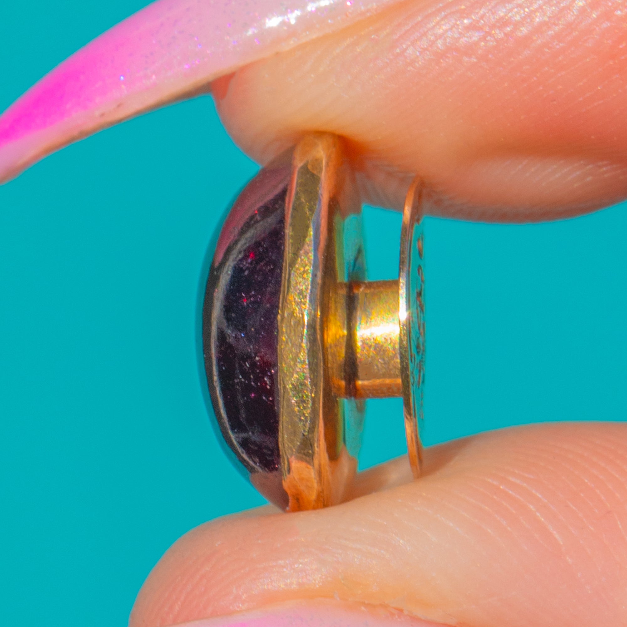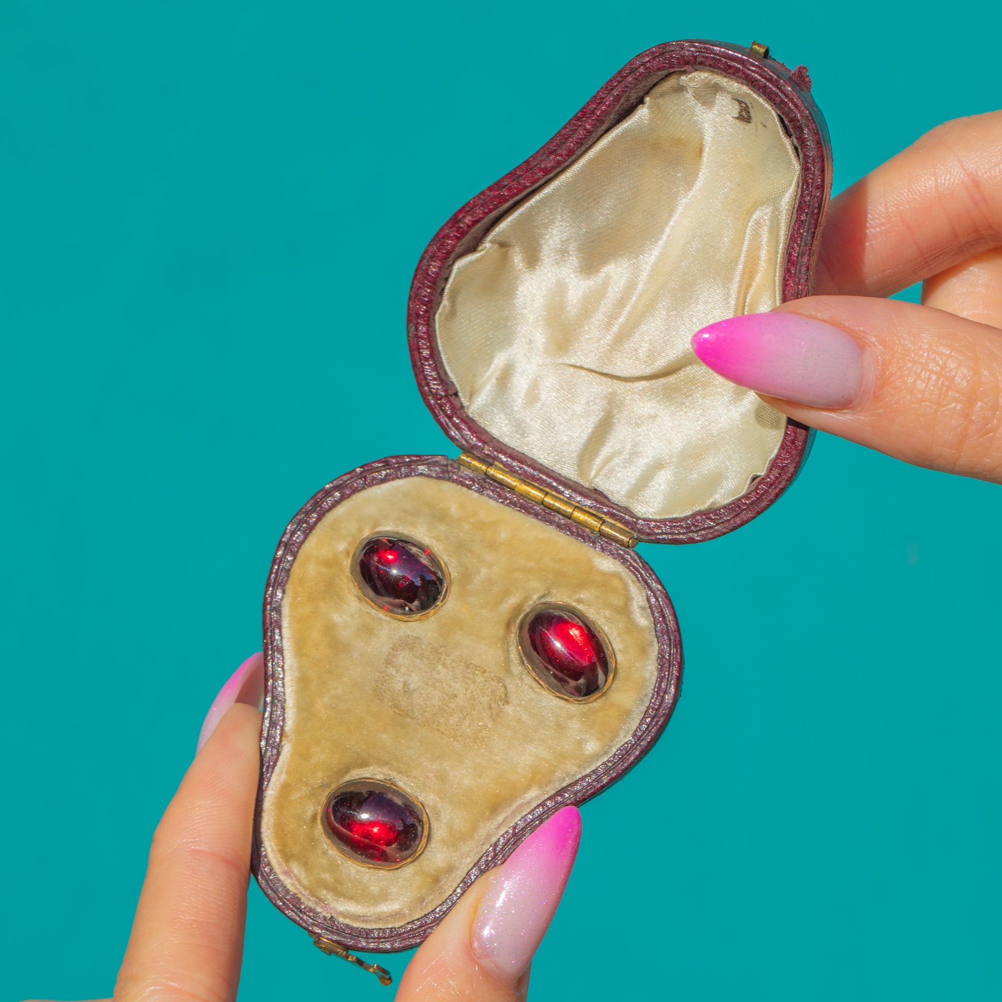 A sumptuous boxed set of Victorian Garnet dress studs crafted in 9ct Gold. Each high-domed oval cabochon glows a deep, richly saturated red, secured in sleek closed bezels that let the colour take centre stage. Turn them over to find beautifully hand-engraved backs—a discreet flourish that speaks to their quality and craftsmanship.