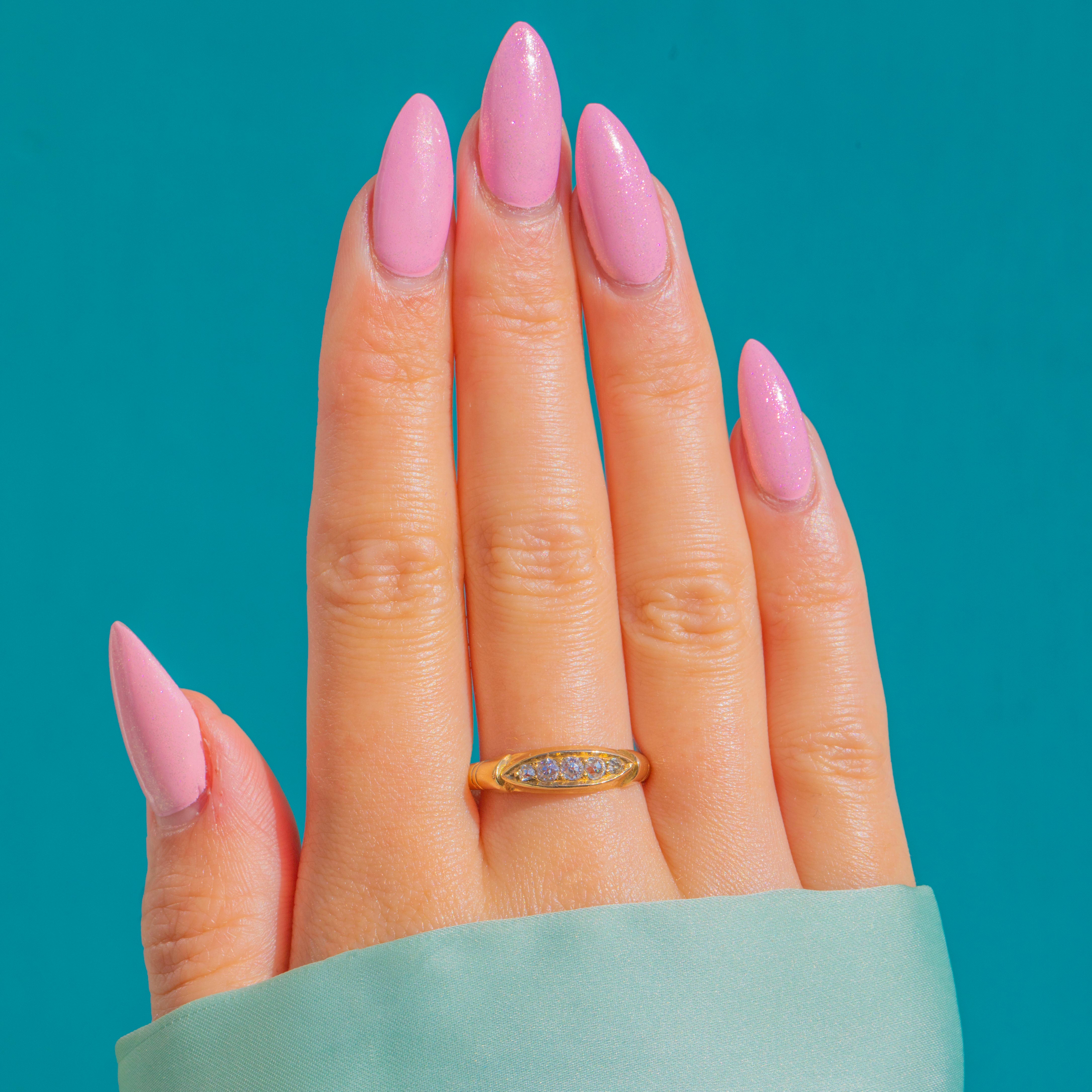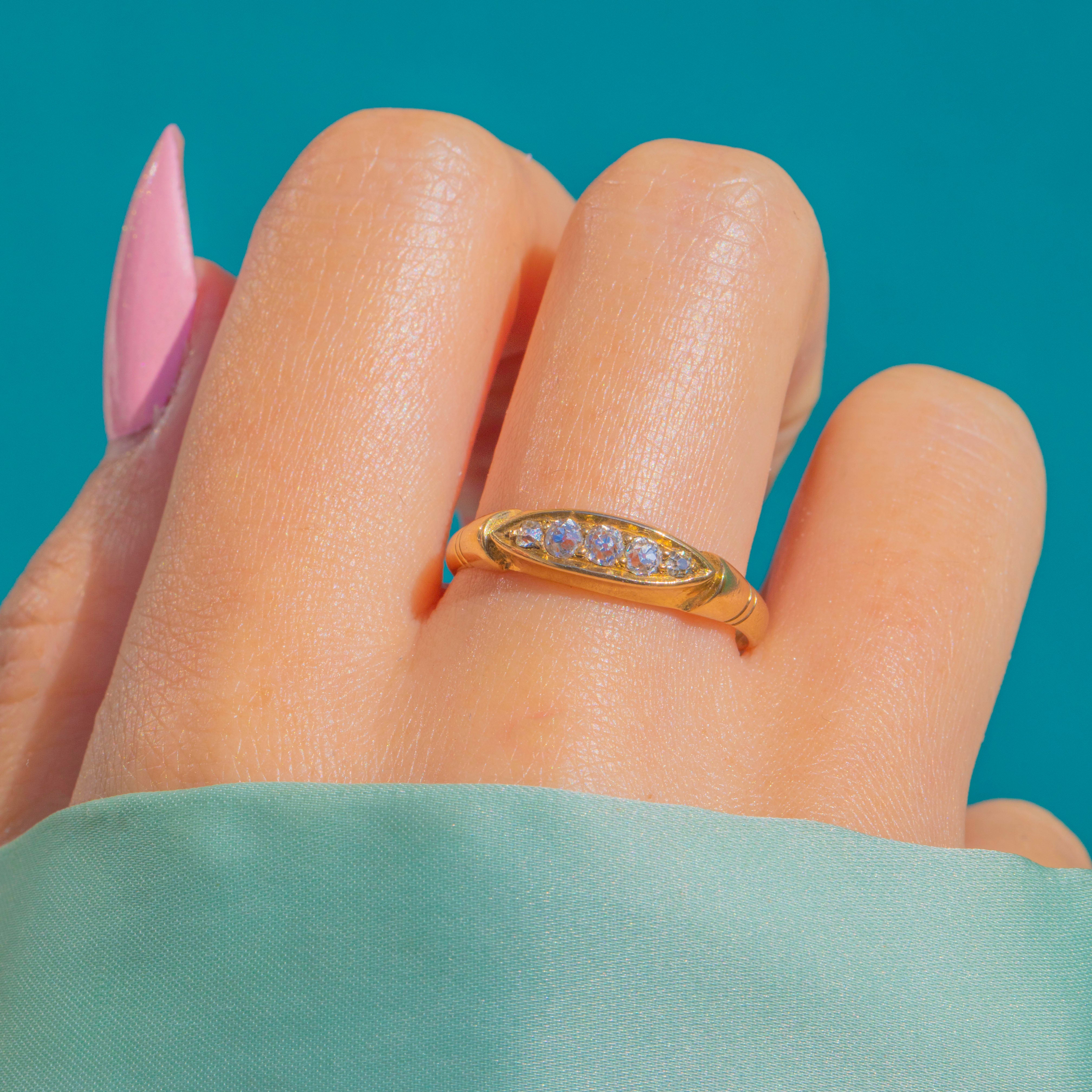 A charming Victorian five-stone “boat” ring, rendered in rich 18ct Gold and set with old mine-cut Diamonds that shimmer in a refined, linear row. Hallmarked at Chester 1897, this elegant navette plaque design captures the quiet romance of the era in a sleek, low-profile silhouette perfect for everyday wear.