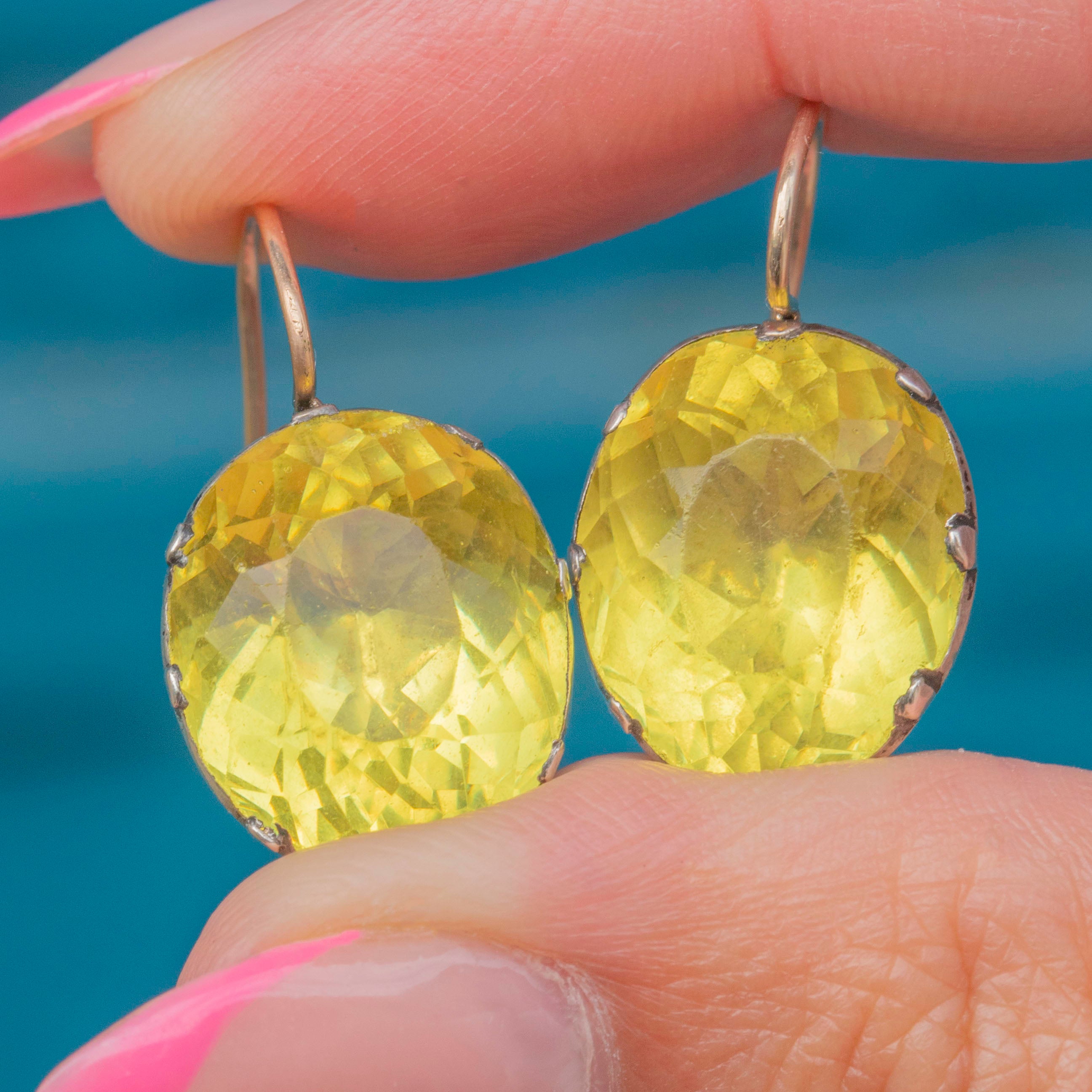 VERY GOOD: These rare Georgian Chartreuse green Paste button earrings are in very good condition. The Paste are brightly saturated and their foils show no signs of wear. Each Paste has been expertly faceted, and although there are some mild abrasions to some of the facets, these are only noticeable under close inspection and do not impact their sparkle. The Silver is lustrous, with only some minor spots of discoloration and dings commensurate with age, and each Paste is securely held in place. The Gold hooks are slender and firmly soldered, allowing you to show off these phenomenal antique Paste earrings with absolute confidence!