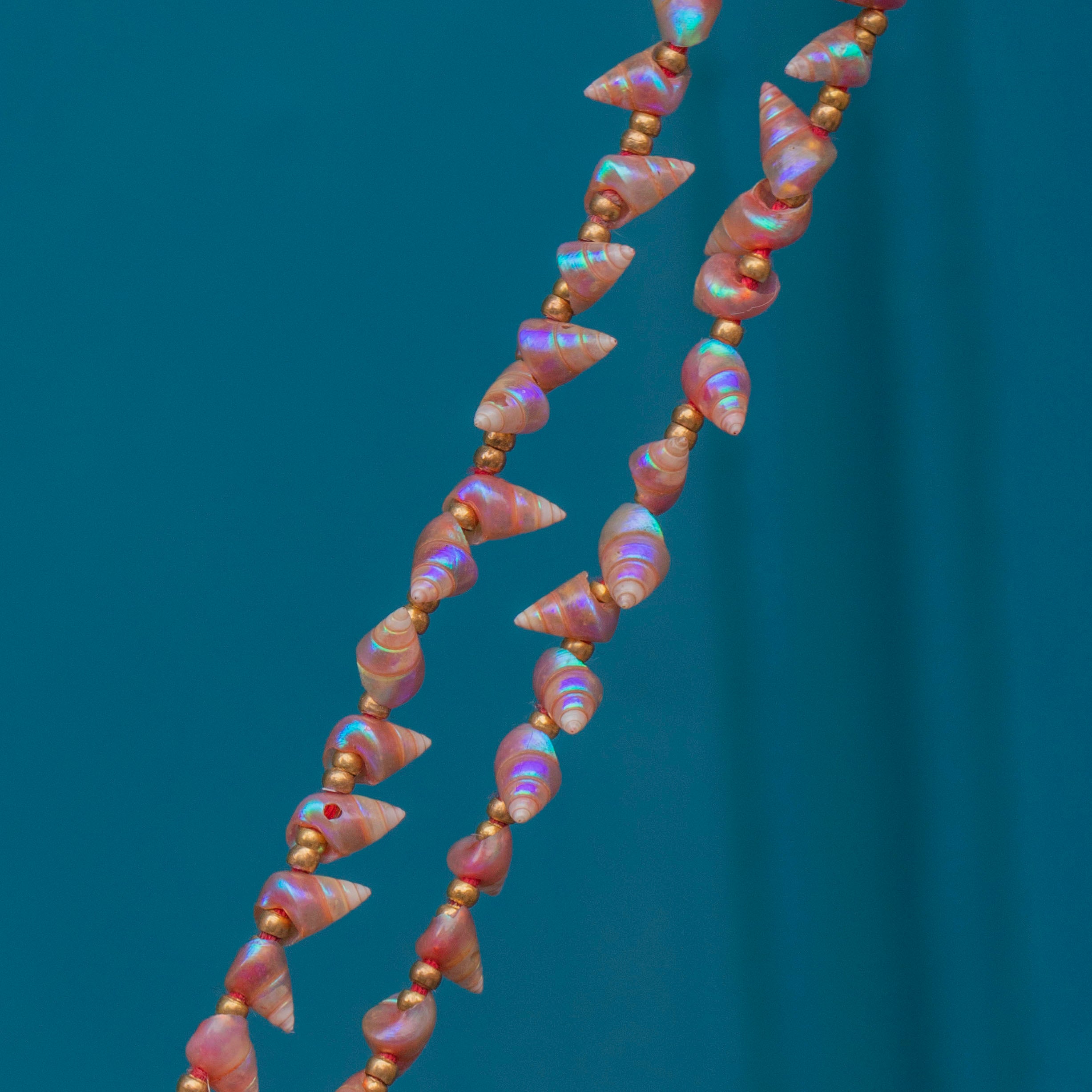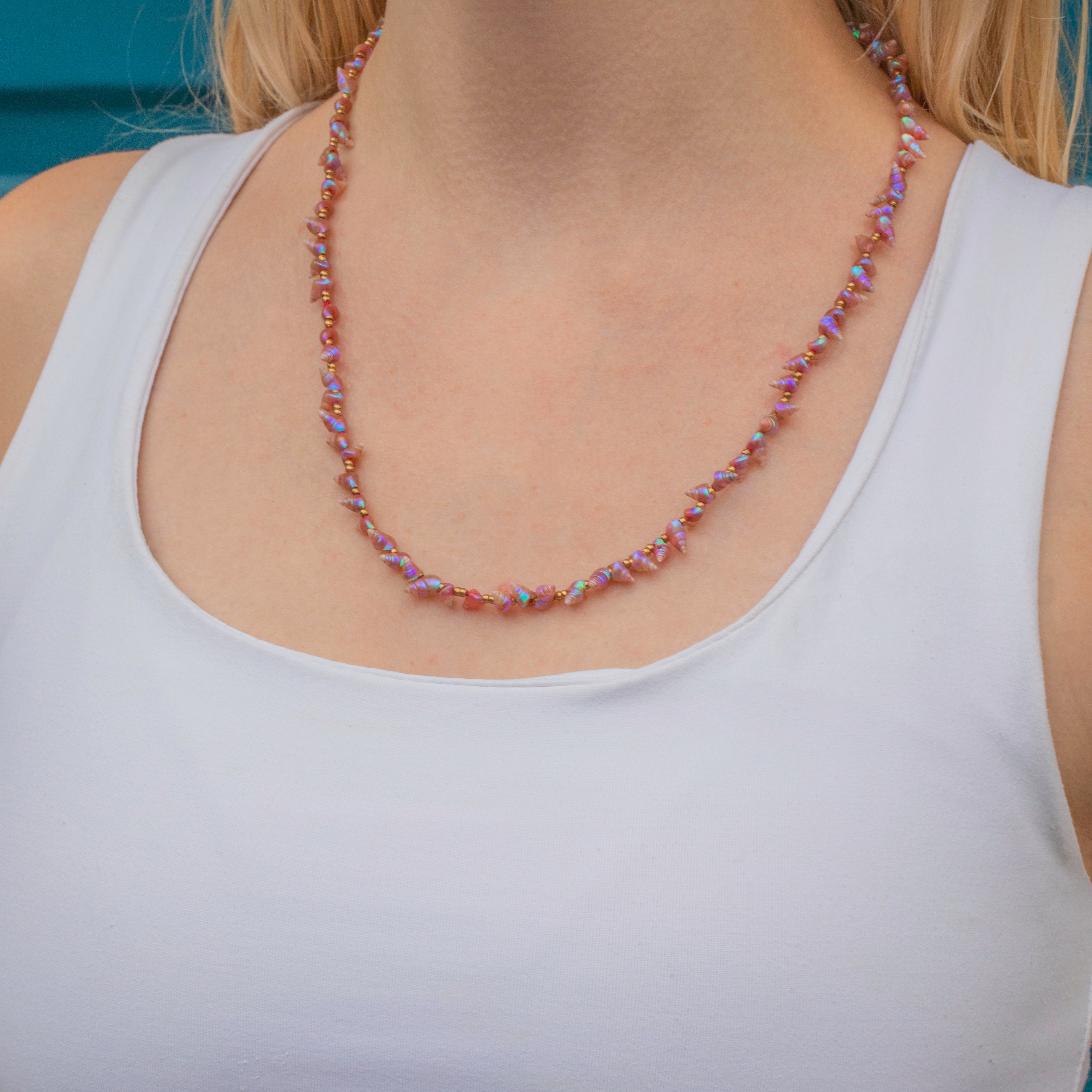 VERY GOOD. This rare pink iridescent Maireener Tasmanian shell necklace is in very good condition! The shells have a gorgeous hue and have lasted incredibly through the years. This piece should be handled with care as some of the shells are chipped which may be the condition they were picked from the shores in, however they are securely strung and have maintained their vibrant hue. This piece may have been re-strung at one point in time, as some of the shells have some pre-existing holes (through which the string would have been threaded), but this does not affect the integrity of the piece. Overall this treasure has lasted beautifully!