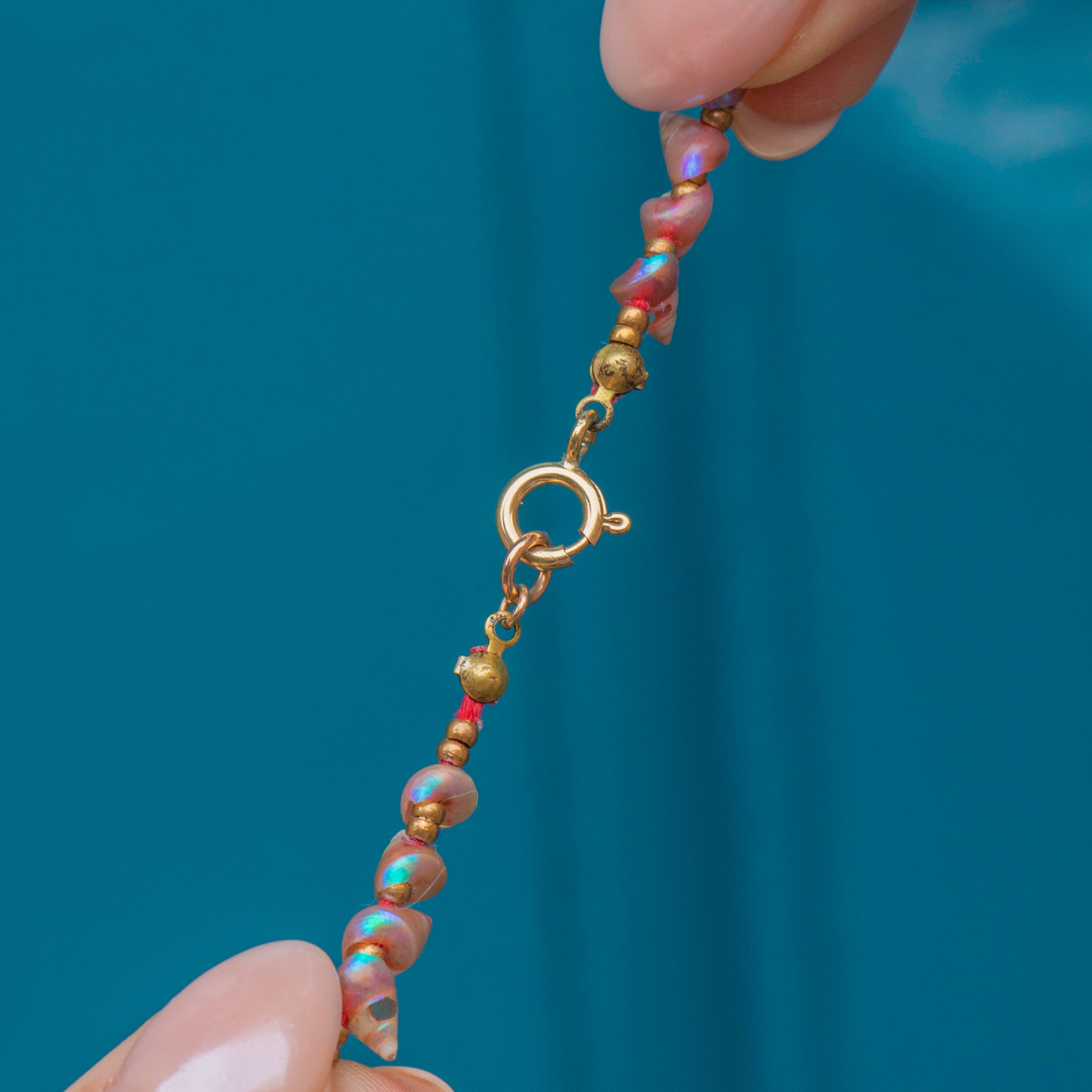 Displaying a plethora of dainty shells from the shores of Tasmania, the play of colour displayed across each of them is simply magnificent. From fuschia pinks to subtle emerald greens shimmering across their surface, this antique necklace is sure to make an impact!