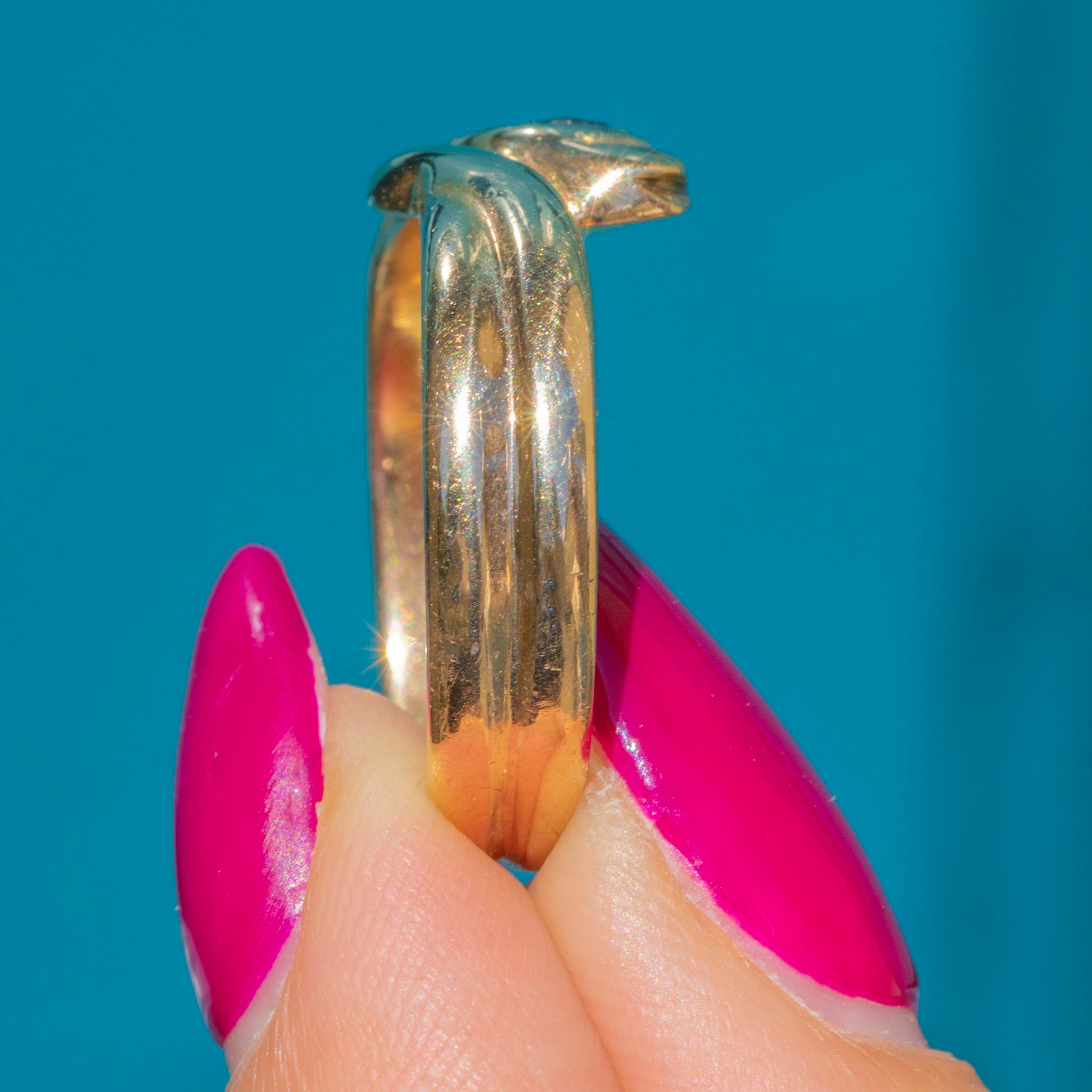 At the snake’s head sits a captivating natural 0.20ct royal Blue Sapphire, adding a touch of sophistication and character. Its polished band and low profile ensure comfortable wear, making this vintage piece a wonderful chunky addition to any collection.