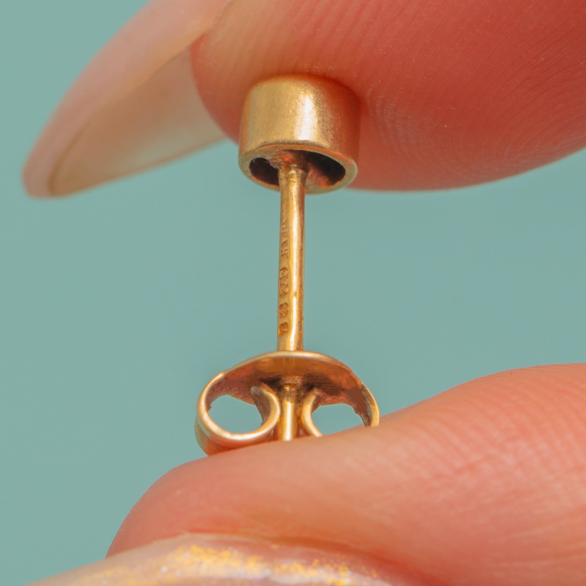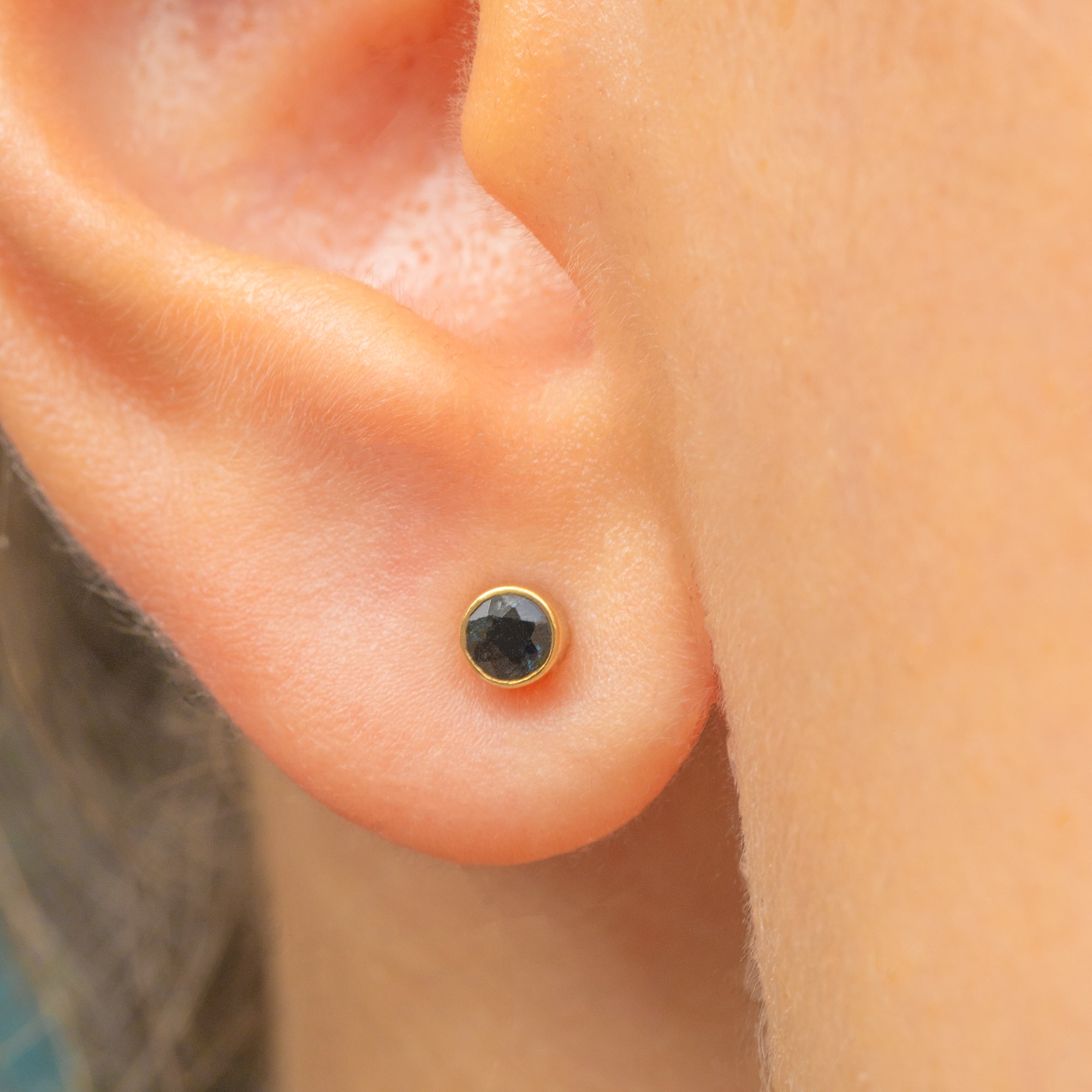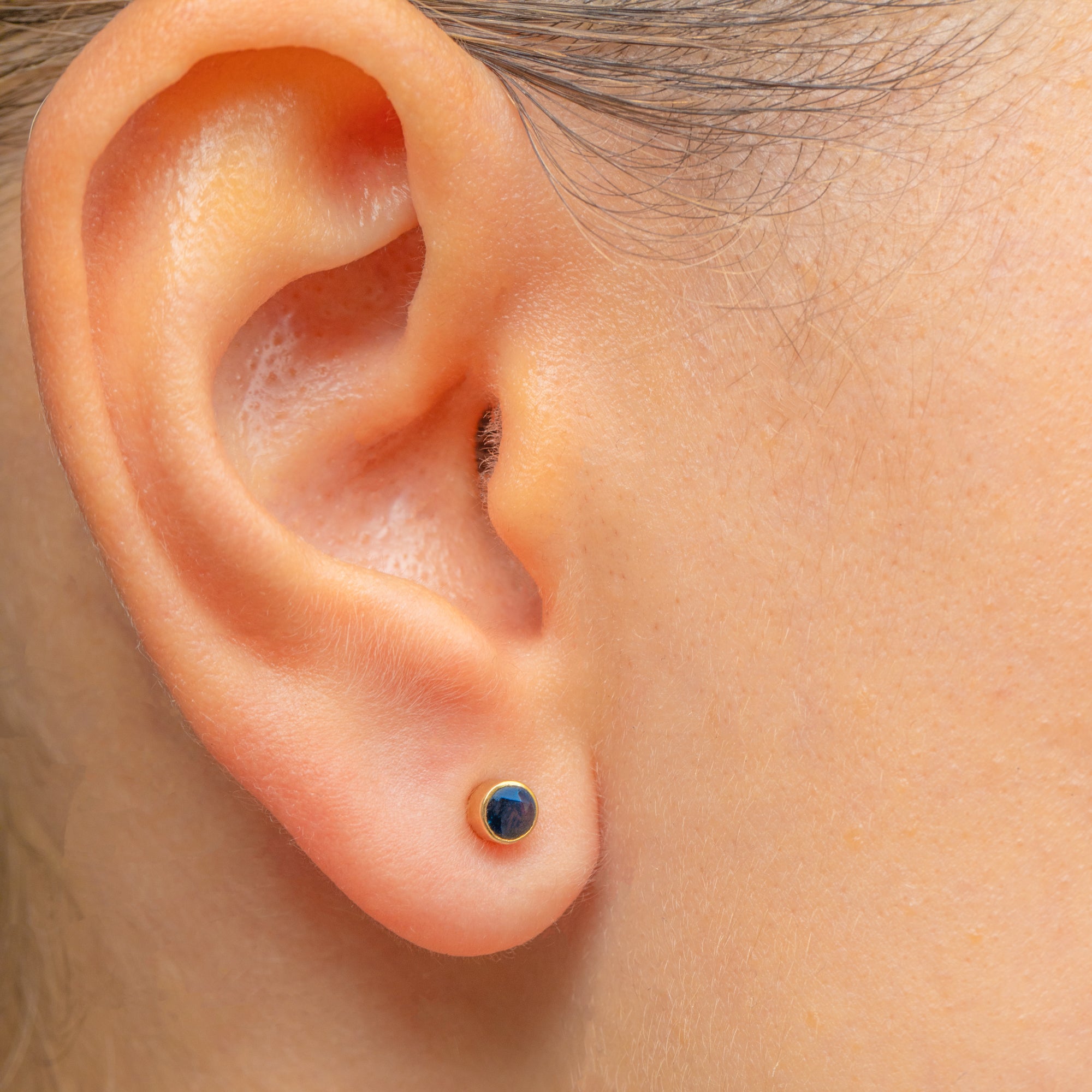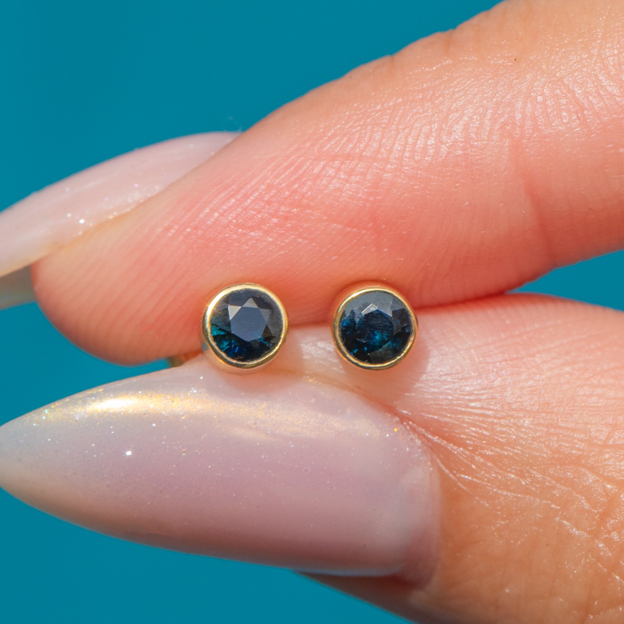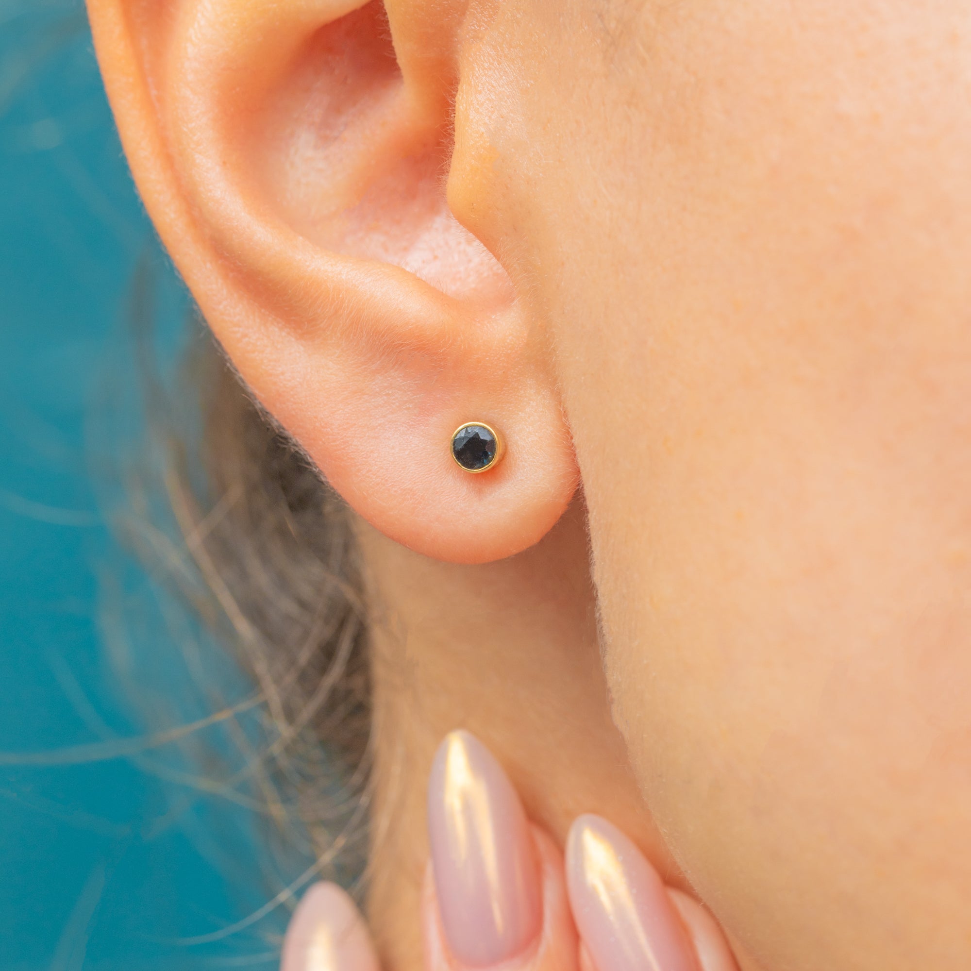 A classic pair of Vintage Sapphire bezel stud earrings set in 9ct Gold. Each earring holds a round 3.5mm Sapphire, with a combined weight of approximately 0.30ct. The deep blue Sapphires are neatly framed in smooth bezel settings, creating a timeless and versatile look.