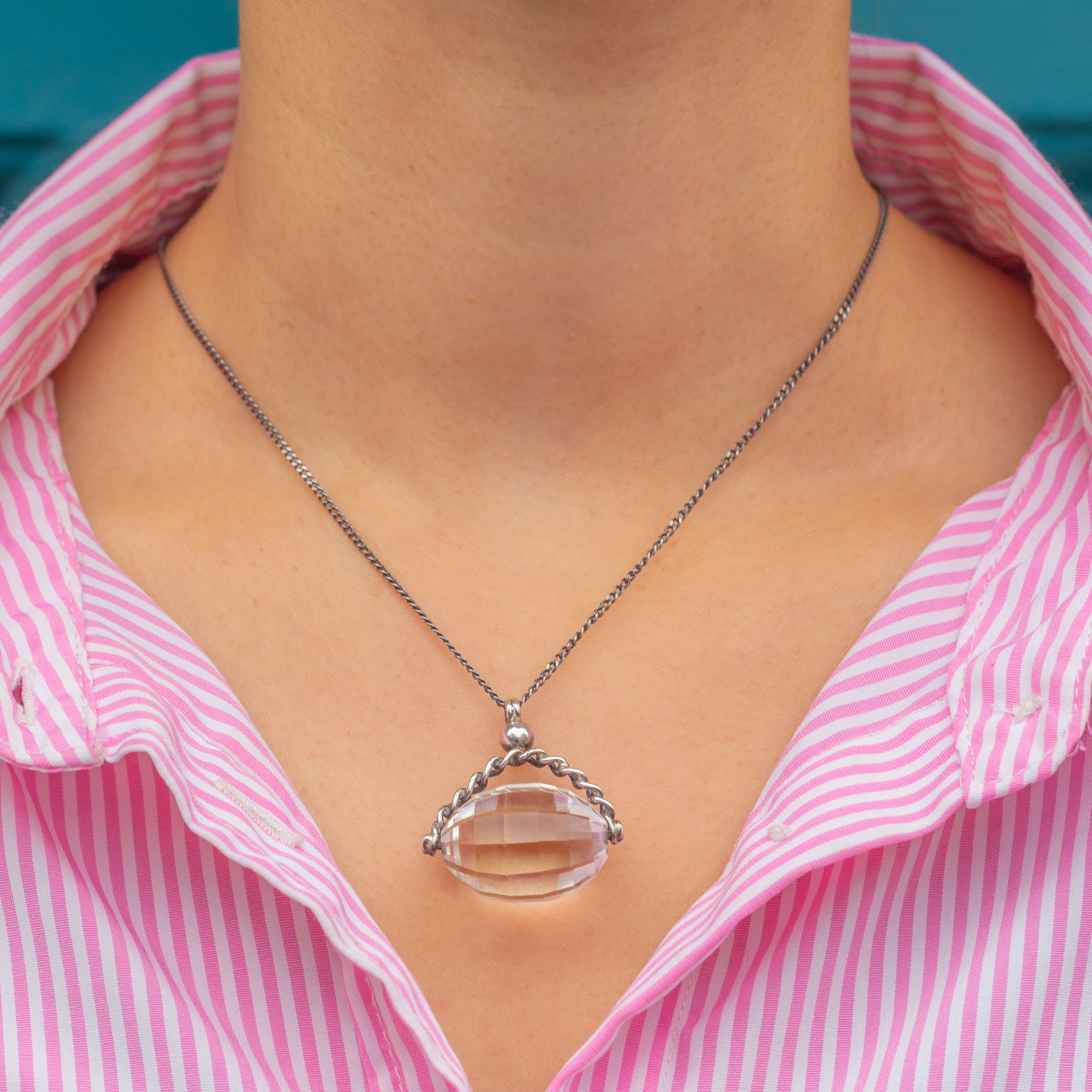 The Silver frame and twisted bar detail are typical of the hand-crafted aesthetic of the Arts & Crafts era, and the Rock Crystal spins smoothly within its setting. A wonderful statement fob or pendant, the perfect adornment for a chain.
