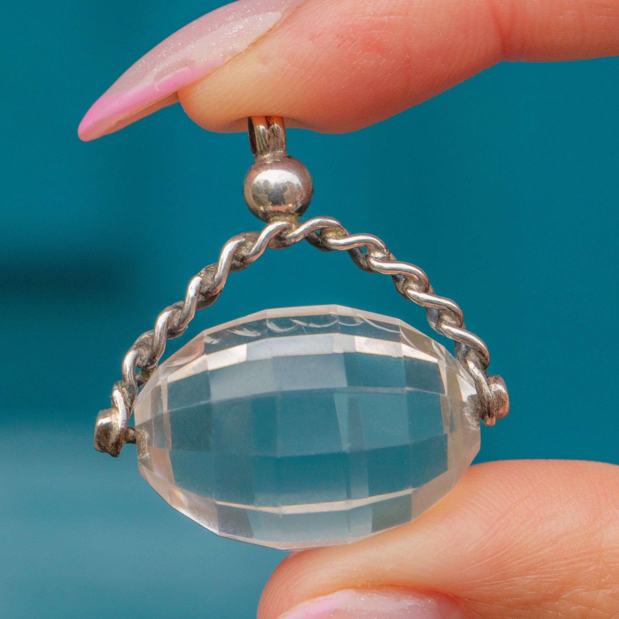 This striking Arts & Crafts spinner fob features a beautifully clear, faceted Rock Crystal encased in Sterling Silver. The gemstone catches the light from every angle, sparkling with a lively brilliance that gives the piece its playful “disco ball” charm.
