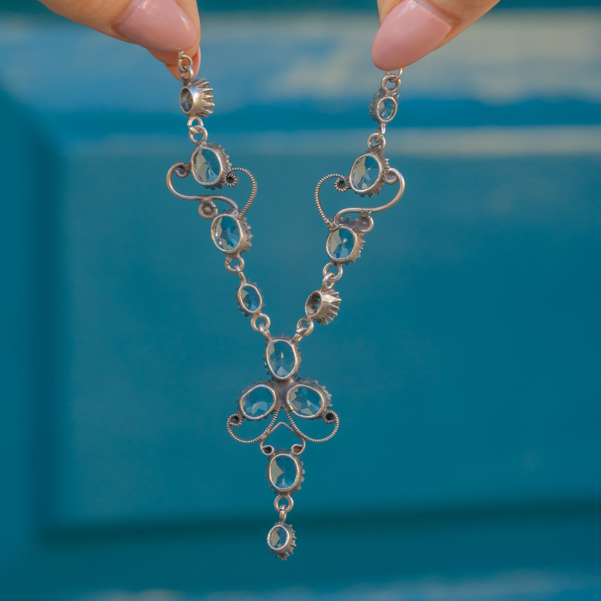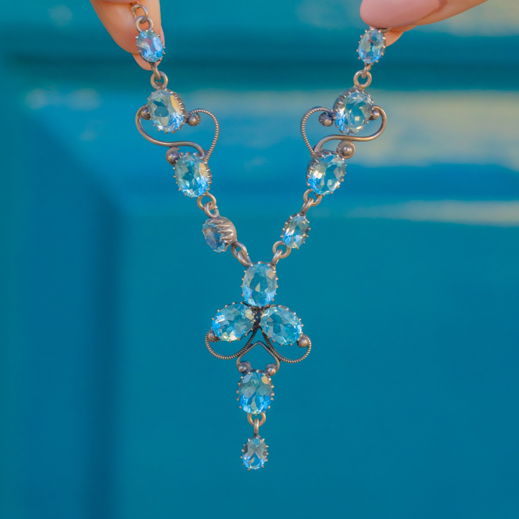 Add timeless elegance to your collection with this stunning Silver Edwardian blue Topaz drop necklace! Boasting thirteen radiant blue Topaz gemstones, this antique necklace is the perfect sophisticated occasion piece.