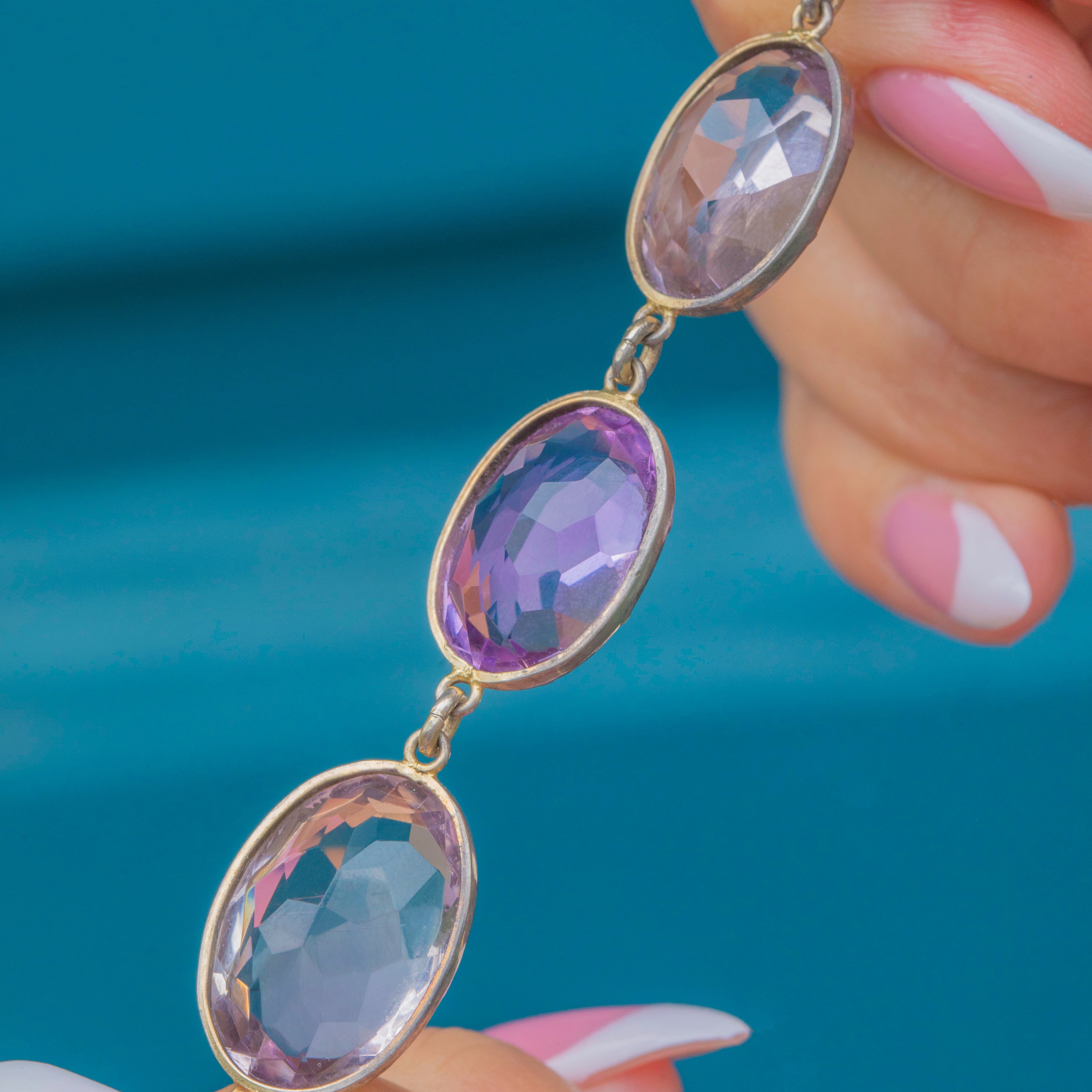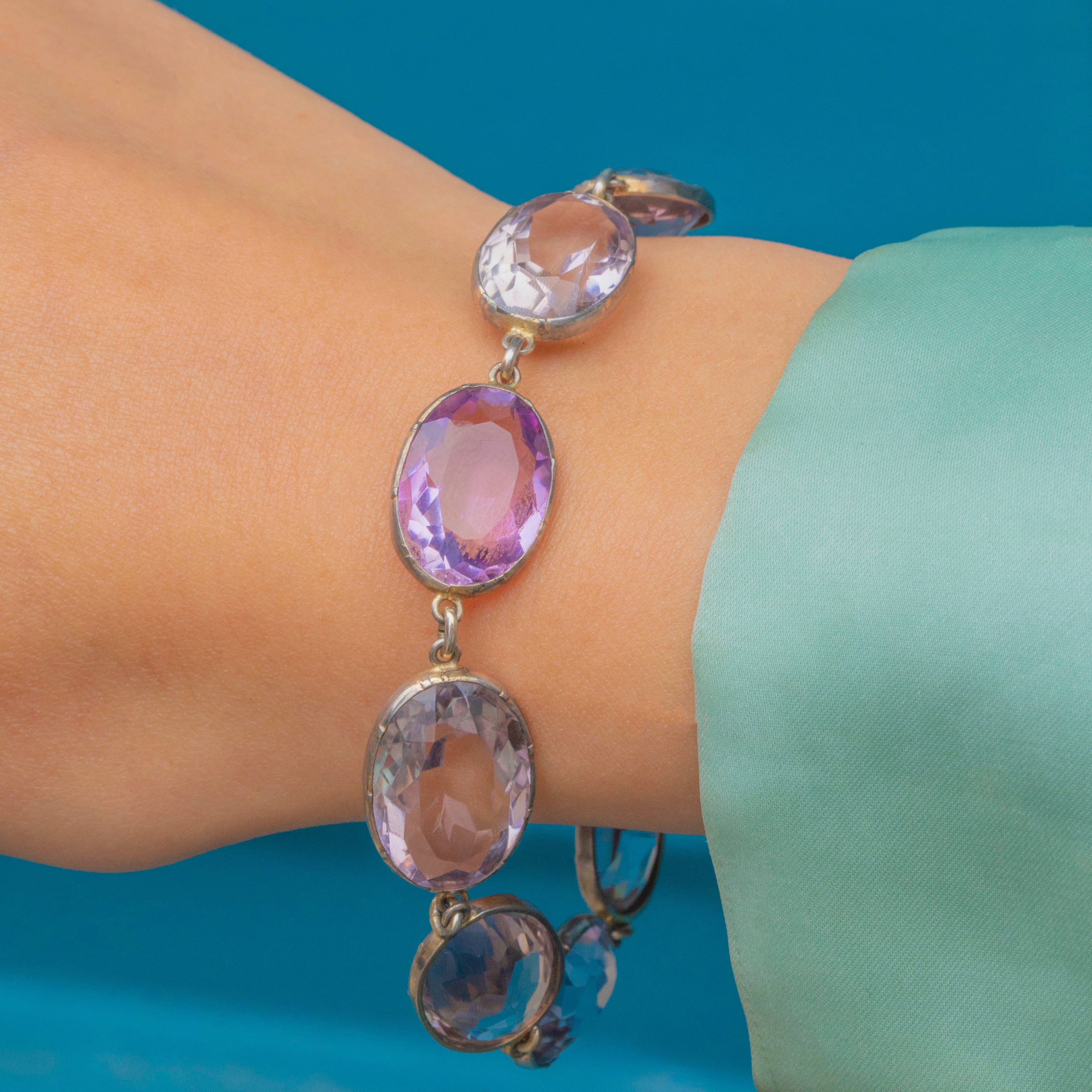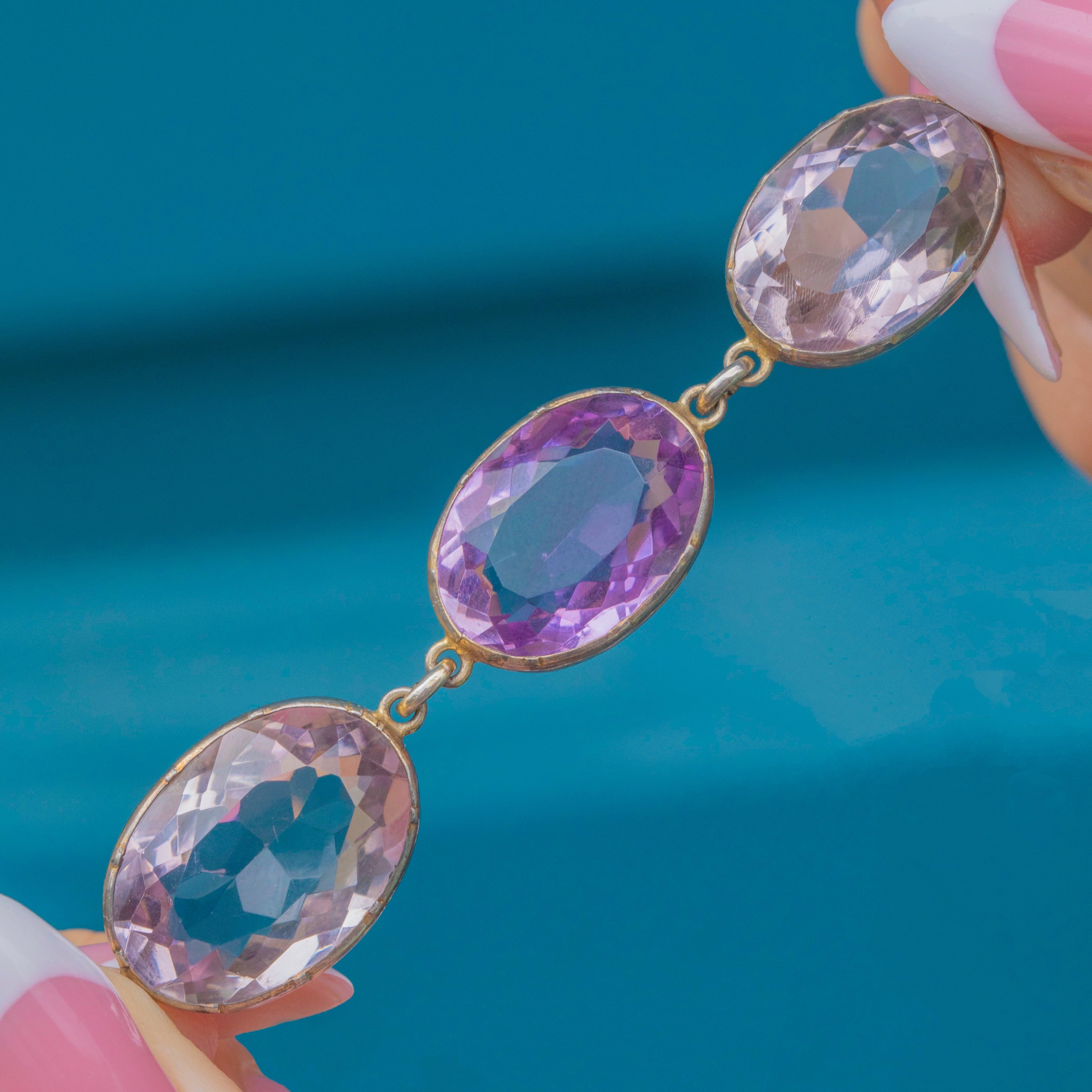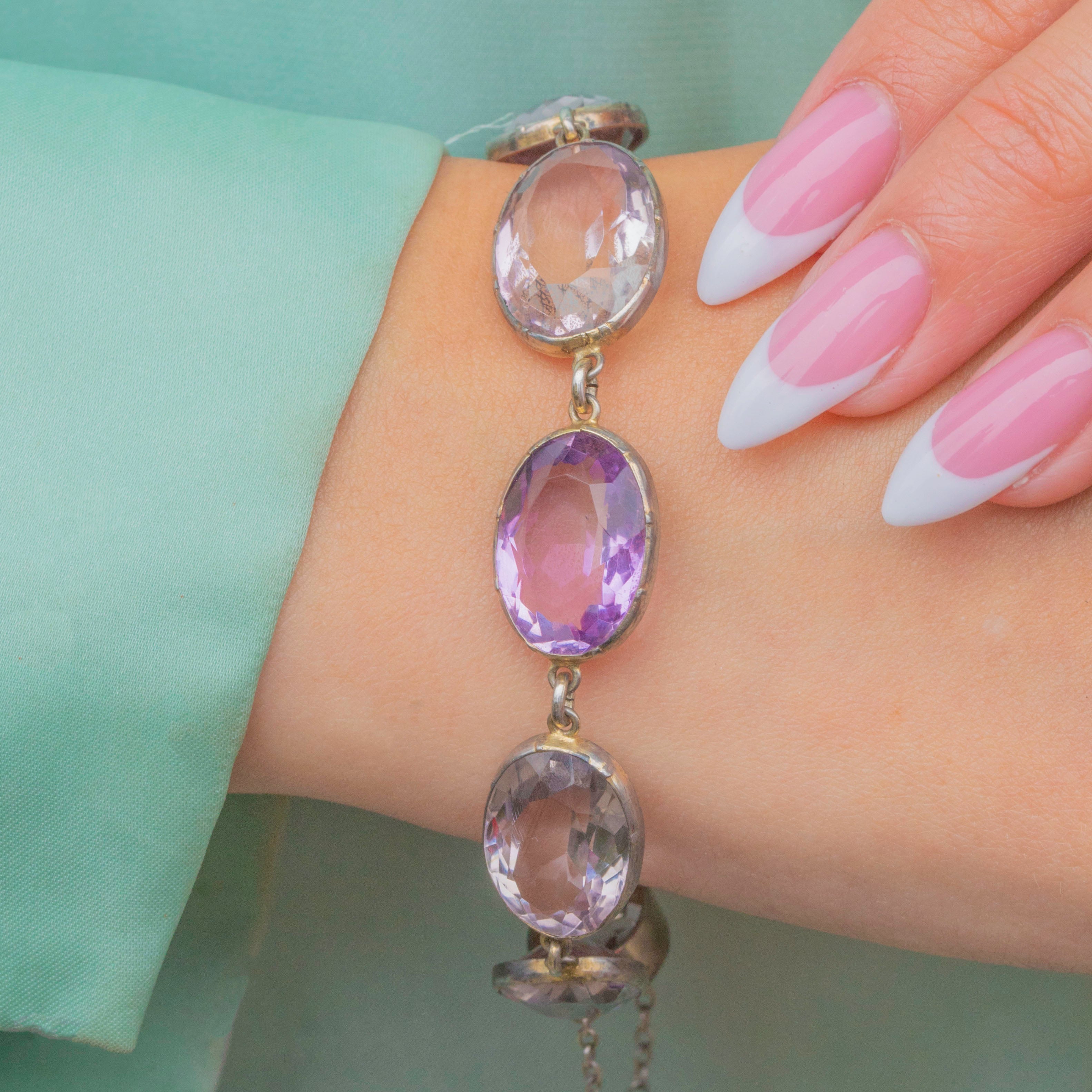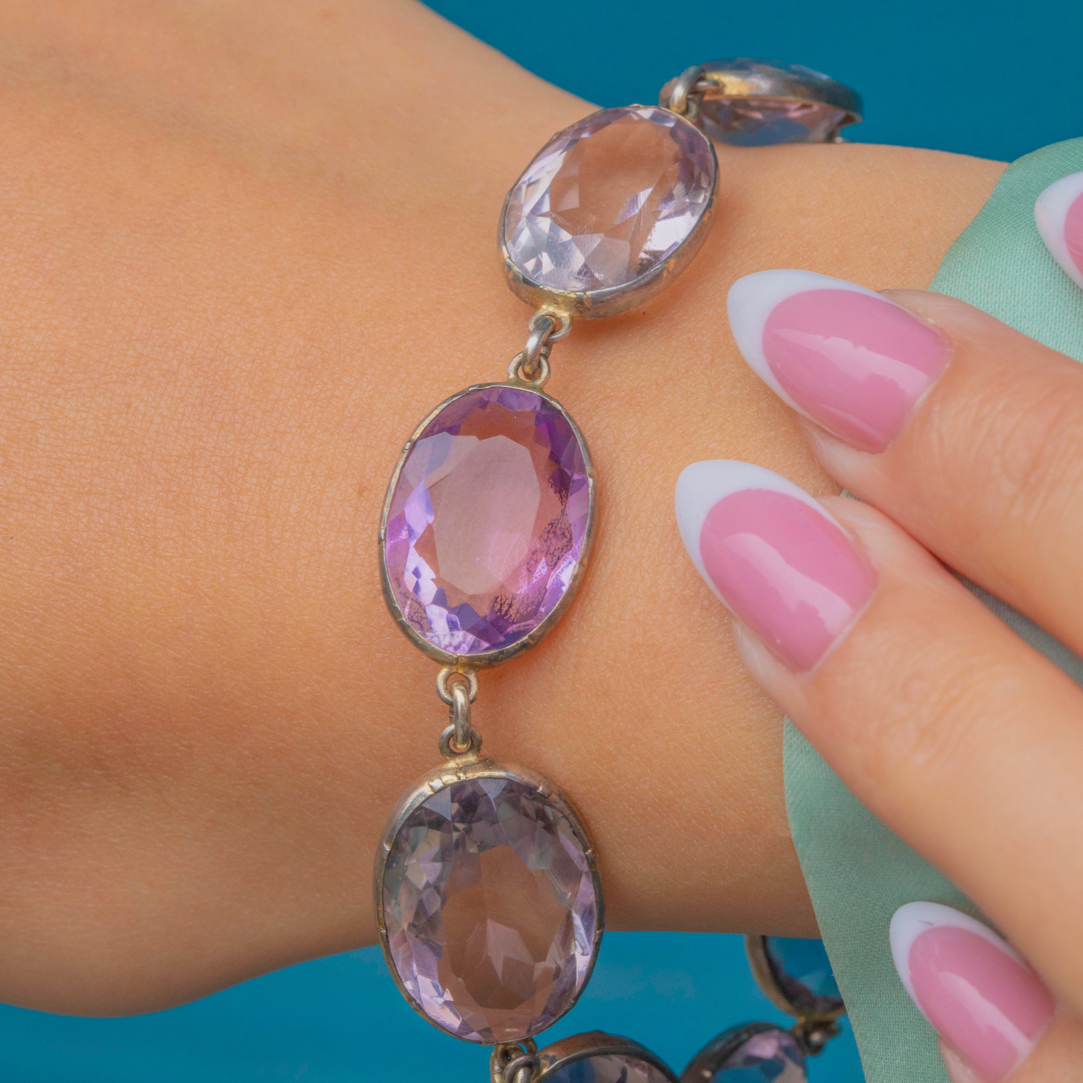 Each bezel-set Amethyst radiates delicate lavender and lilac hues from its crisp facets, making this vintage bracelet a striking yet versatile piece, perfect for adding an elegant pop of colour to your curated collection.
