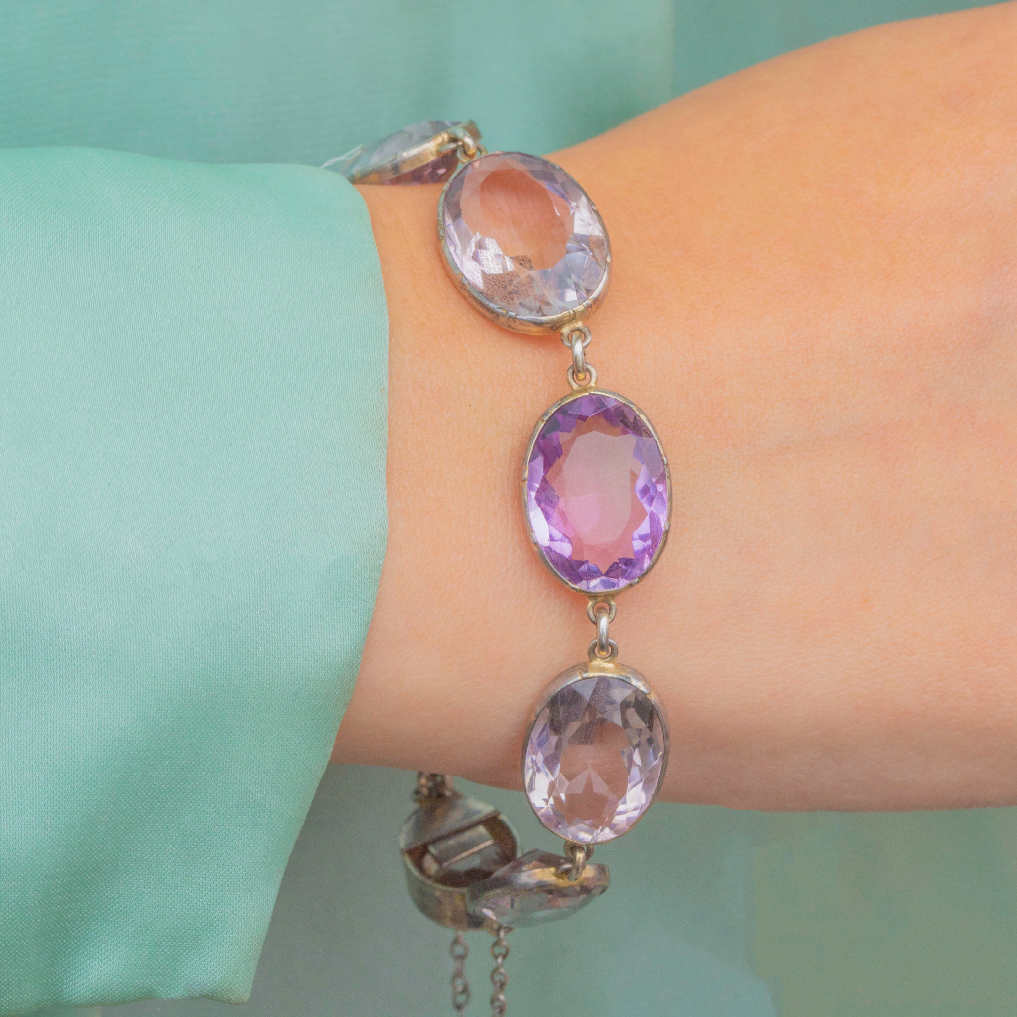 EXCELLENT: Each Amethyst is radiant and free from any notable signs of wear and set securely in its bezel. The Silver has built a nice patina with age, adding to its vintage charm. With its clasp in perfect working order and a safety chain for added security, you can wear this vintage Amethyst bracelet with confidence!