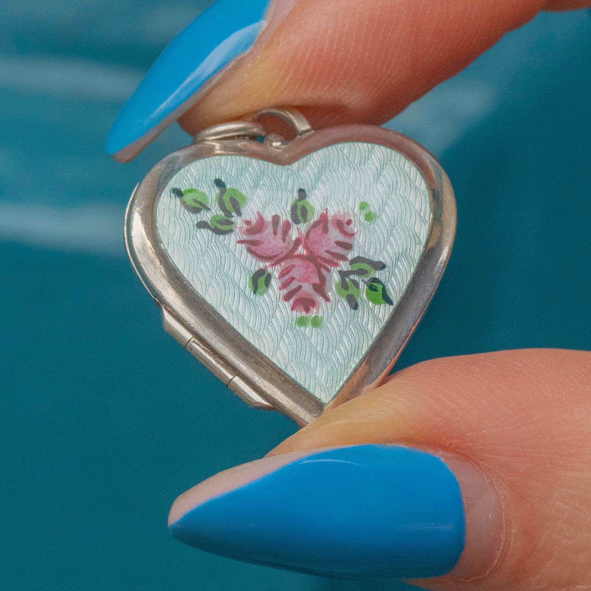 EXCELLENT. This Silver Guilloche Enamel heart locket is in excellent condition, with vibrant Enamel and well-preserved hand-painted pink roses. Her Silver shows a light patina, adding to her charm, and the hinge and clasp are secure. A beautifully maintained piece, ready to be cherished for decades more!