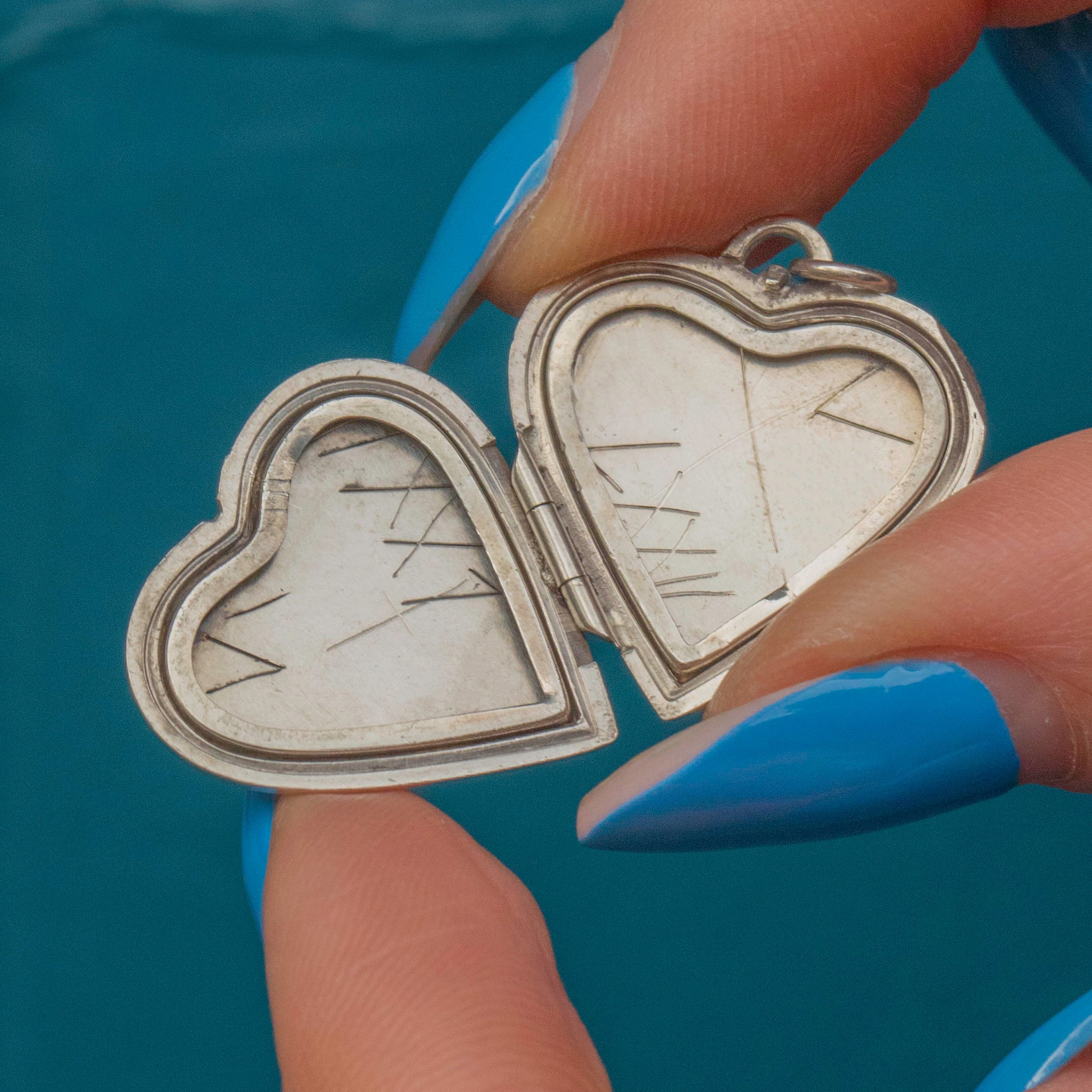 Crafted from gleaming Silver, this Art Deco locket opens to reveal space for two cherished photos to be placed inside. Her classic heart shape and exquisite detailing make her a thoughtful gift for someone special or a treasured addition to your jewellery collection.