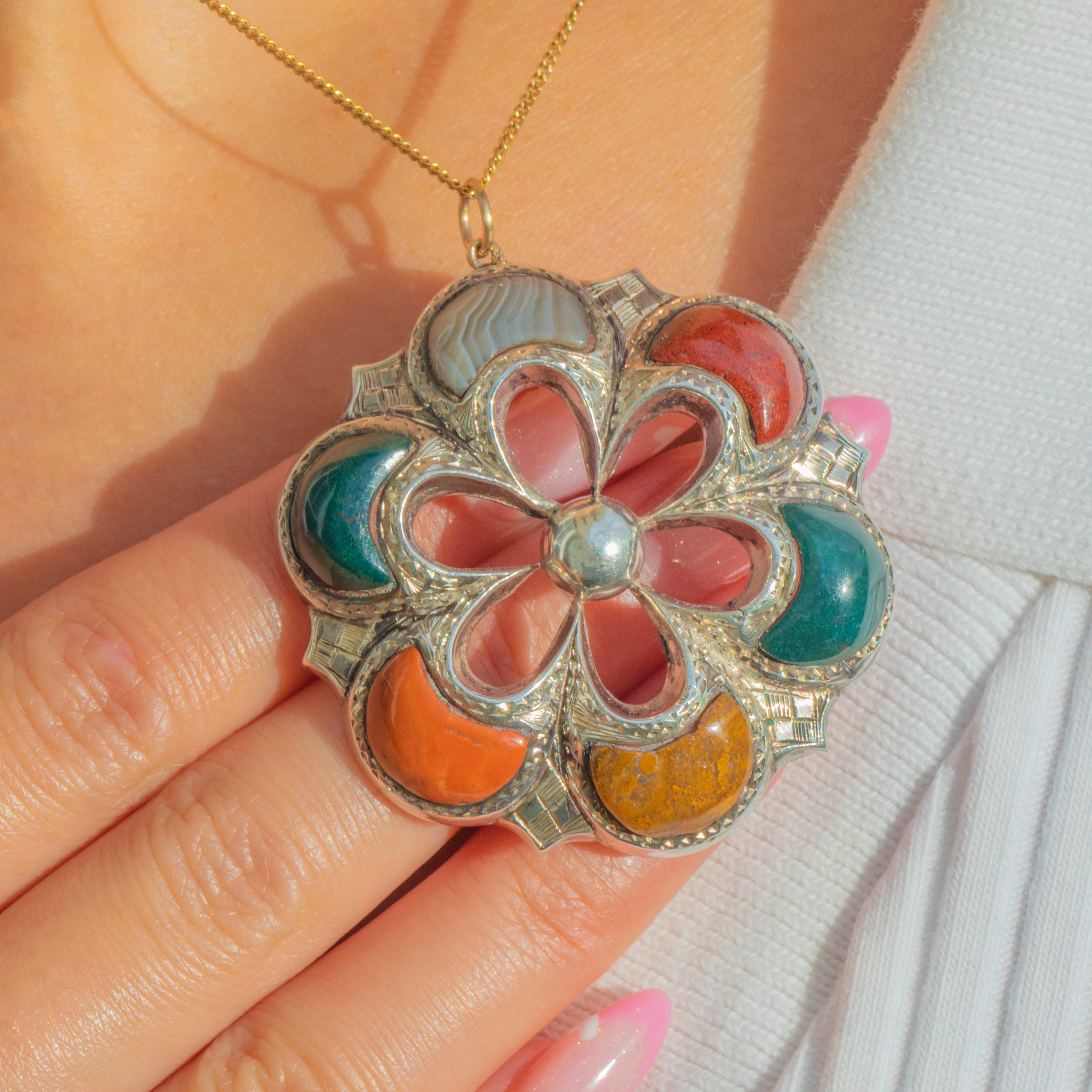 This striking antique Scottish Agate pendant embodies the bold spirit of 19th-century Scottish jewellery. Crafted in solid Sterling Silver, the circular form is beautifully inlaid with richly coloured Agate panels, each showing natural banding and earthy tones unique to Scotland’s landscape.