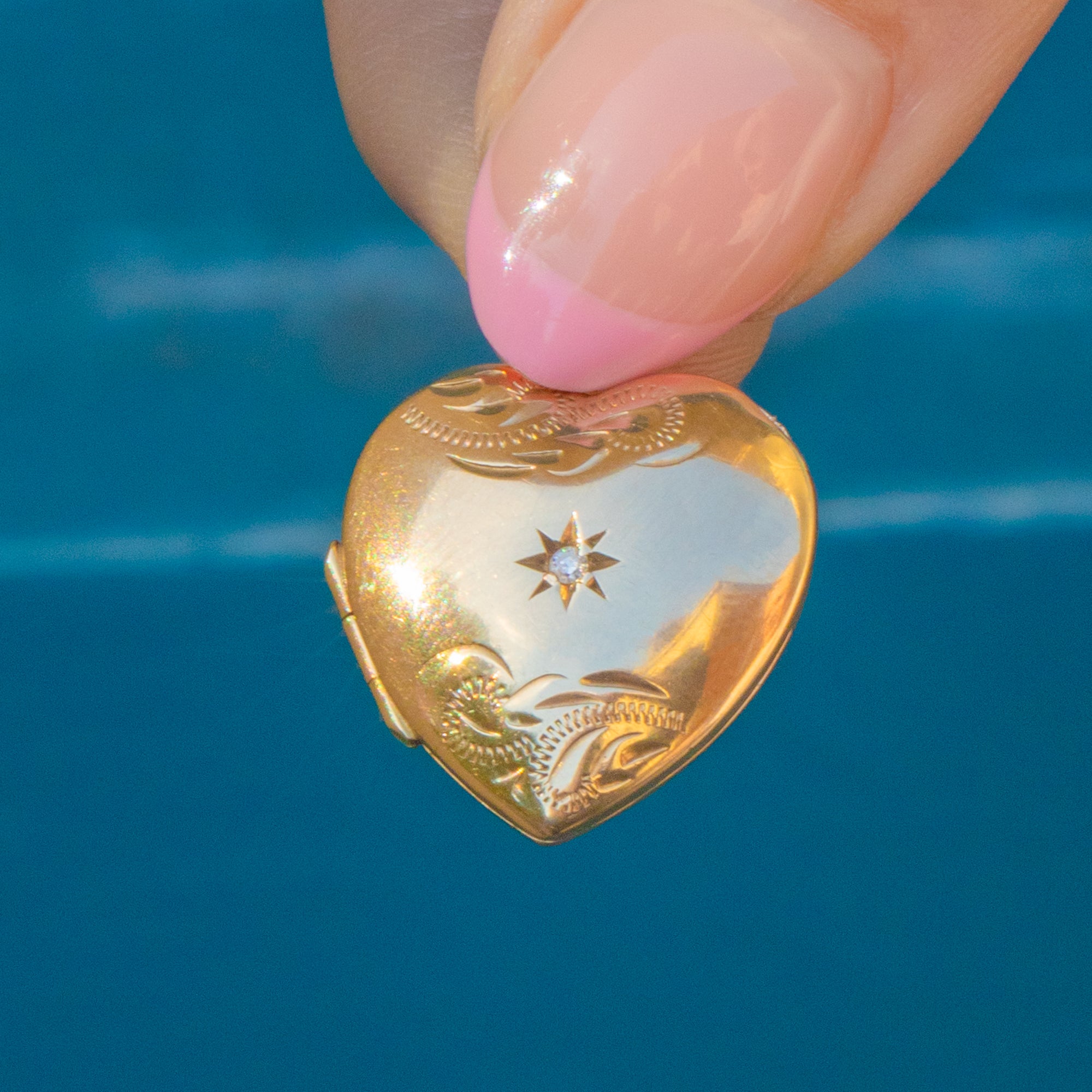 VERY GOOD. This solid 9ct Gold Diamond set heart locket is in very good vintage condition and has no noticeable wear across her front and back. While she fastens securely with a satisfying "click", she has some wear around her opening area, meaning opening her can be a bit fiddly, but rest assured she will keep your most cherished photos securely inside. Her Diamond is secure within her star setting; this solid Gold locket is perfect to be worn as part of your everyday wardrobe!