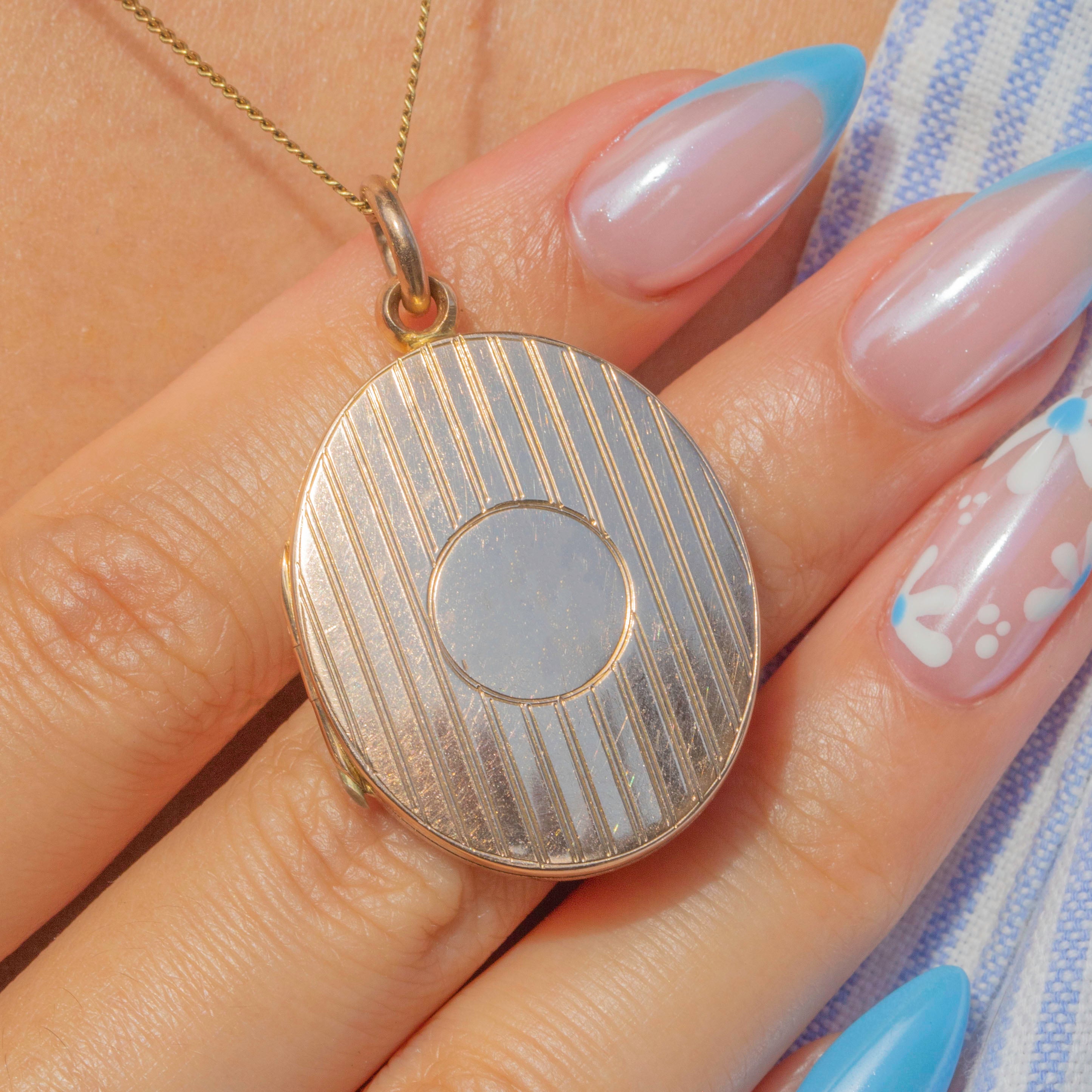 This wonderful Art Deco locket has been crafted from solid 9ct Gold and displays a striking pinstriped design that catches the light beautifully, creating an interesting visual effect.
