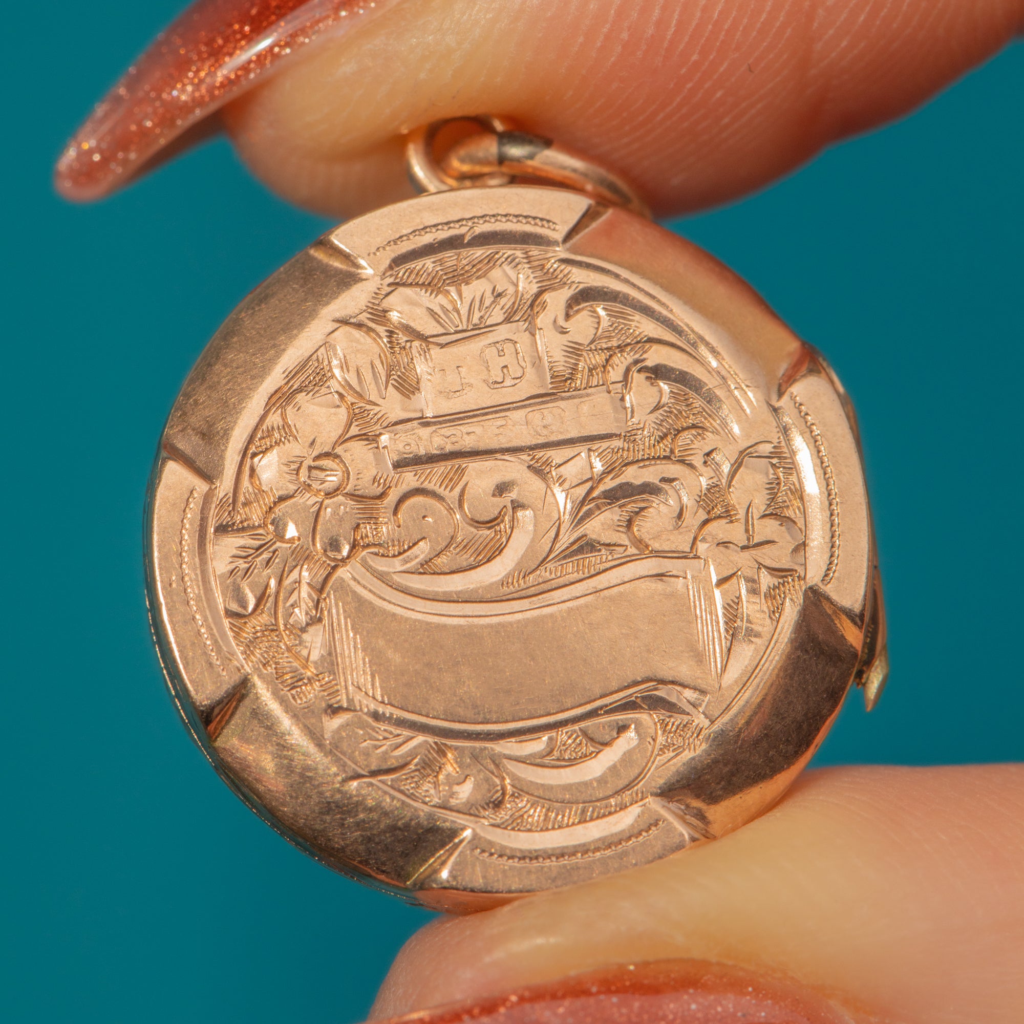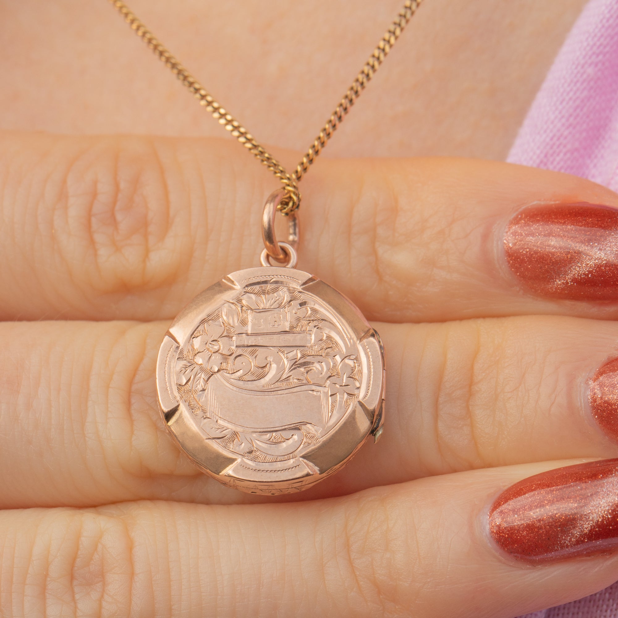 EXCELLENT. This solid 9ct Gold engraved round locket is in excellent condition. The Gold is buttery with a lovely rosy tint and opens to reveal two doors with solid Gold frames - there is some mild wear on the inside of the doors, but this will be hidden once your chosen photos have been addded. The engraved details are crisp and the extrior of the locket is free from dings, and closes securely allowing you to use and wear this Victorian engraved locket with absolute confidence!