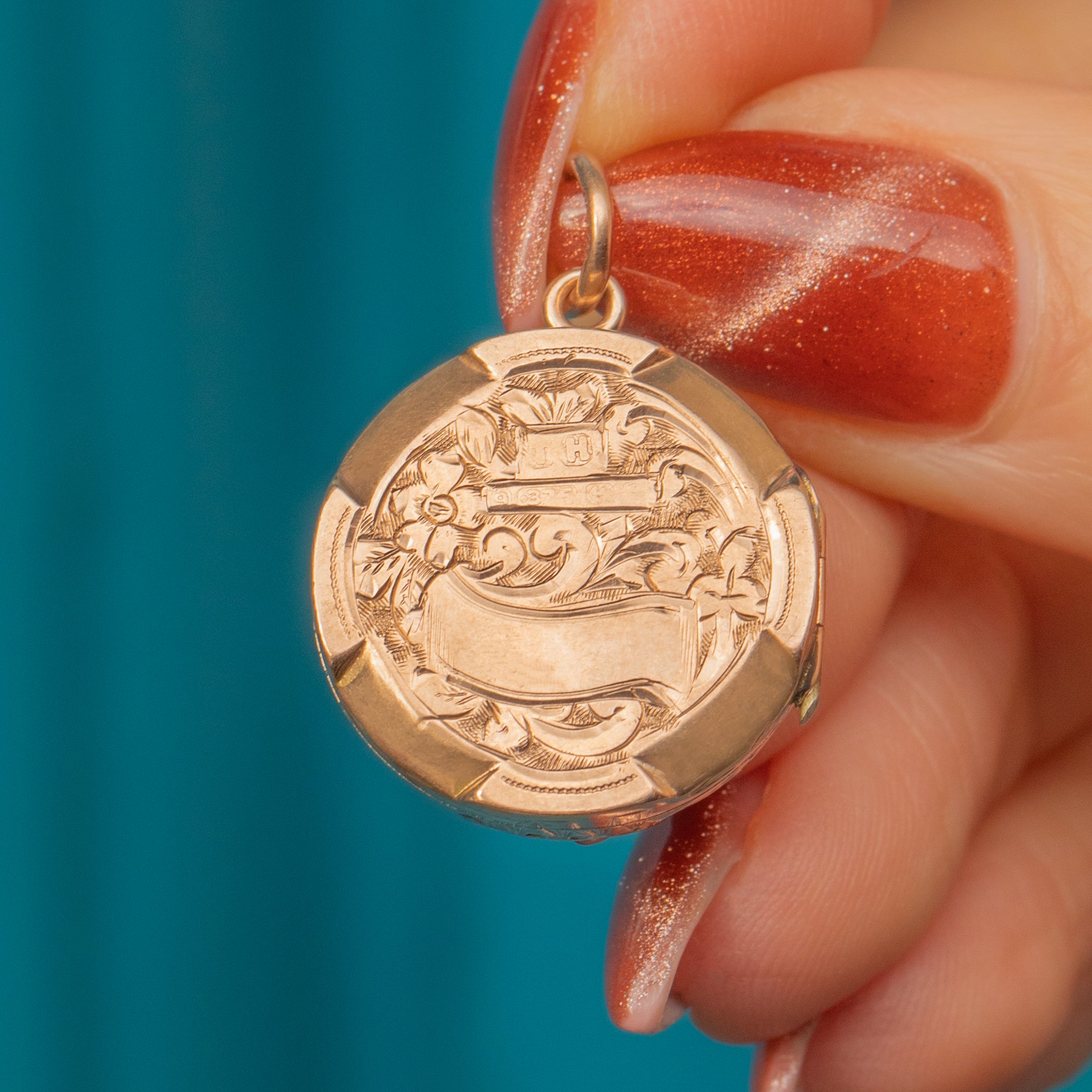 This magnificent solid 9ct Gold round locket is the perfect new abode for two of your most precious photographs! Crafted from solid Gold, this Victorian locket displays sweeping acanthus engravings and dainty forget-me-nots on both sides that catch the light wonderfully.