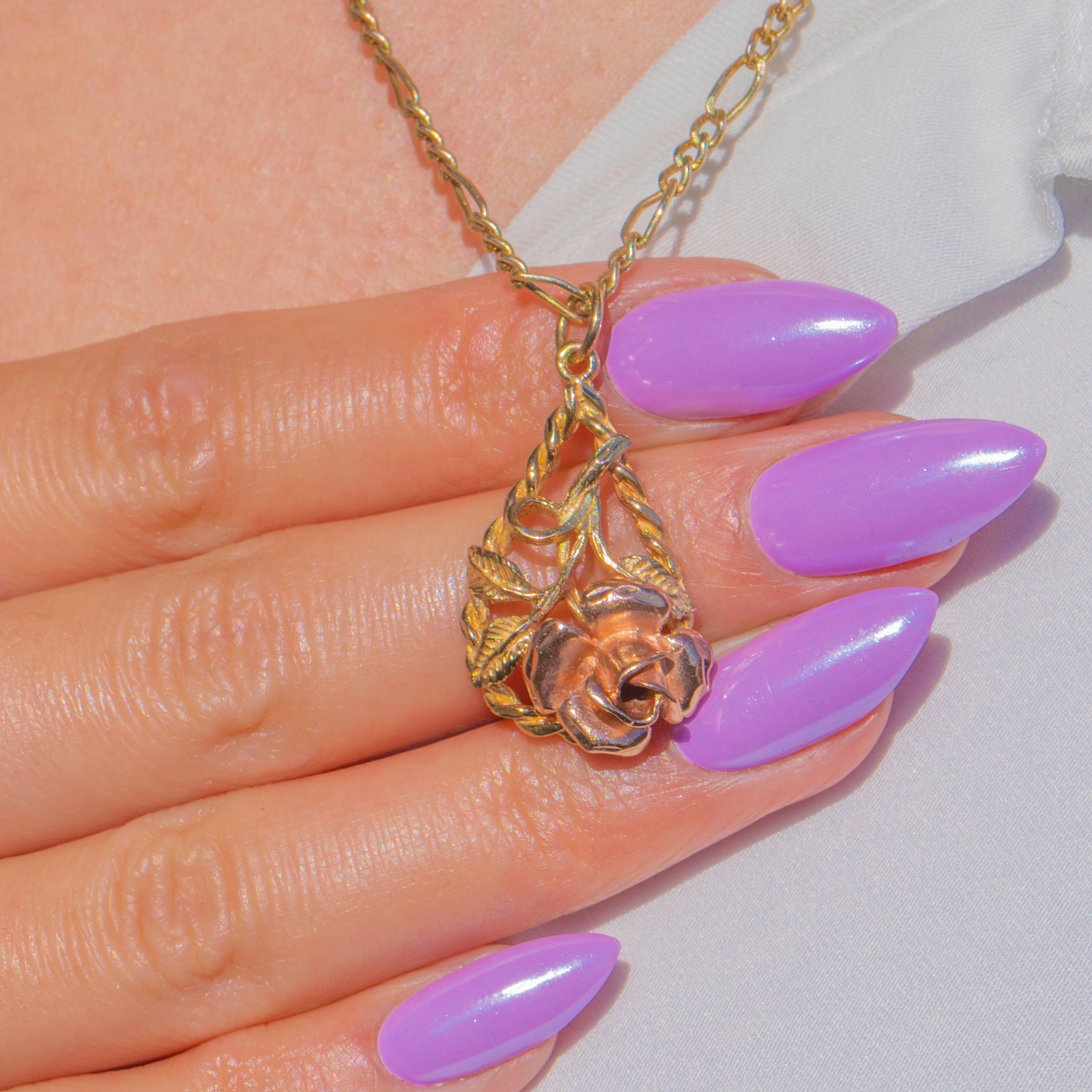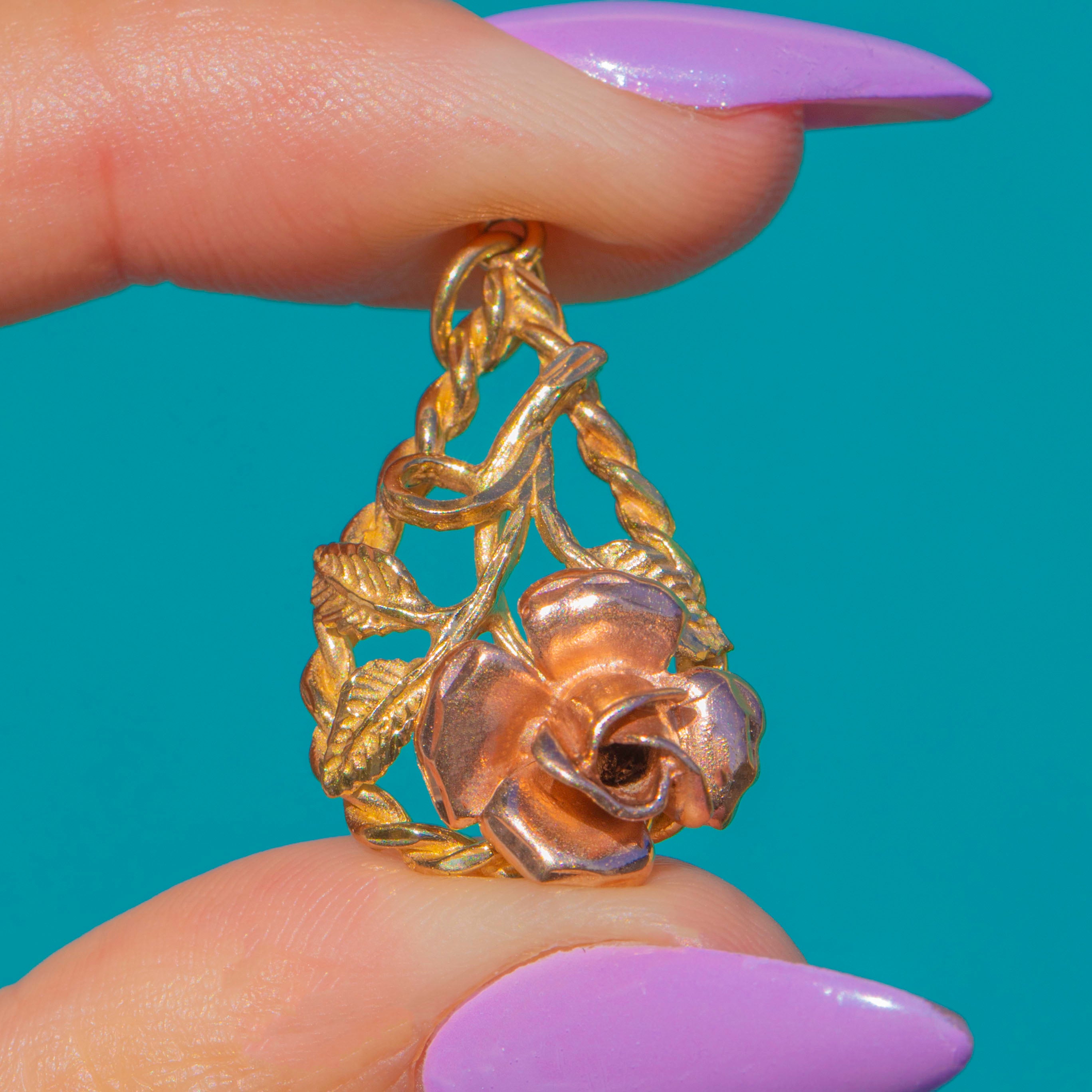 Romance in full bloom, this sculptural rose pendant is rendered in two-tone 9ct Gold, pairing warm Rose Gold petals with a Yellow Gold twisted-rope teardrop frame. The blossom is beautifully modelled in high relief, with trailing stems and engraved leaves that lend graceful movement and depth.