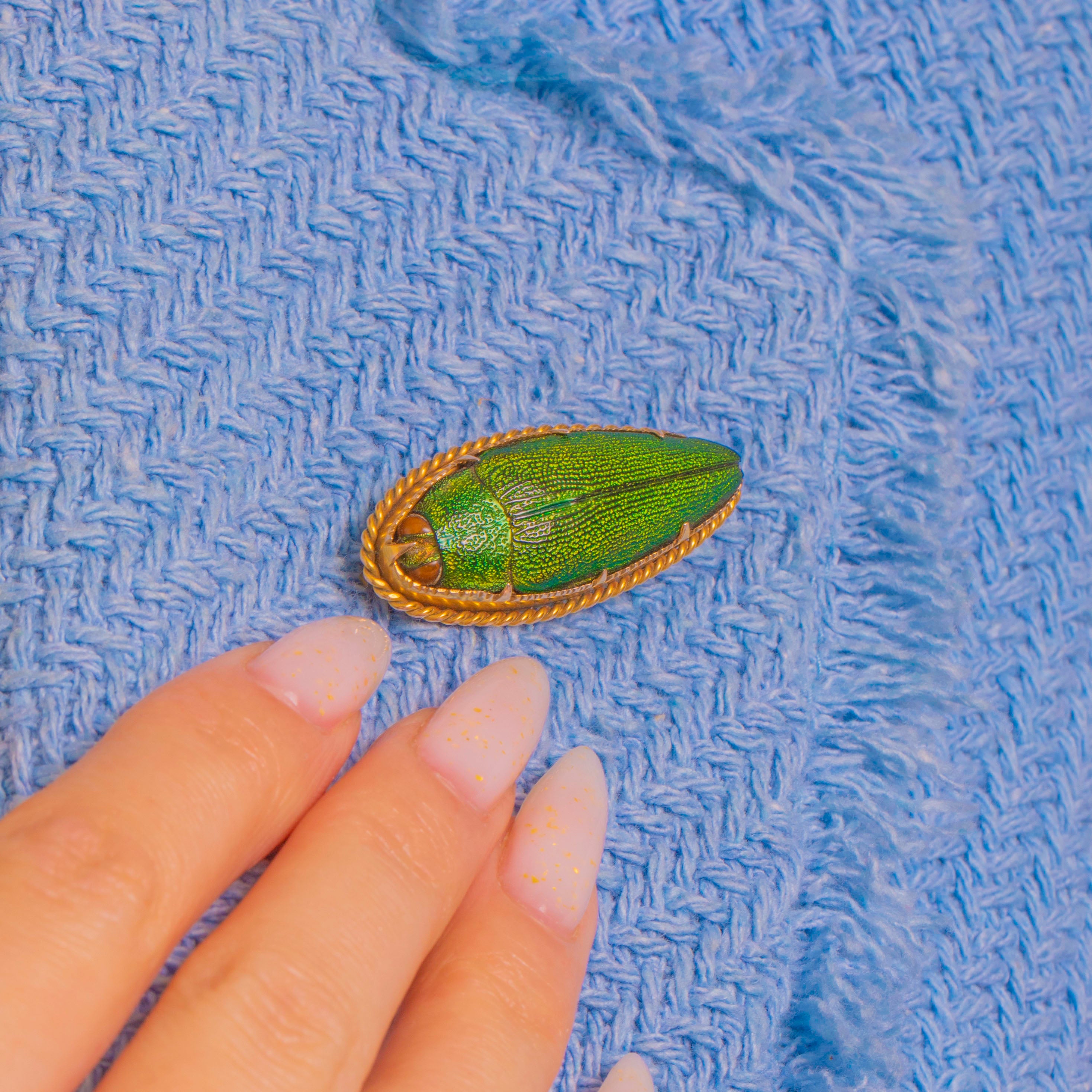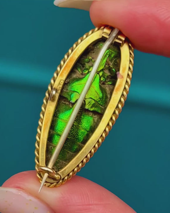 EXCELLENT: The elytron presents beautifully with a glossy surface and only minor edge nibbles and fine natural lines visible under close inspection. The 9ct Gold frame shows light, even patina with the rope‑twist border and recessed bezel crisp and secure; the pin, hinge and C‑clasp are strong and function well. The pin stem is a contrasting white‑metal tone to the mount, which may indicate a replacement at some point, and there is some trapped dust in the open recess, none of which affects wear.